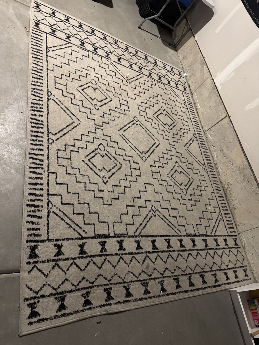 ApplePayTwo large rugs, both need to be cleaned. The black/brown jute rug is in quite a bit better shape overall compared to the other. The light beige and black larger rug just needs to be shampooed.