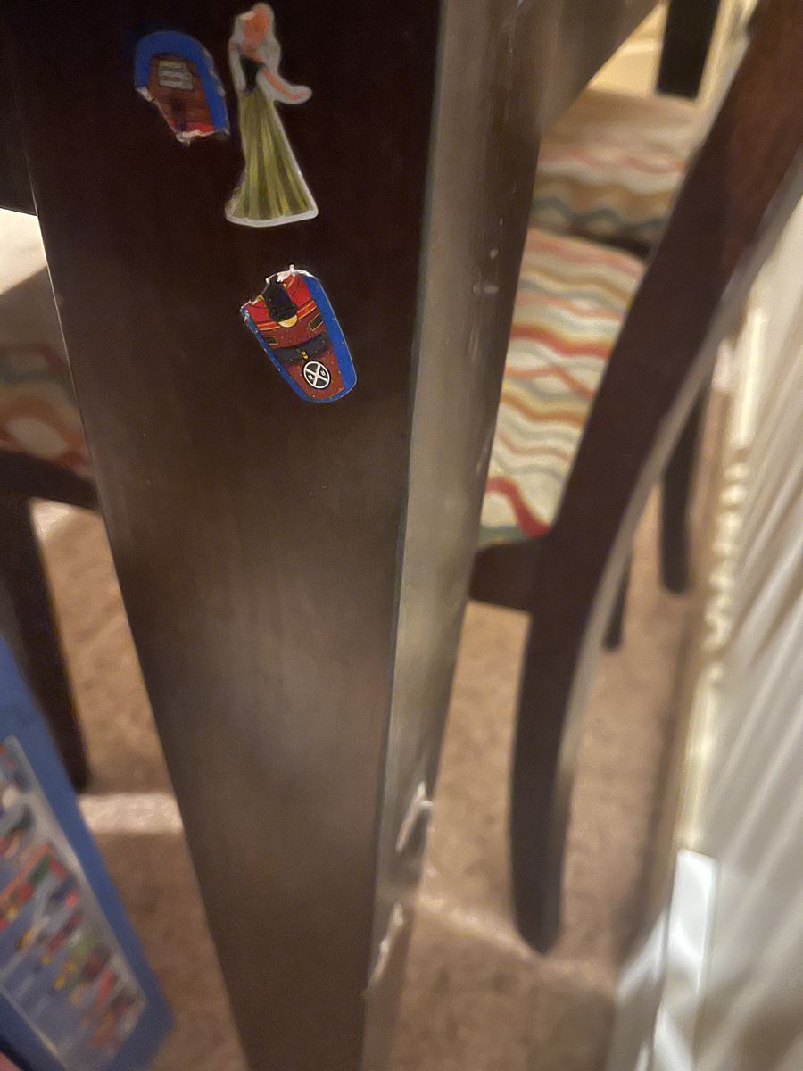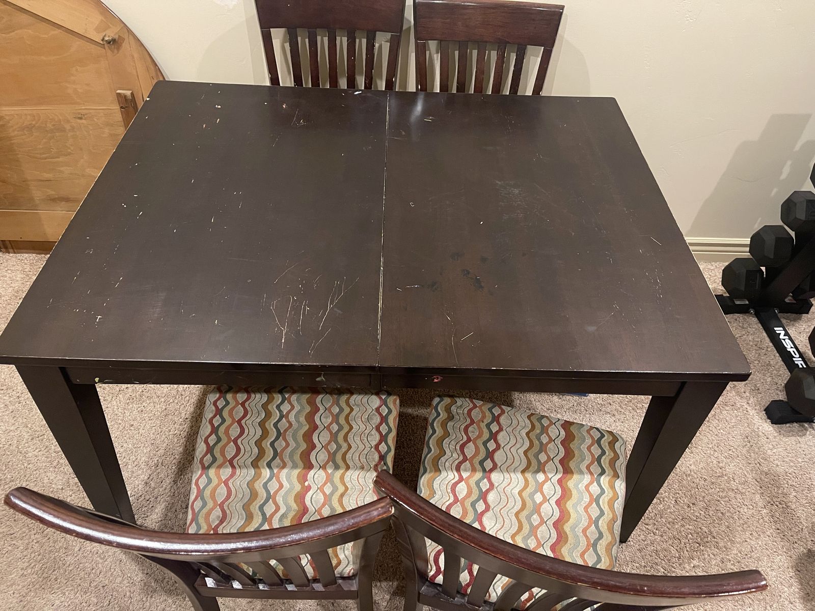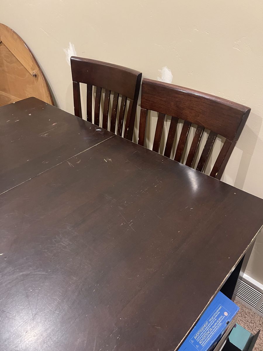PayPalThis table has been well-loved (see scratches, paint, stickers and band-aids…) but is sturdy…it’s way heavier than it looks because of the butterfly leaf in the middle. The chairs have been recovered and could be again.
