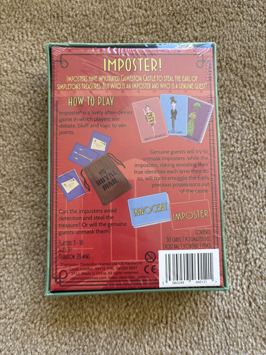 NEW (sealed in plastic) Imposter!: The after-dinner mystery game. 3-16 players, ages 8+. Clarendon Games, 2019. New, unopened condition. Text only. Cash or Venmo. Discount on multiple items.