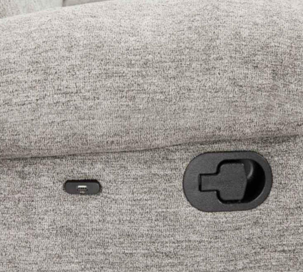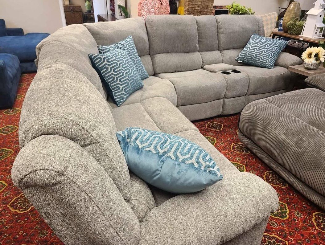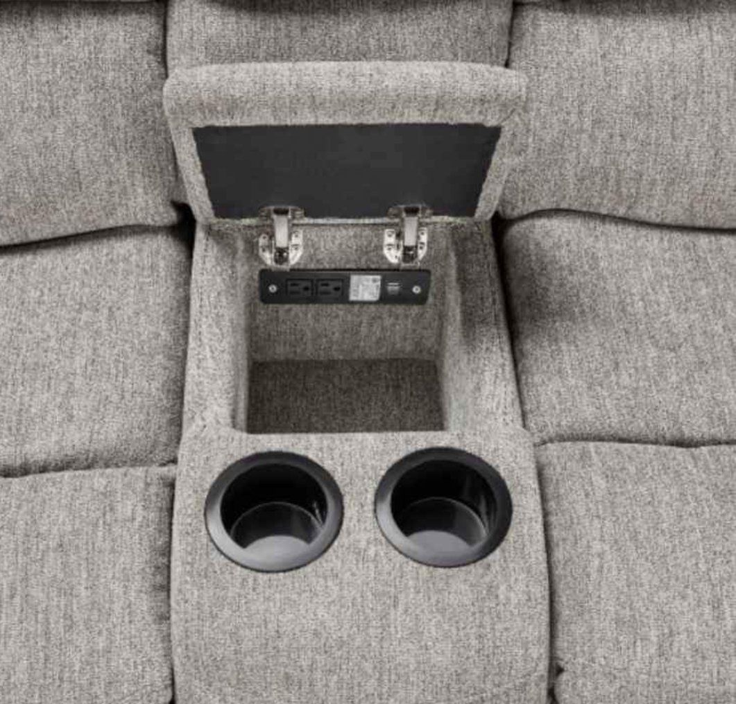 Beautiful 3-Piece sectional in soft gray fabric. Features three manual recliners. Spacious storage console with electric socket and dual USB charging ports, and two cup holders. End also feature USB ports. Very comfortable and in great condition! Measures 110"x98" Located in Layton.