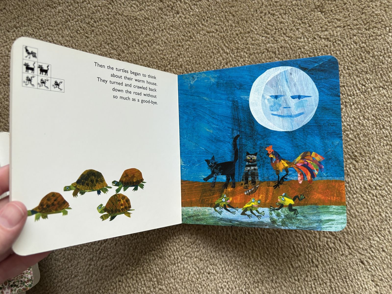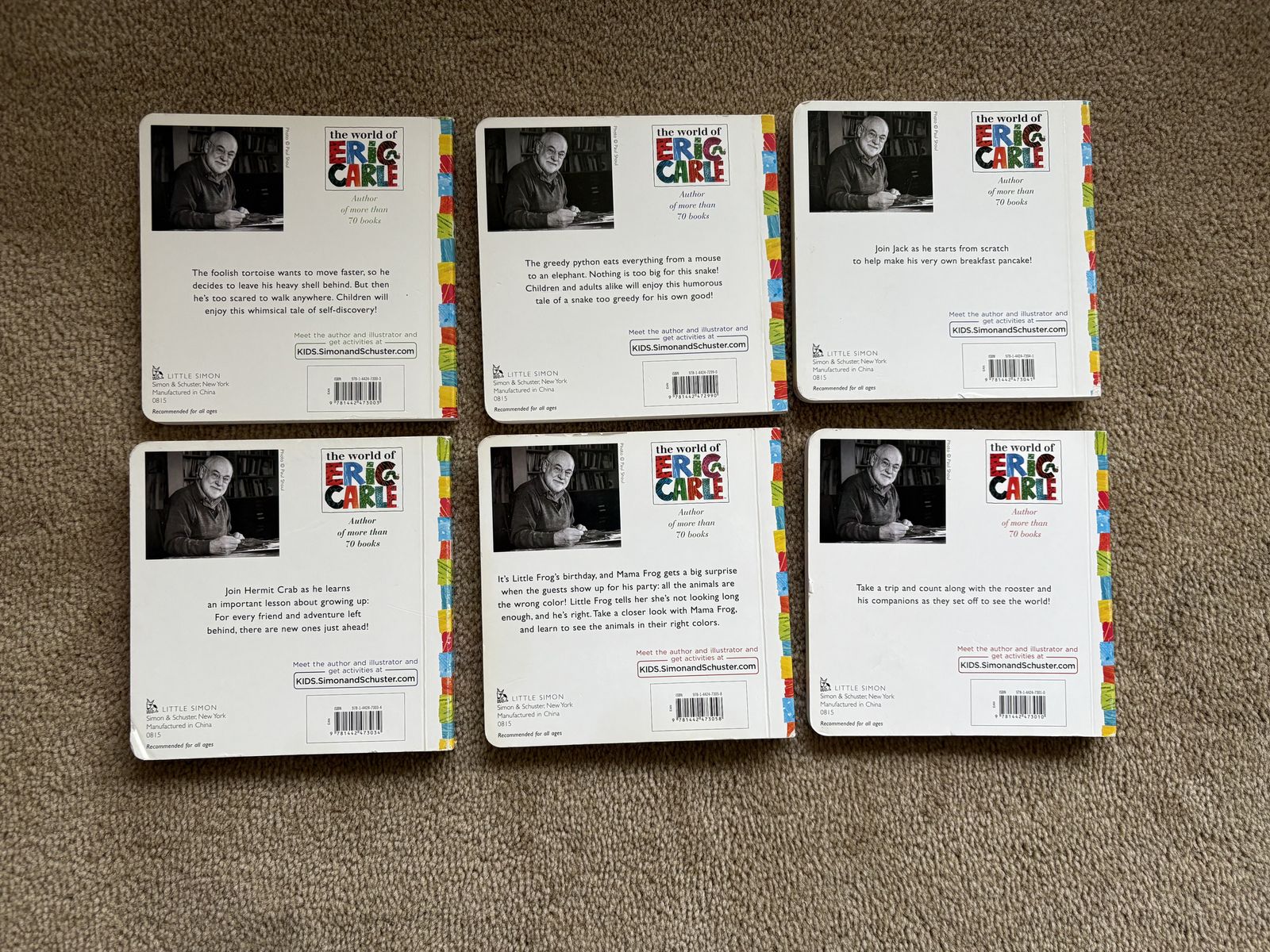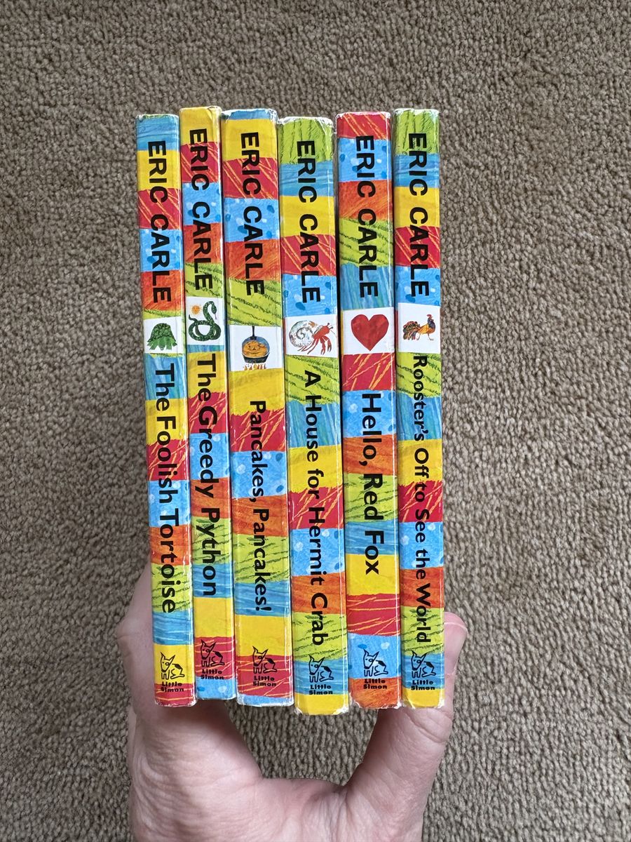 Six Eric Carle Board Books: Rooster’s Off to See the World; Hello, Red Fox; A House for Hermit Crab; Pancakes, Pancakes!; The Greedy Python; and The Foolish Tortoise. 5.5” x 5.5”. Simon & Schuster, 2013 editions. Very good condition. Text only. Cash or Venmo. Discount on multiple items.