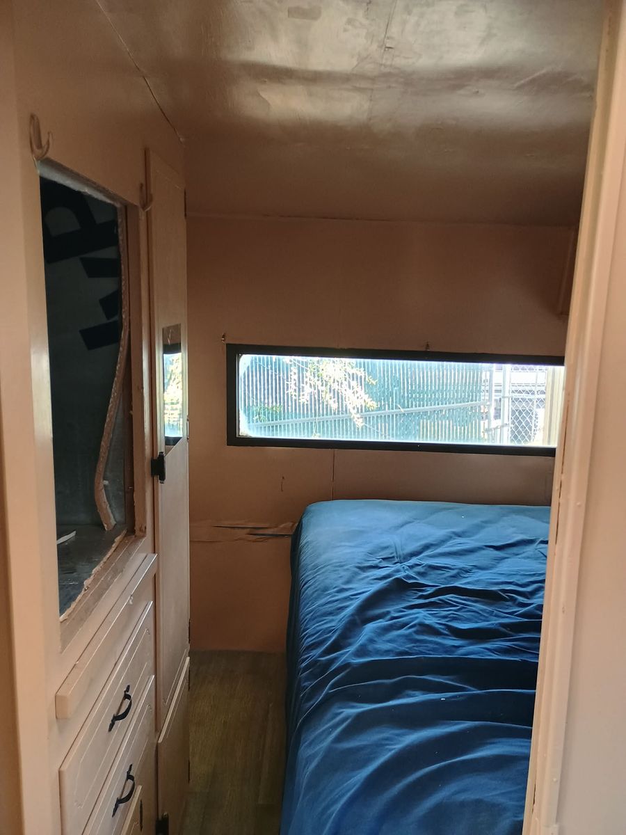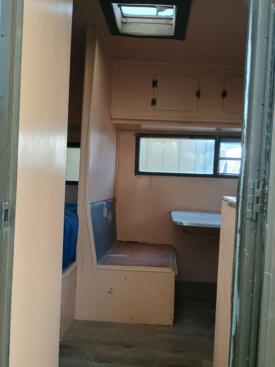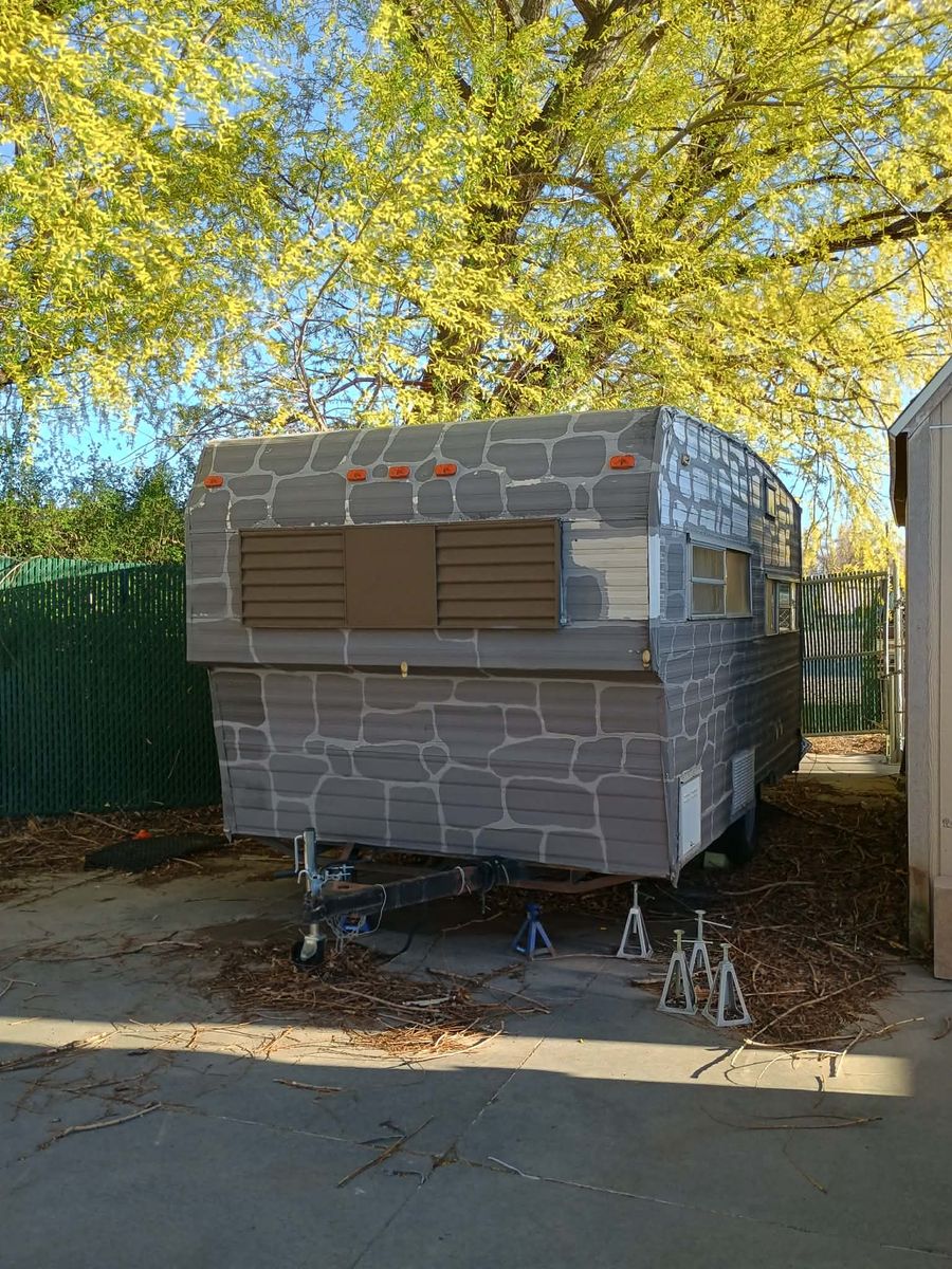 Venmo1969 14ft travel trailer (14ft trailer body + 3.5ft hitch). Could use a bit of work, but mostly just cosmetic. There is a crack in the ceiling panel, there was a leak, I fixed the leak, but used the wrong stuff to fix the panel inside, so it cracked. The leak may also be back, I don't know, haven't used this thing in over a year.