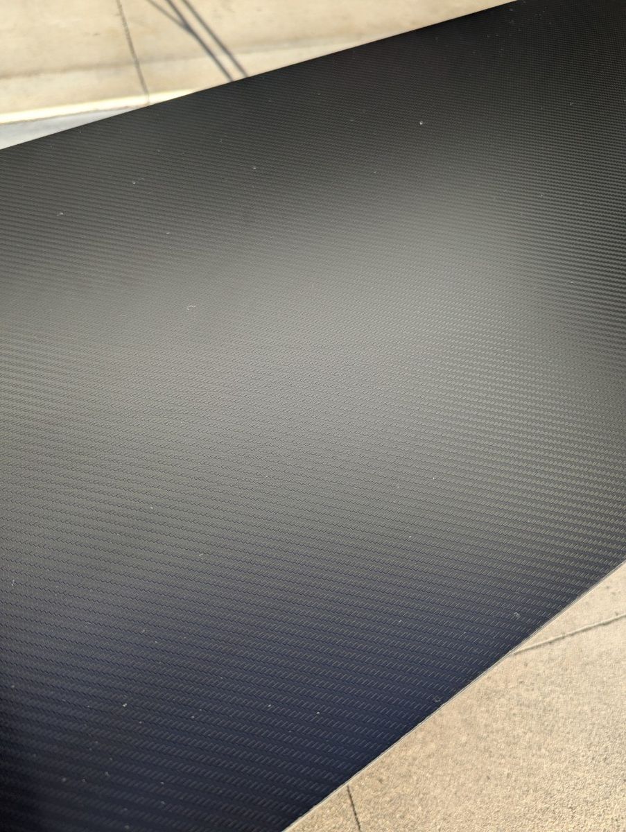 VenmoBestier desk with raised monitor shelf and built-in storage tower. New. Black carbon fiber-textured laminate surface on a black metal frame — no scratches or damage.