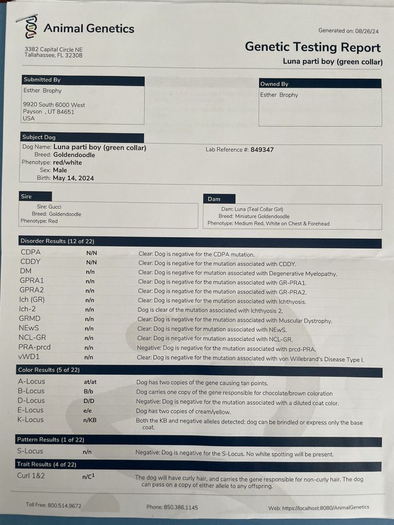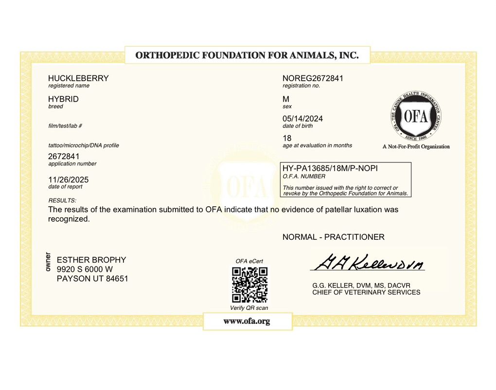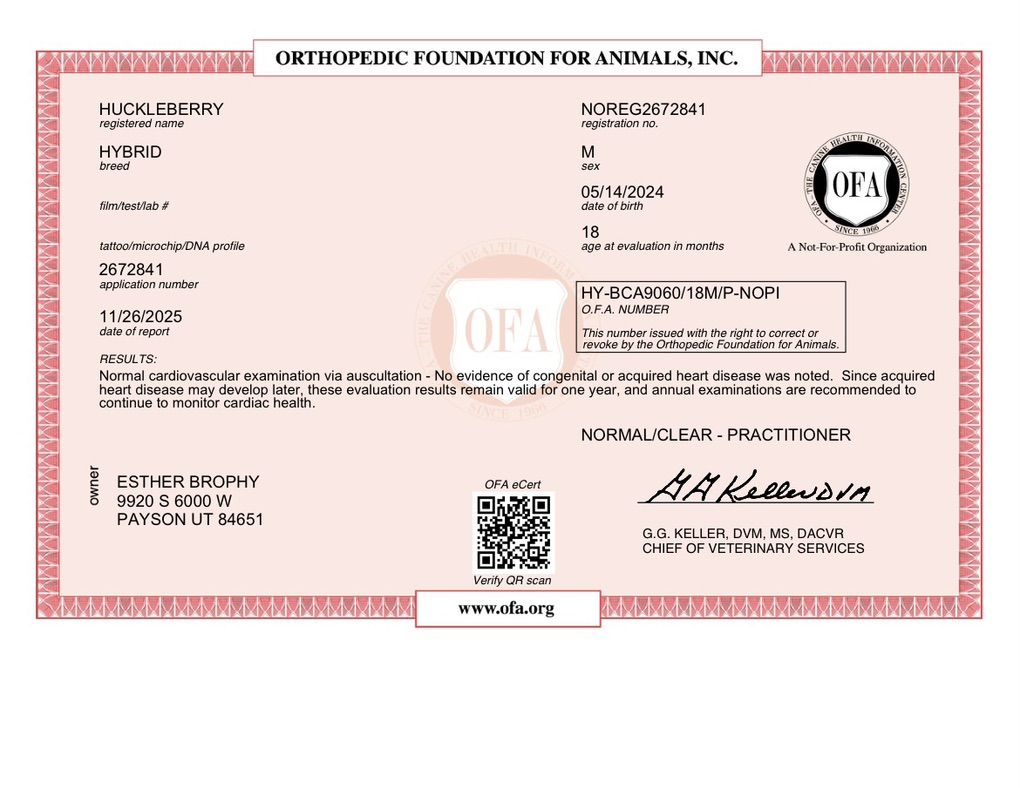 Health testing: DM—clear GPRA1 &2–clear Ich—clear GRMD—clear NCL-GR—clear NEws—clear PRA-prcd—clear VWD1–clear CDPA—clear CDDY— clear