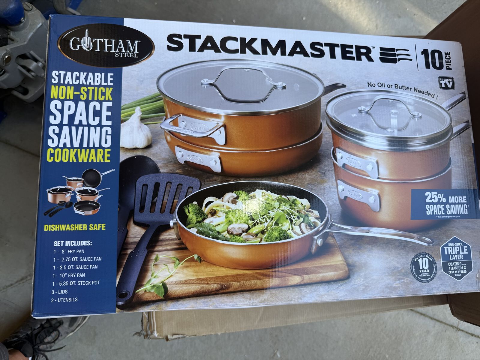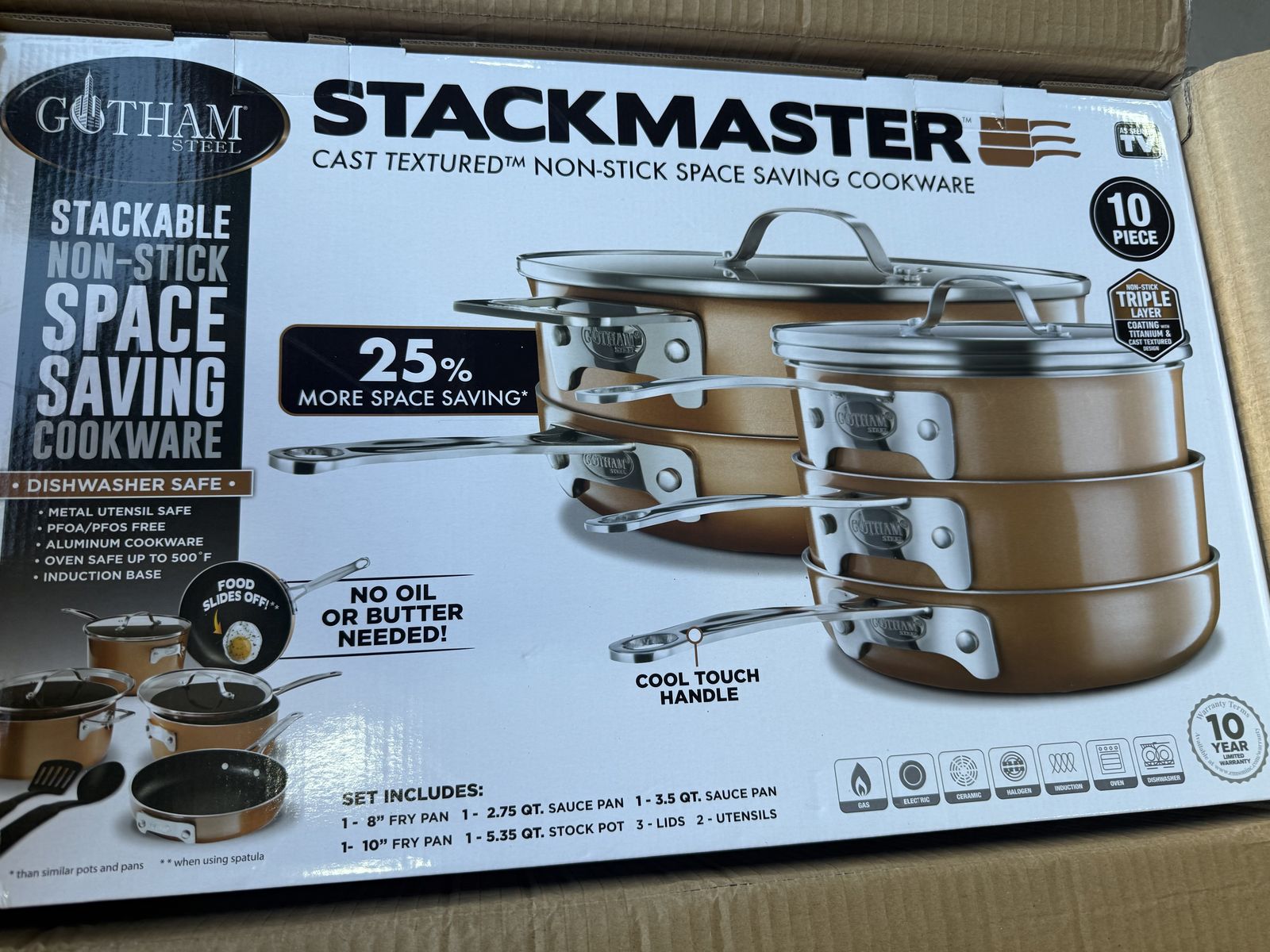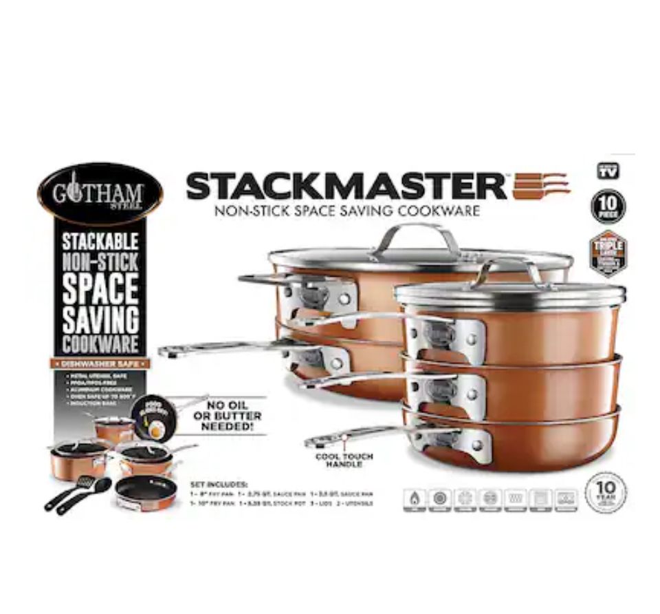 Gotham Steel Stackable Stackmaster Non Stick 10pc set gives you the best of both worlds-the perfect sear with the cast textured coating and non stick making it easy clean up! Save space in your kitchen and revolutionize the way you cook with the Gotham Steel Stackable Pots and Pans Set. Our uniquely designed cookware lets you easily stack and nest pots and pans – saving you 30% space in your kitchen and opening up precious cabinet space. This cookware set is triple coated with our ultra-nonstick cast-texture coating which doesn’t need to be pre-seasoned, ensures the ultimate release, is durable to withstand metal utensils and is dishwasher safe!