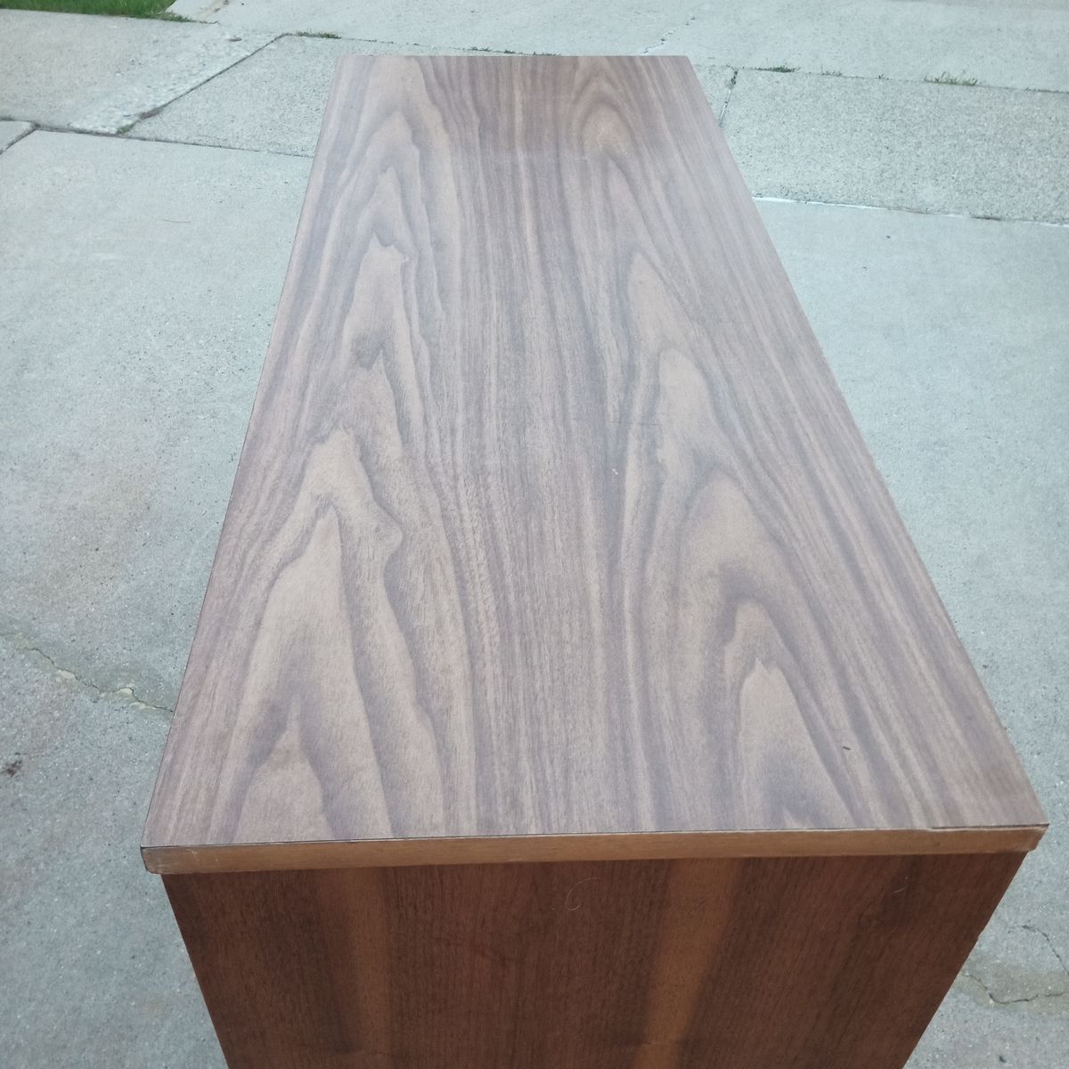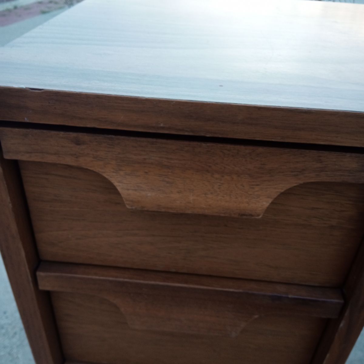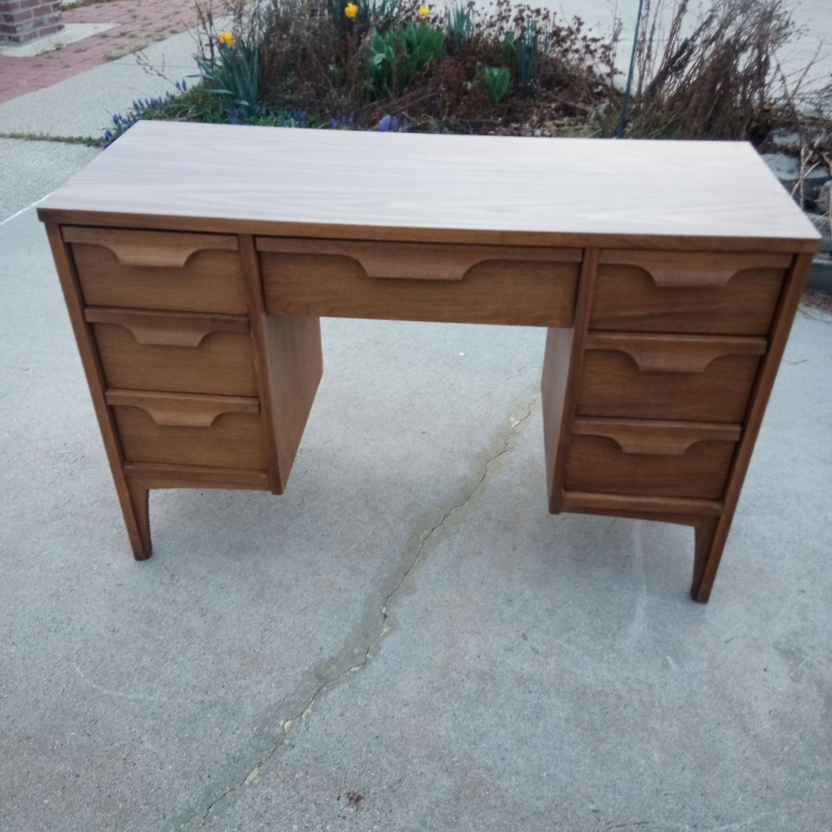 Mid century desk from the 1960s made by Johnson Carper with sculpted drawer handles, a walnut fame and formica top