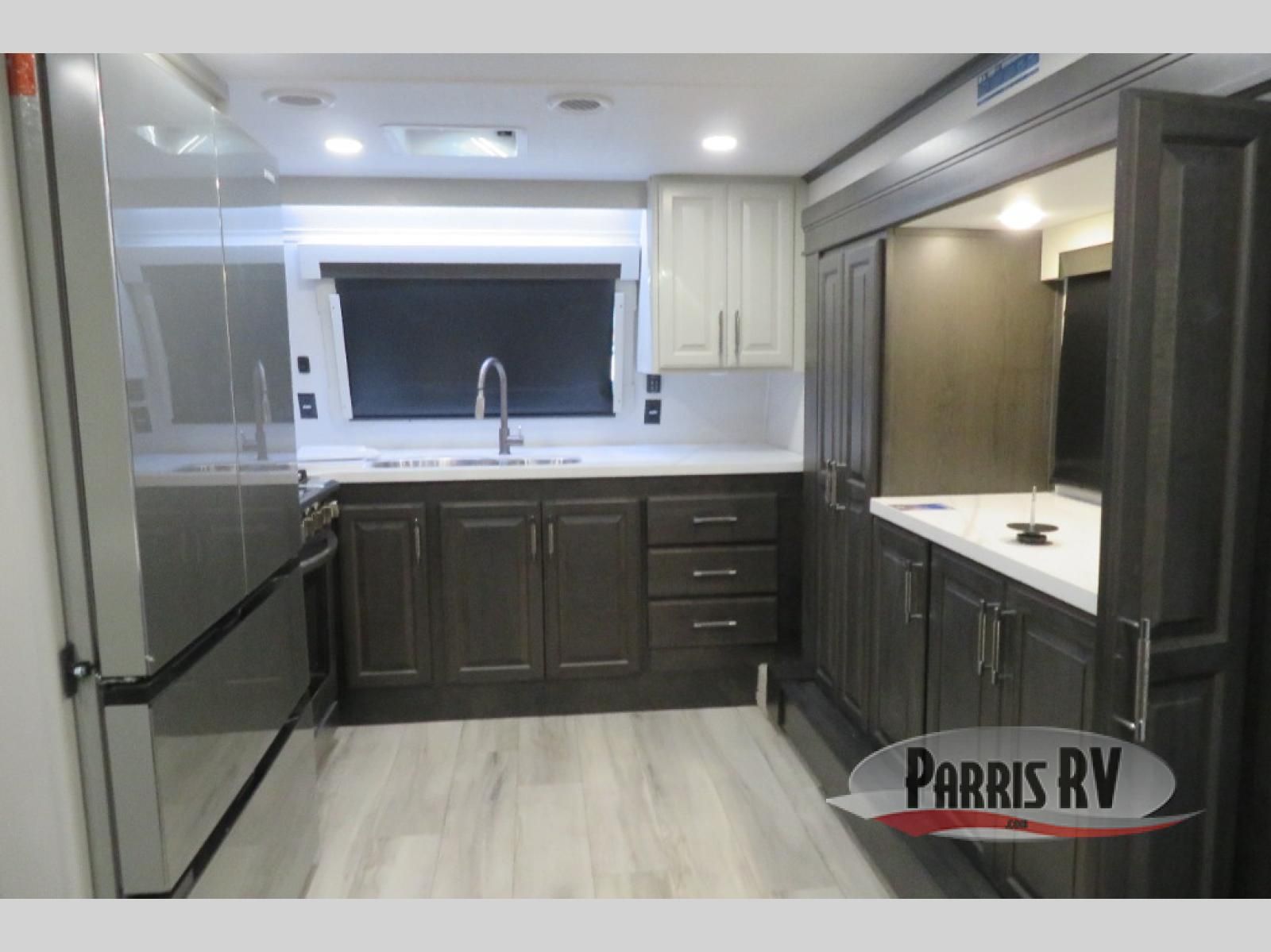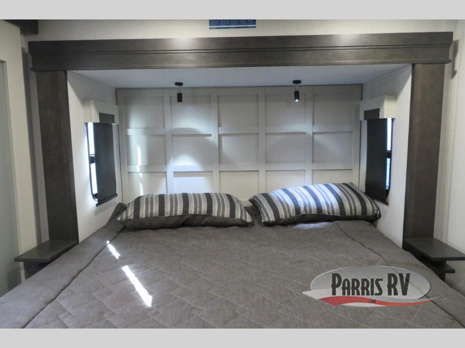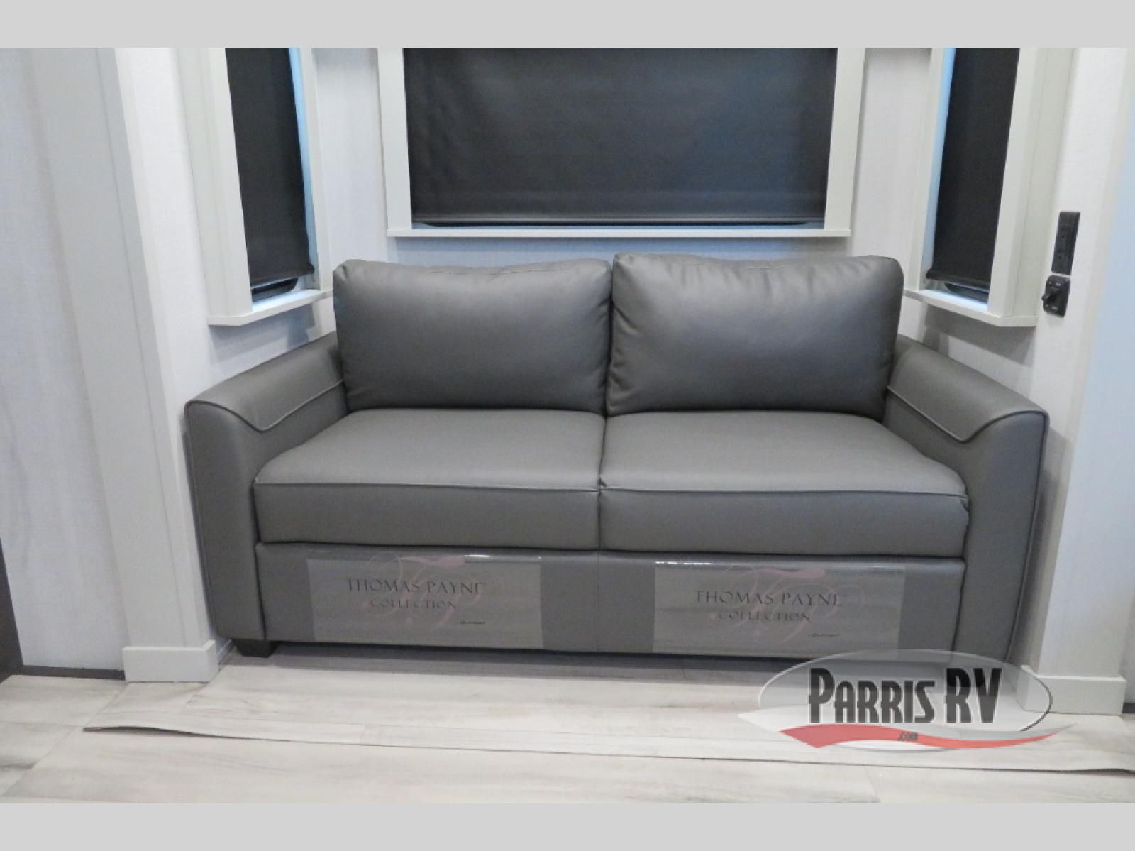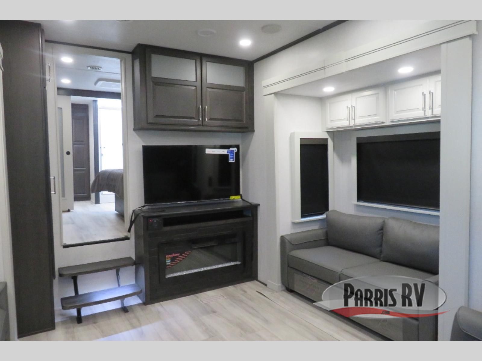 This fifth wheel is decked out in luxuries! The full rear bathroom has a walk-in shower to freshen up in each morning, a dual sink vanity for two to get ready at once, plus washer and dryer prep. You will enjoy a good night's rest on the king bed slide inside the private bedroom and others can sleep on the opposing tri-fold sofa sleeper slides in the living room. There is also a theater seating here, along with a fireplace and 50" LED TV for movie nights. The front kitchen is where it's really at in this fifth wheel; ample counter space, a bar top with stools, pull-out drawers, plus a pantry and closet for even more storage!