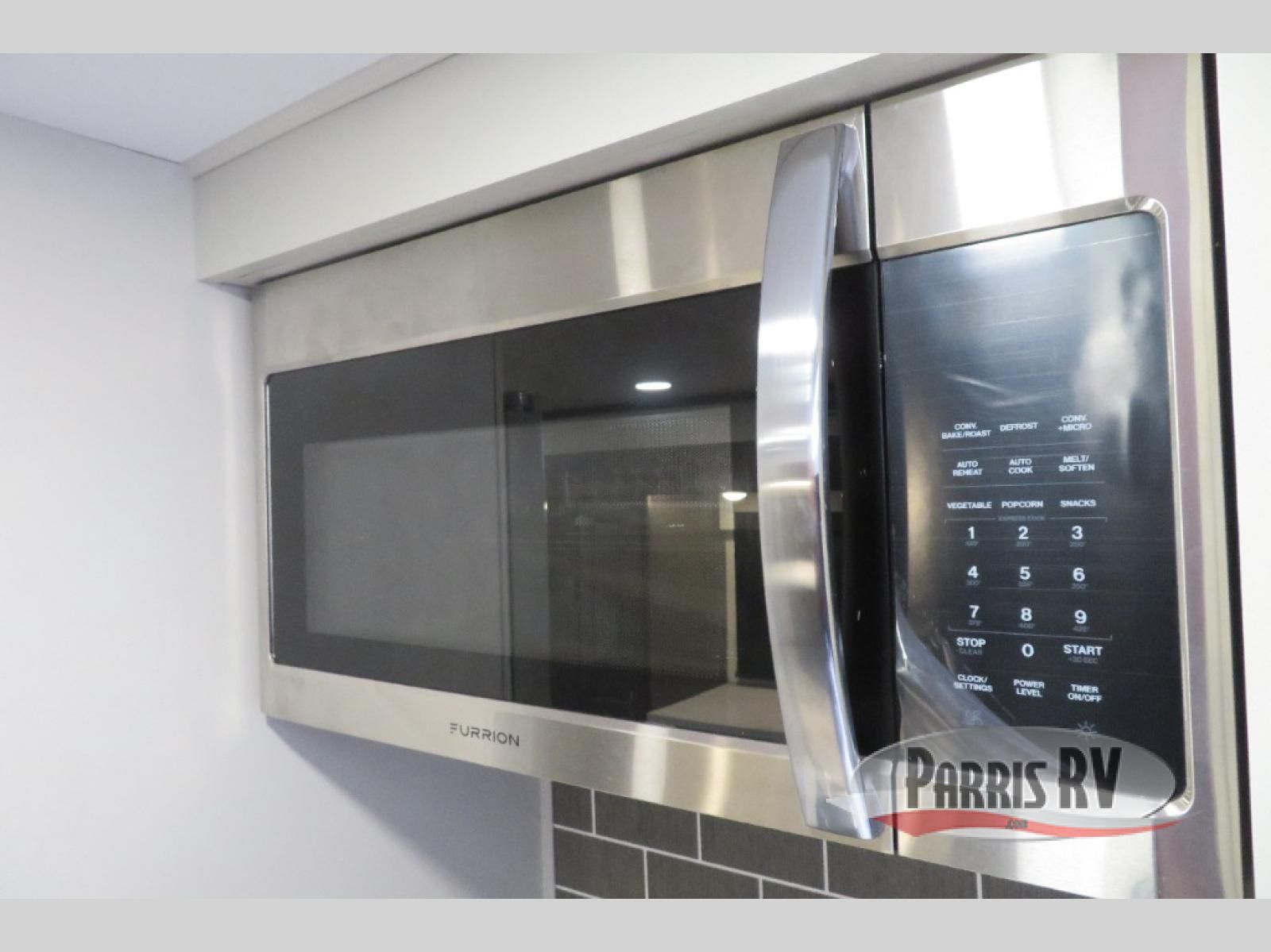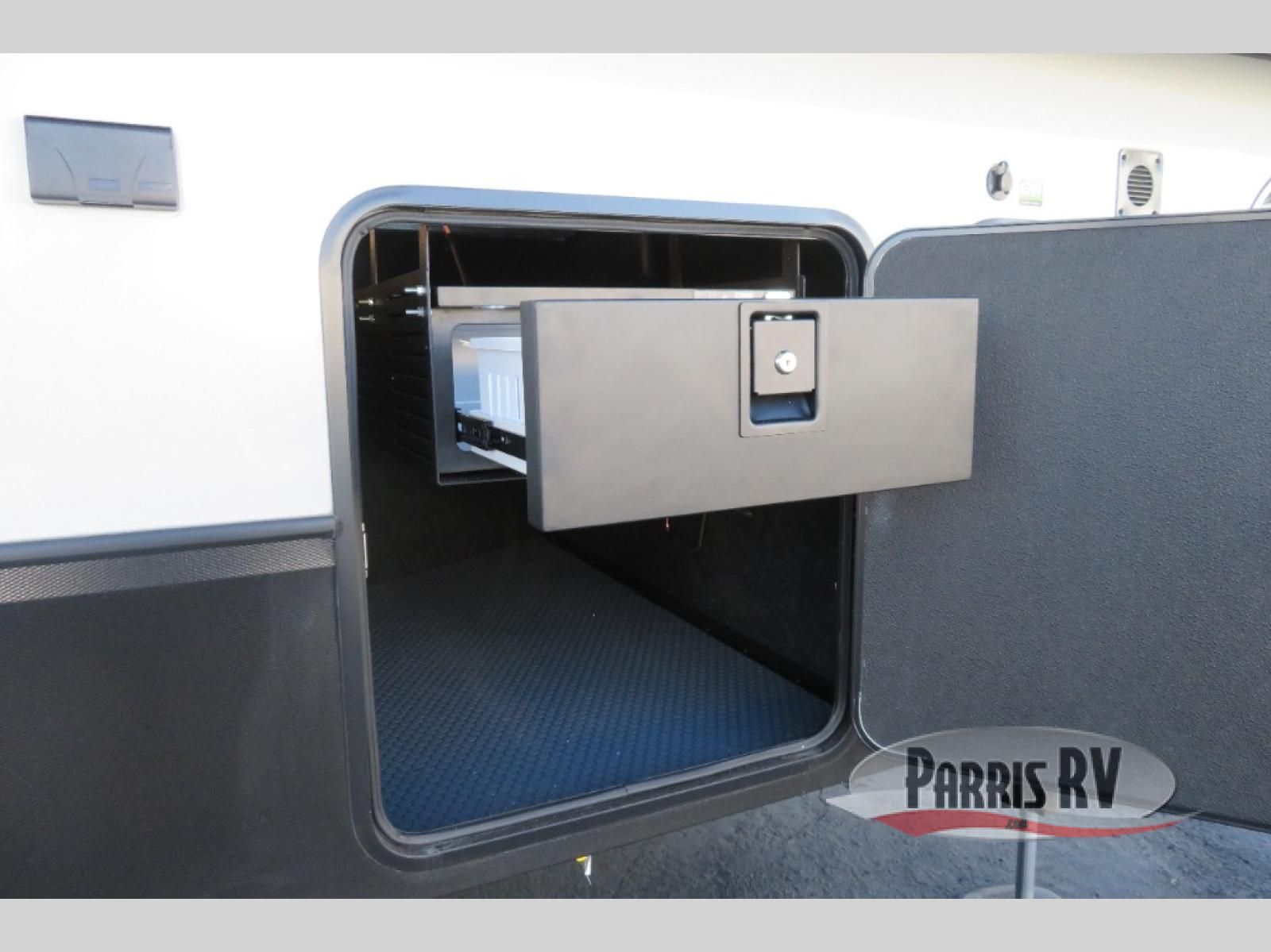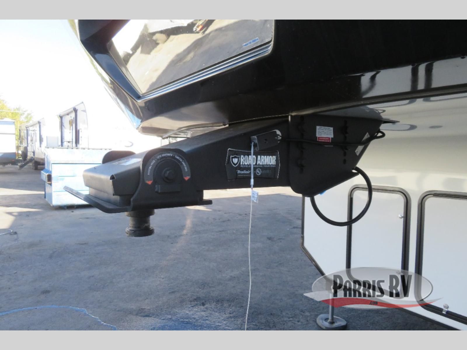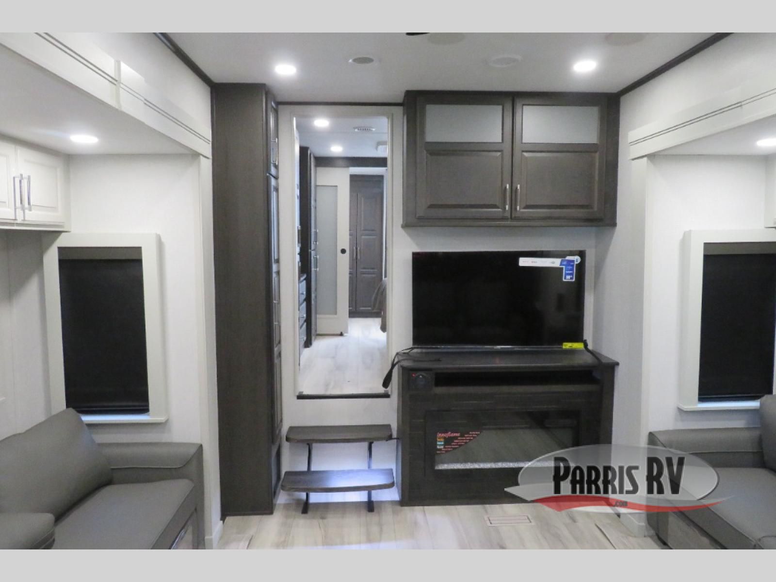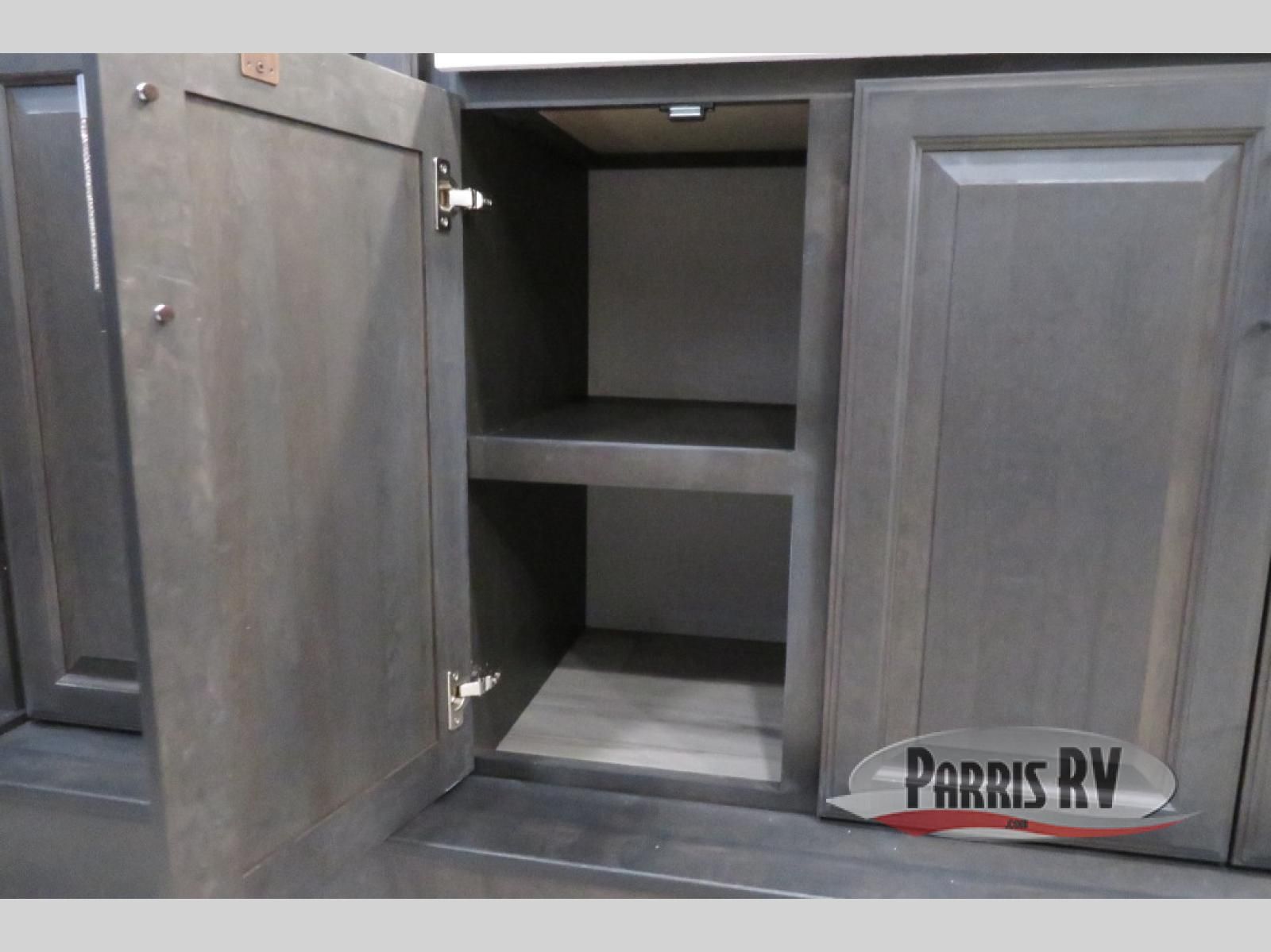 This fifth wheel is decked out in luxuries! The full rear bathroom has a walk-in shower to freshen up in each morning, a dual sink vanity for two to get ready at once, plus washer and dryer prep. You will enjoy a good night's rest on the king bed slide inside the private bedroom and others can sleep on the opposing tri-fold sofa sleeper slides in the living room. There is also a theater seating here, along with a fireplace and 50" LED TV for movie nights. The front kitchen is where it's really at in this fifth wheel; ample counter space, a bar top with stools, pull-out drawers, plus a pantry and closet for even more storage!