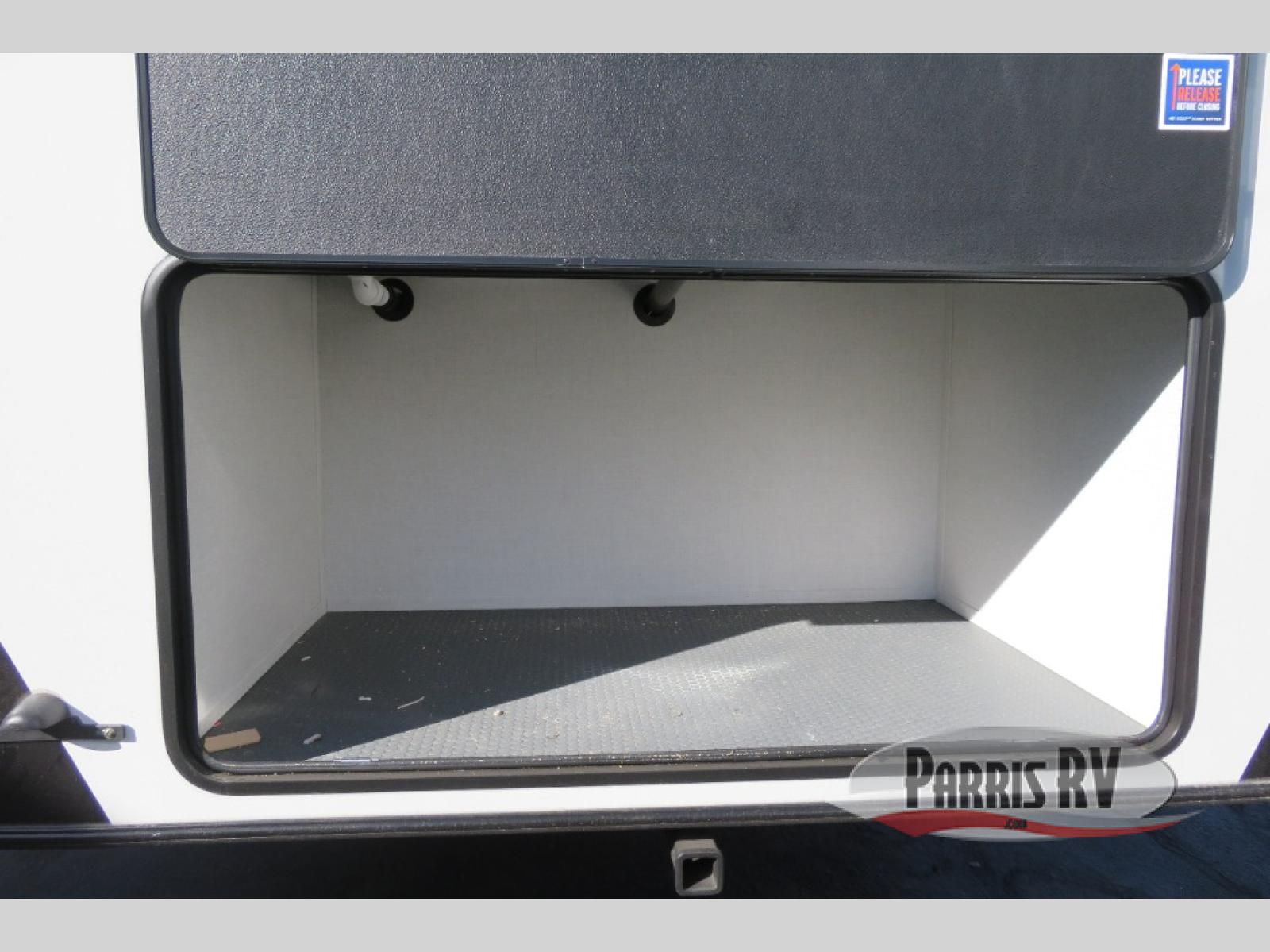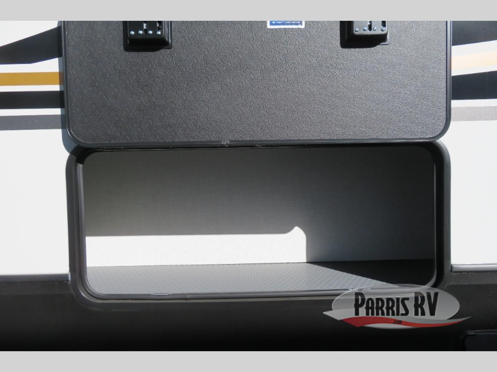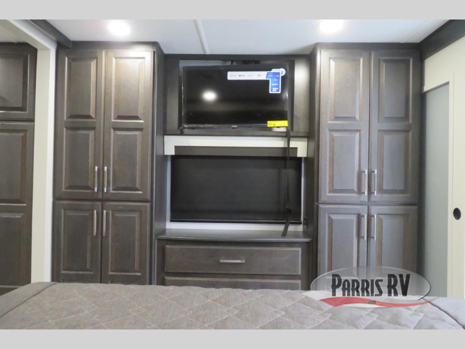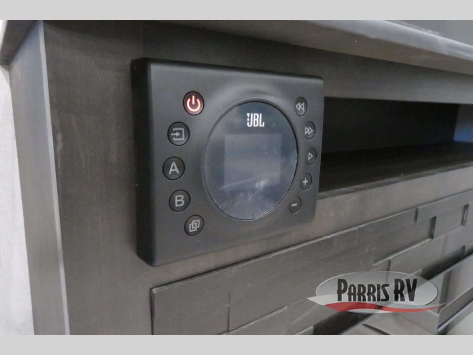 This fifth wheel is decked out in luxuries! The full rear bathroom has a walk-in shower to freshen up in each morning, a dual sink vanity for two to get ready at once, plus washer and dryer prep. You will enjoy a good night's rest on the king bed slide inside the private bedroom and others can sleep on the opposing tri-fold sofa sleeper slides in the living room. There is also a theater seating here, along with a fireplace and 50" LED TV for movie nights. The front kitchen is where it's really at in this fifth wheel; ample counter space, a bar top with stools, pull-out drawers, plus a pantry and closet for even more storage!