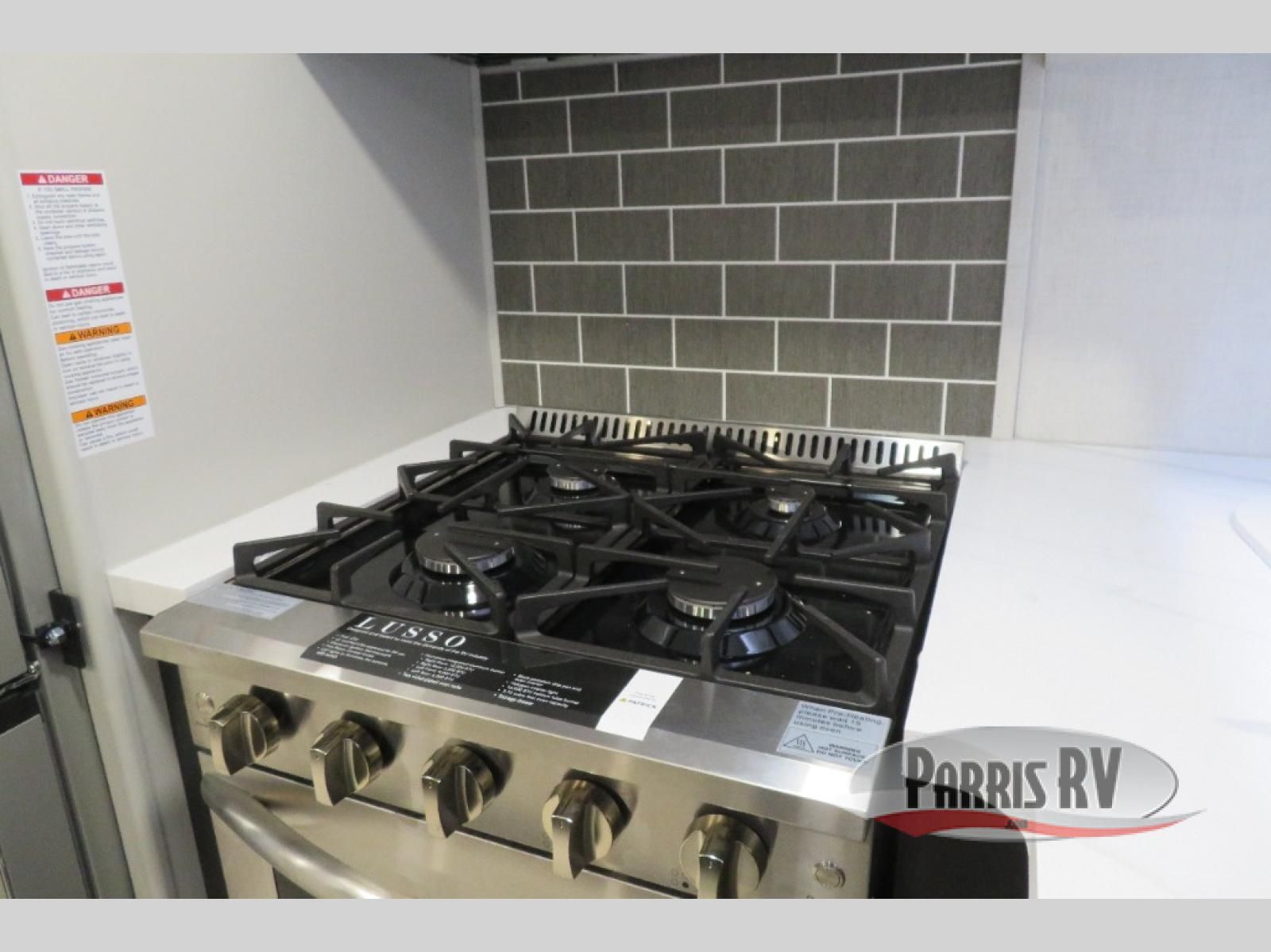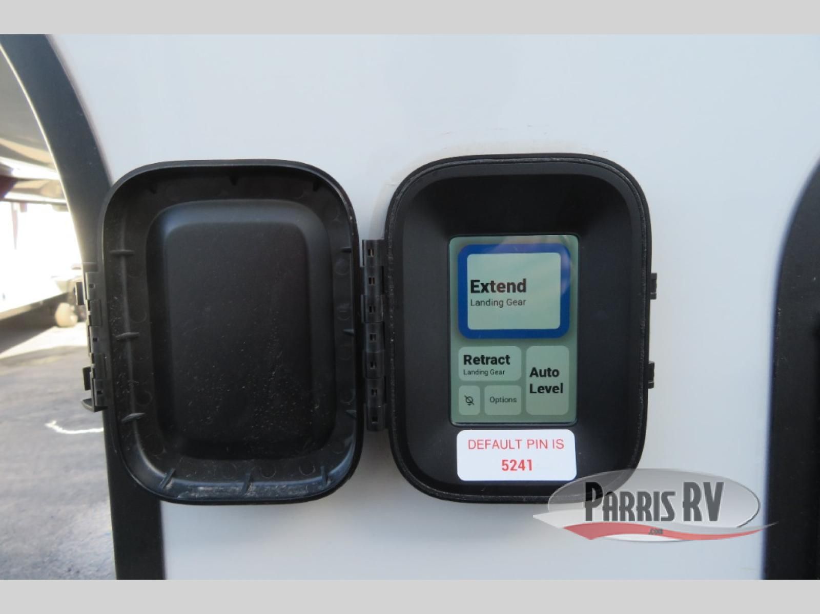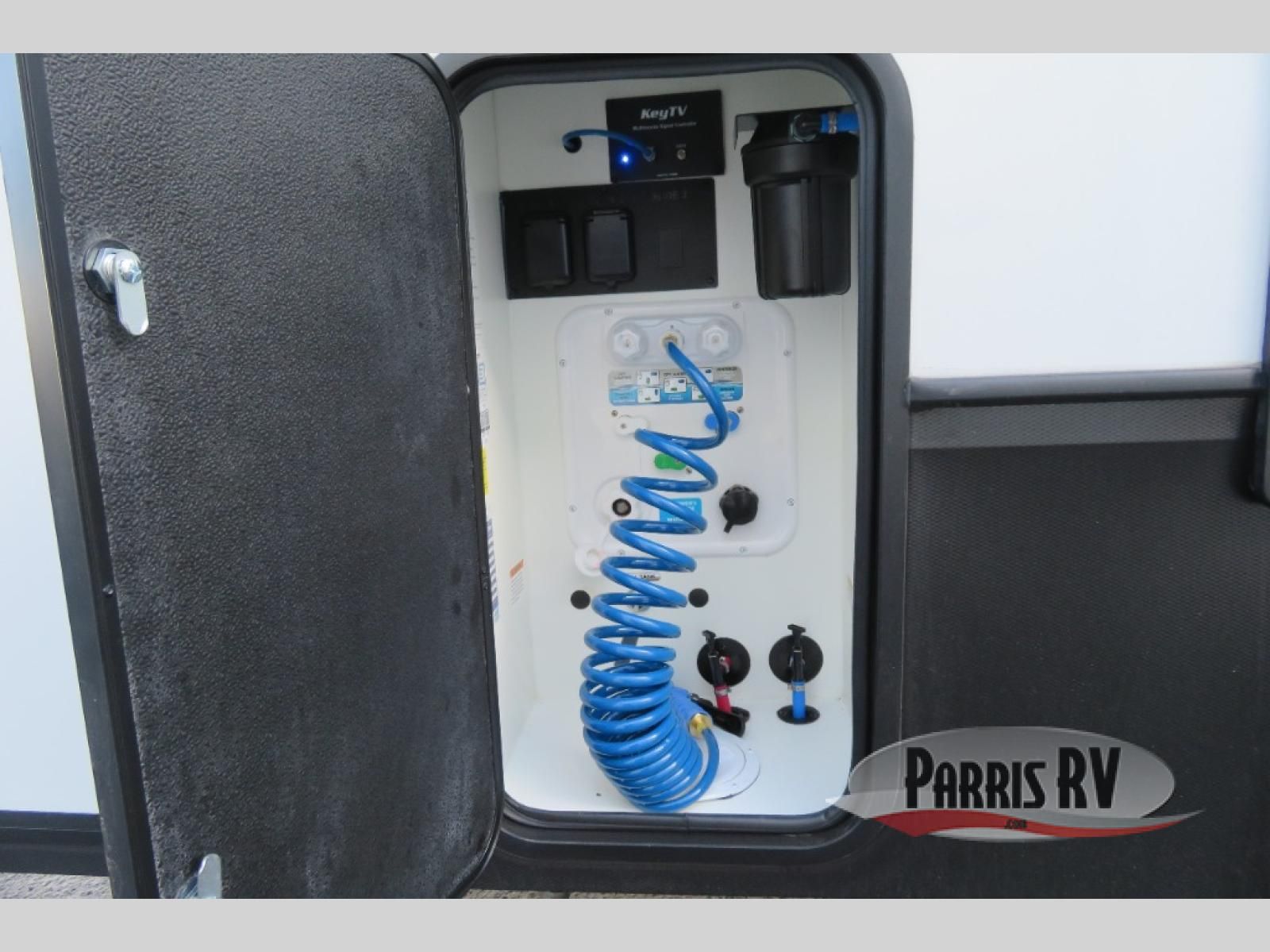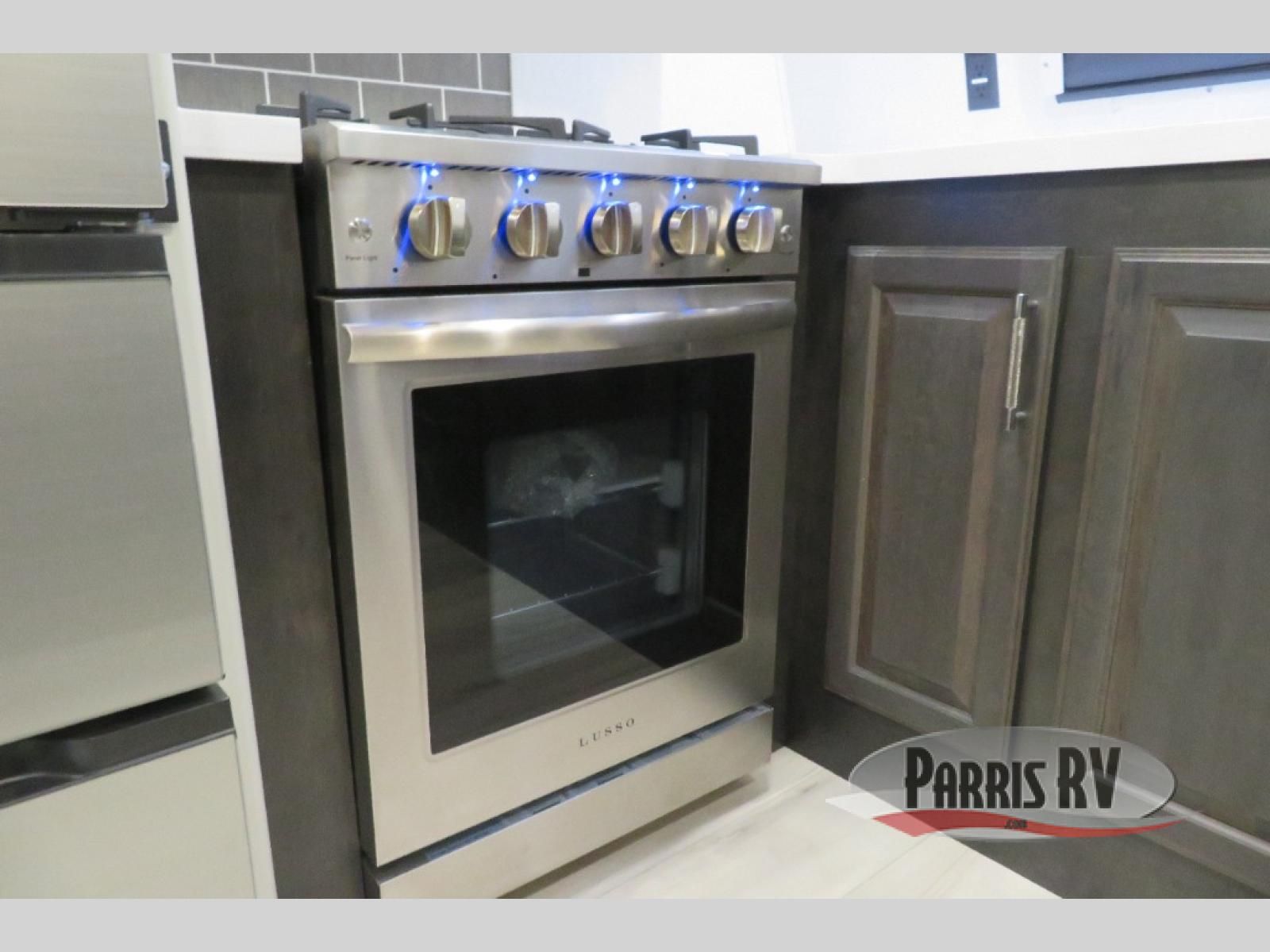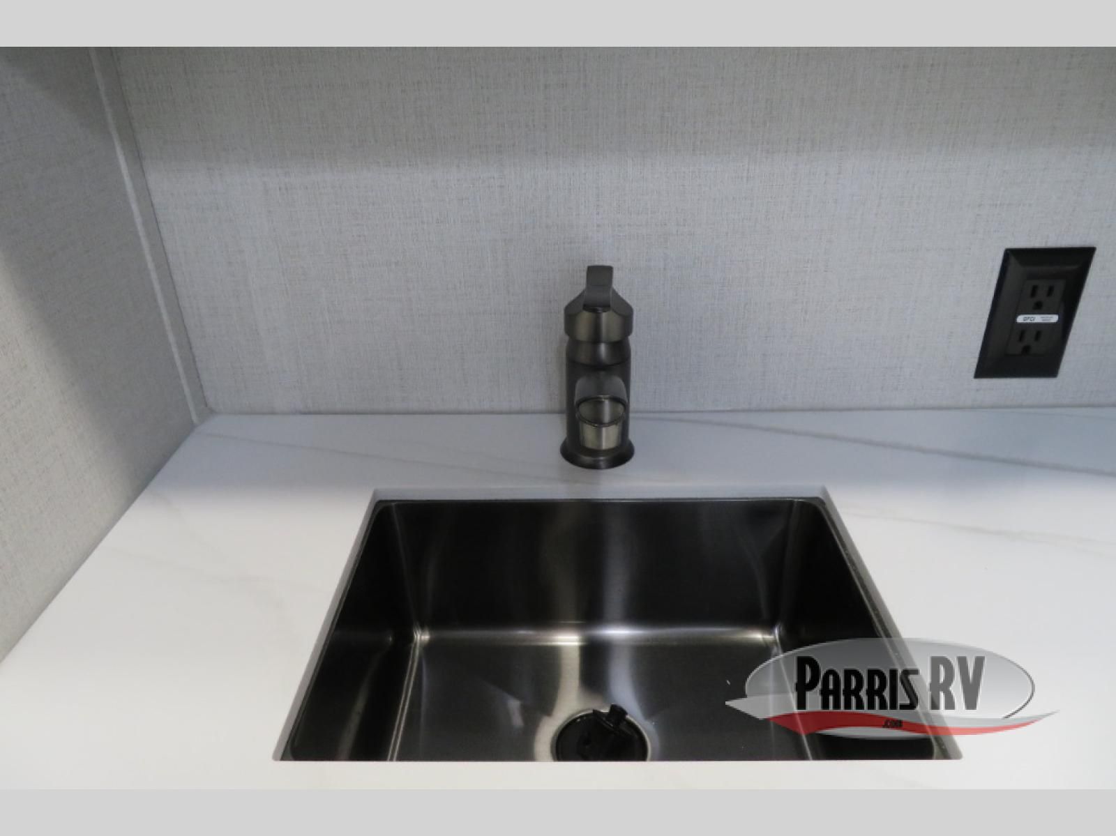 This fifth wheel is decked out in luxuries! The full rear bathroom has a walk-in shower to freshen up in each morning, a dual sink vanity for two to get ready at once, plus washer and dryer prep. You will enjoy a good night's rest on the king bed slide inside the private bedroom and others can sleep on the opposing tri-fold sofa sleeper slides in the living room. There is also a theater seating here, along with a fireplace and 50" LED TV for movie nights. The front kitchen is where it's really at in this fifth wheel; ample counter space, a bar top with stools, pull-out drawers, plus a pantry and closet for even more storage!