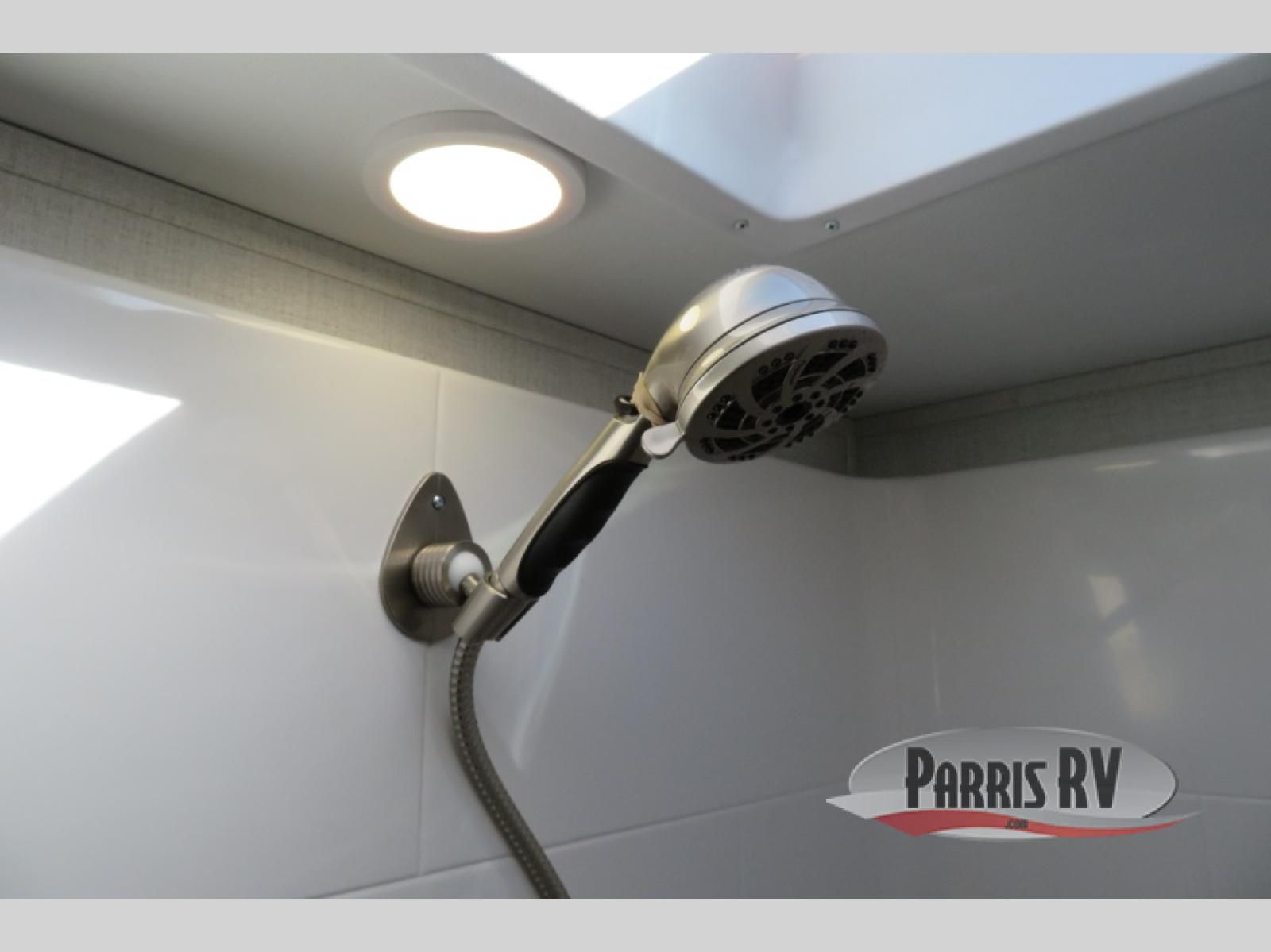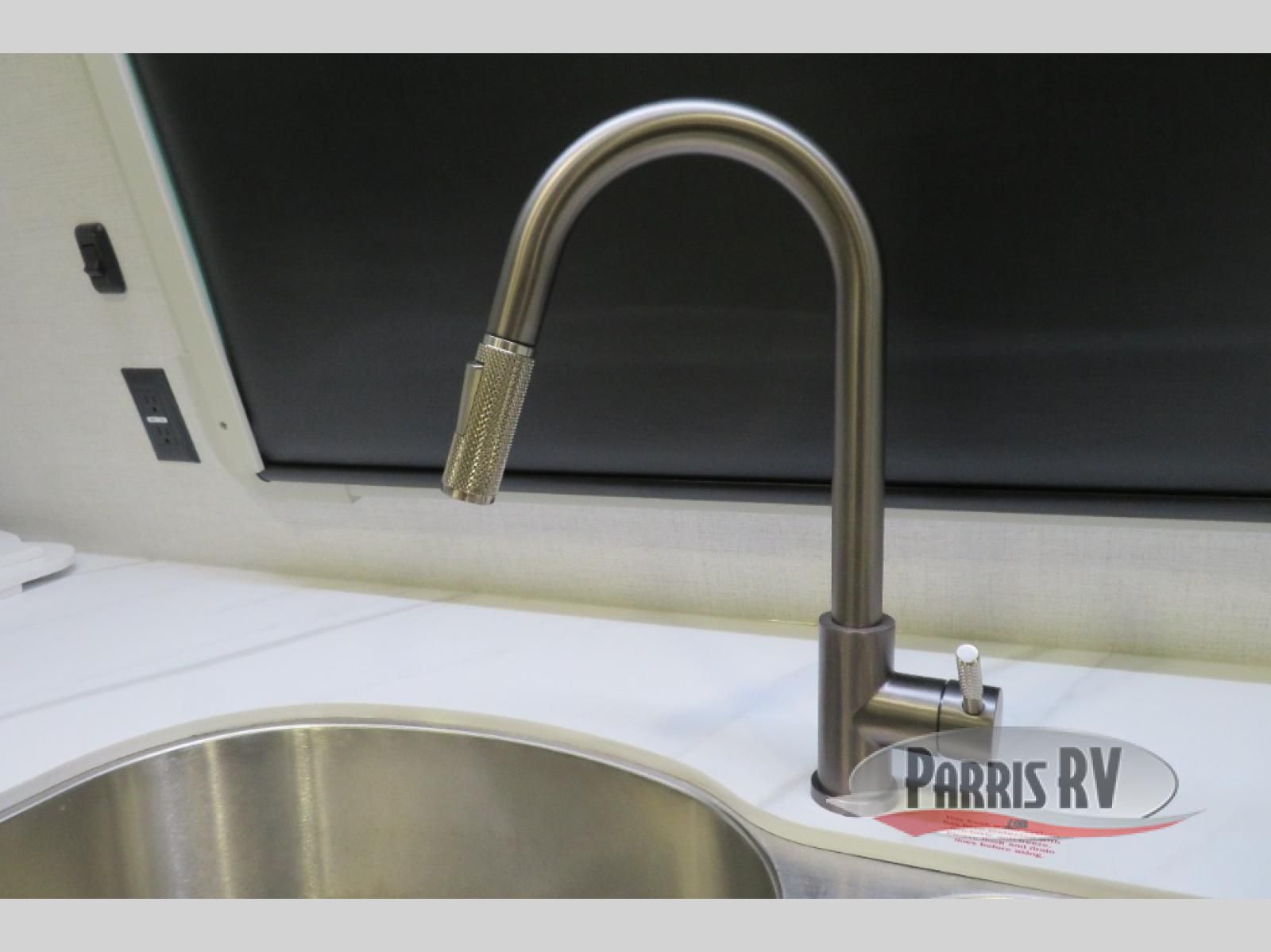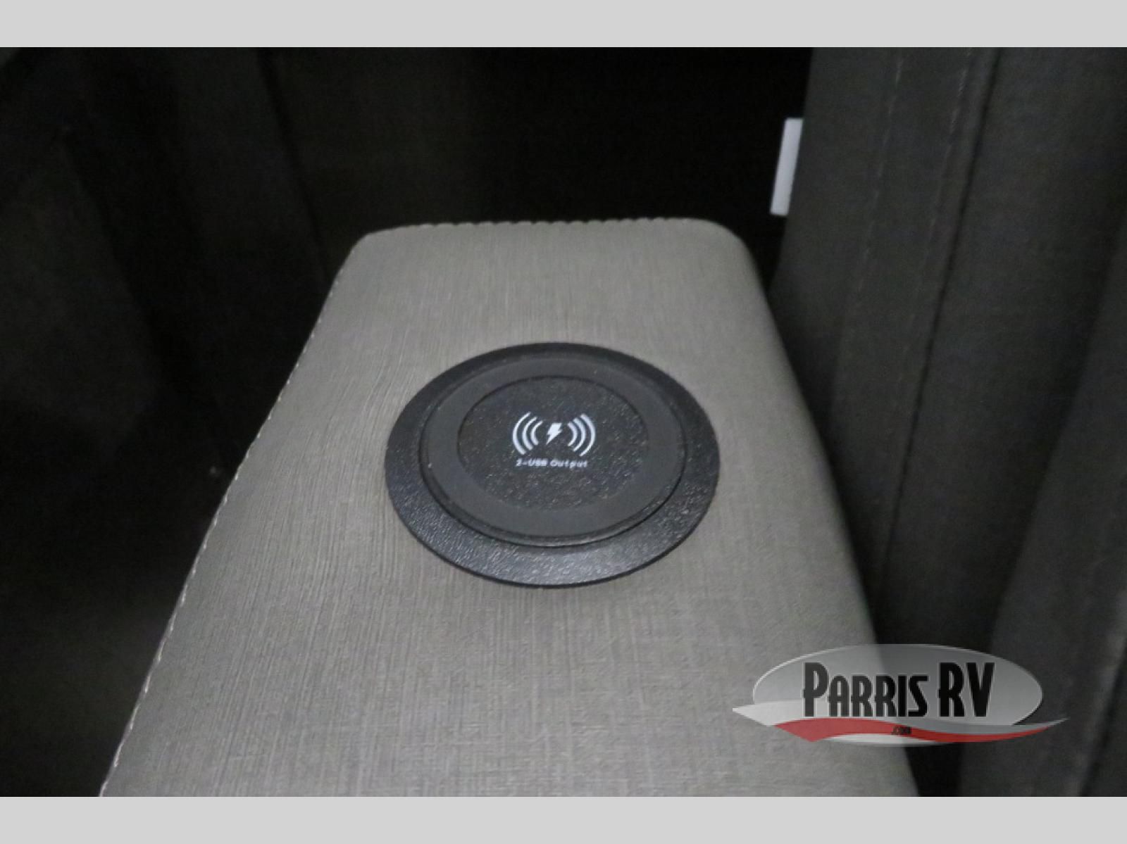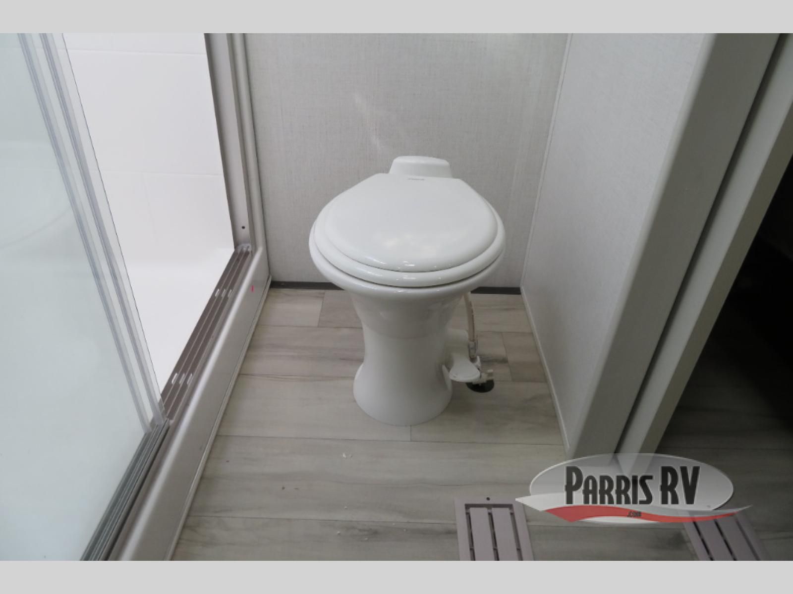 This fifth wheel is decked out in luxuries! The full rear bathroom has a walk-in shower to freshen up in each morning, a dual sink vanity for two to get ready at once, plus washer and dryer prep. You will enjoy a good night's rest on the king bed slide inside the private bedroom and others can sleep on the opposing tri-fold sofa sleeper slides in the living room. There is also a theater seating here, along with a fireplace and 50" LED TV for movie nights. The front kitchen is where it's really at in this fifth wheel; ample counter space, a bar top with stools, pull-out drawers, plus a pantry and closet for even more storage!