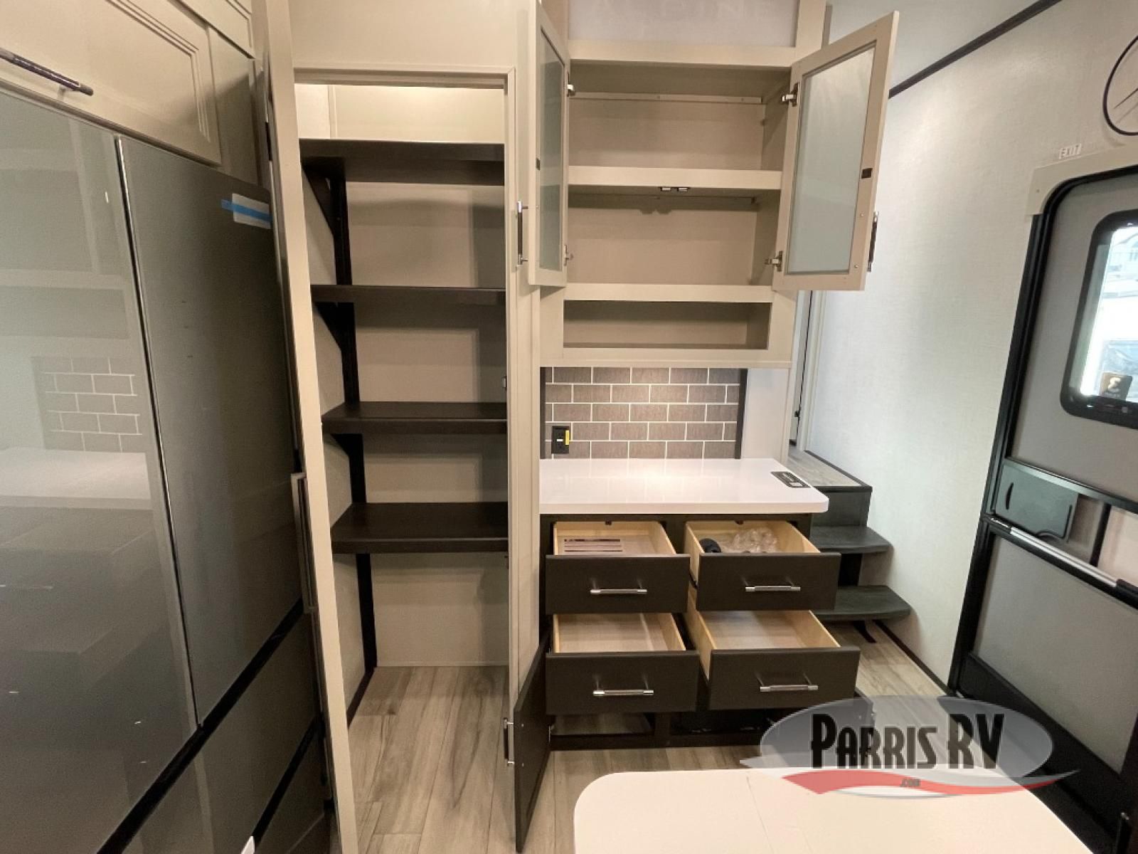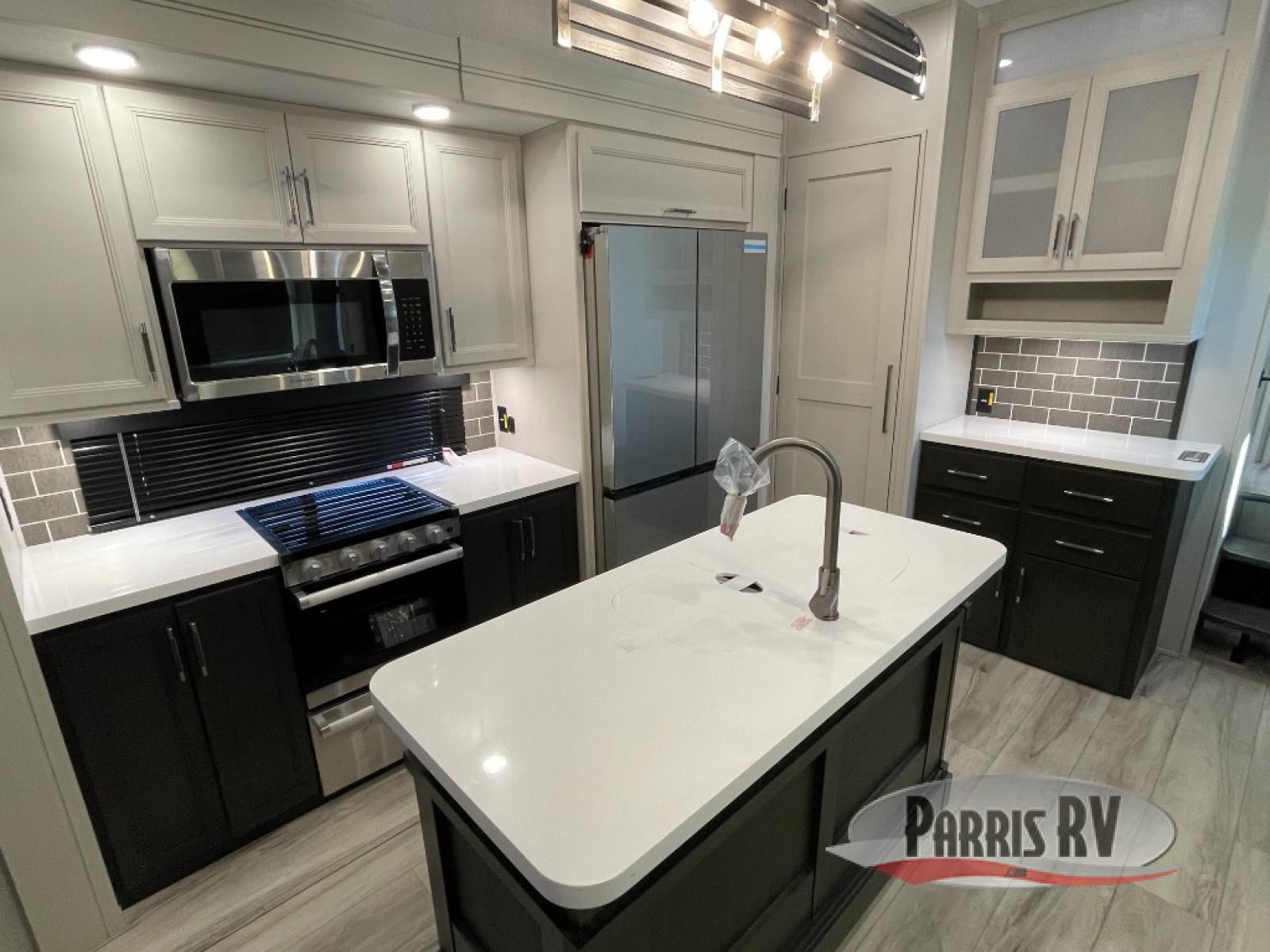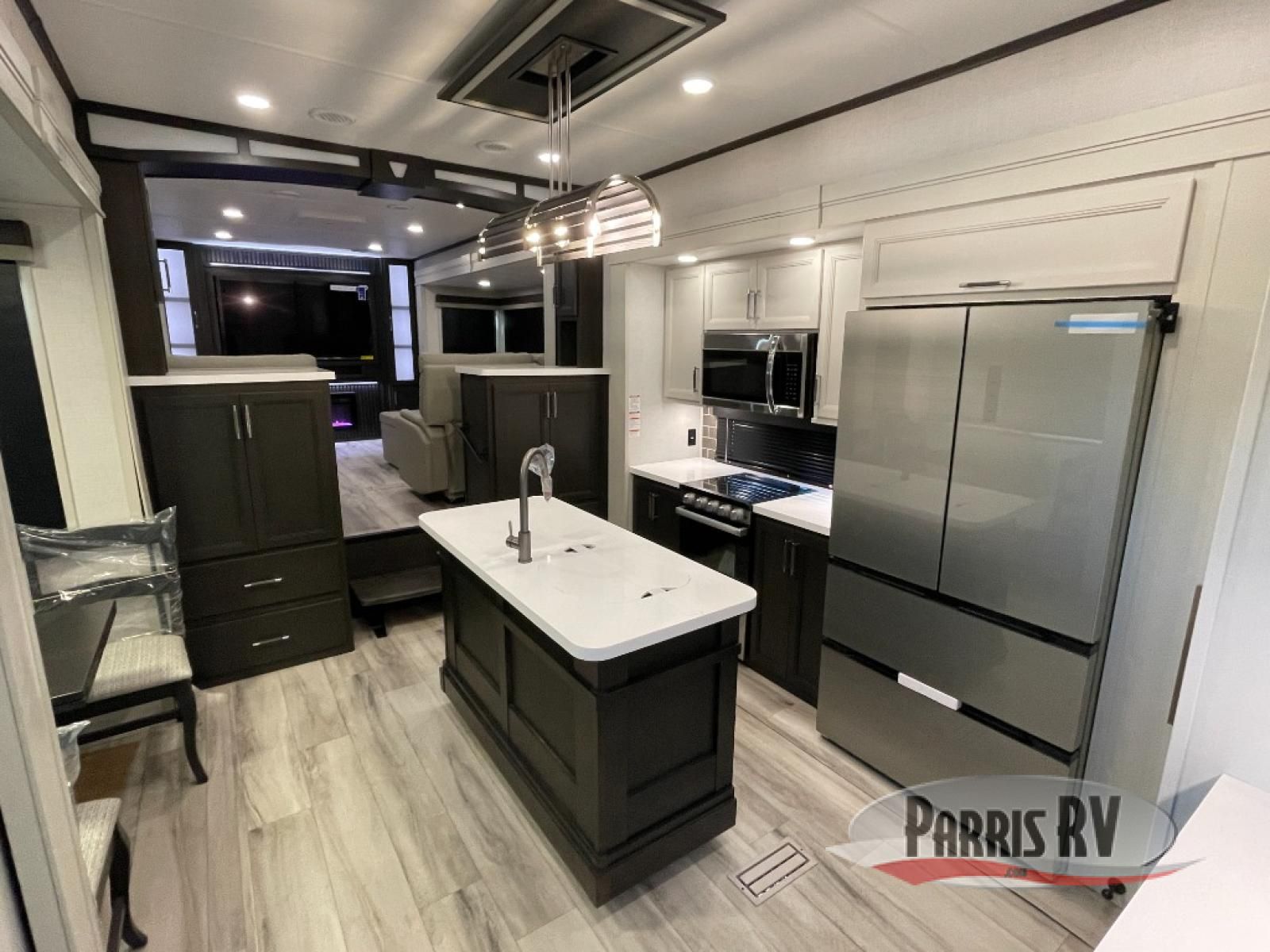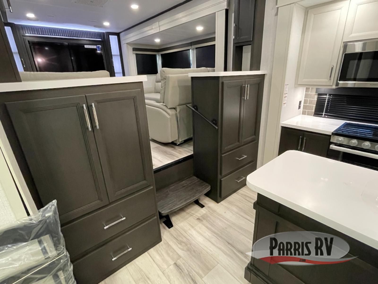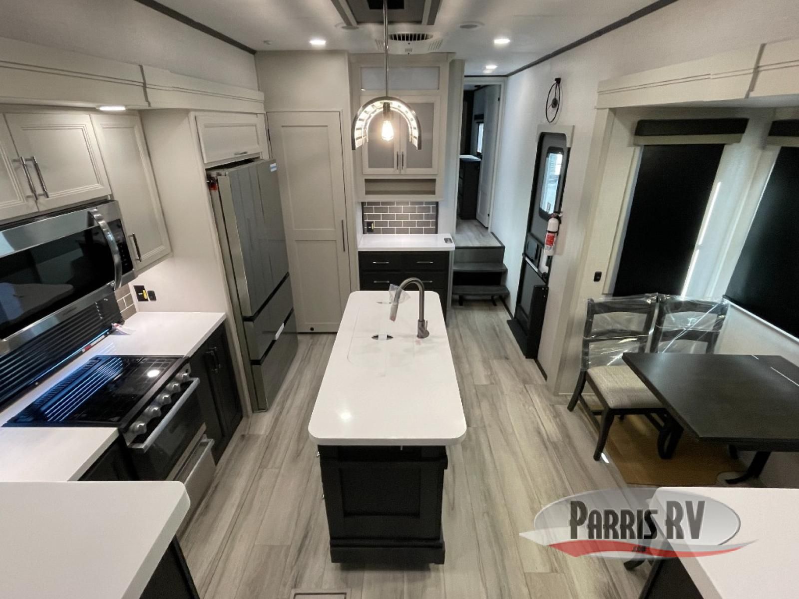 It will be so easy to enjoy trips in this spacious fifth wheel that can sleep six each night! The rear living room features L-shaped sofa slide outs with ottomans, a 65" TV with a large feature wall, and a fireplace to make it cozier. There is a stylish lighted beam and lighted steps that lead to the middle kitchen with dual opposing slides, a kitchen island, triple pantries, and a free-standing dinette. And the chef will appreciate all the kitchen appliances to make their best meals for the whole gang. As you head up the steps, you'll find a full bath to easily freshen up each day, and you'll love the front private bedroom with a king bed slide, master closet with hidden shoe storage, plus stackable washer and dryer prep!