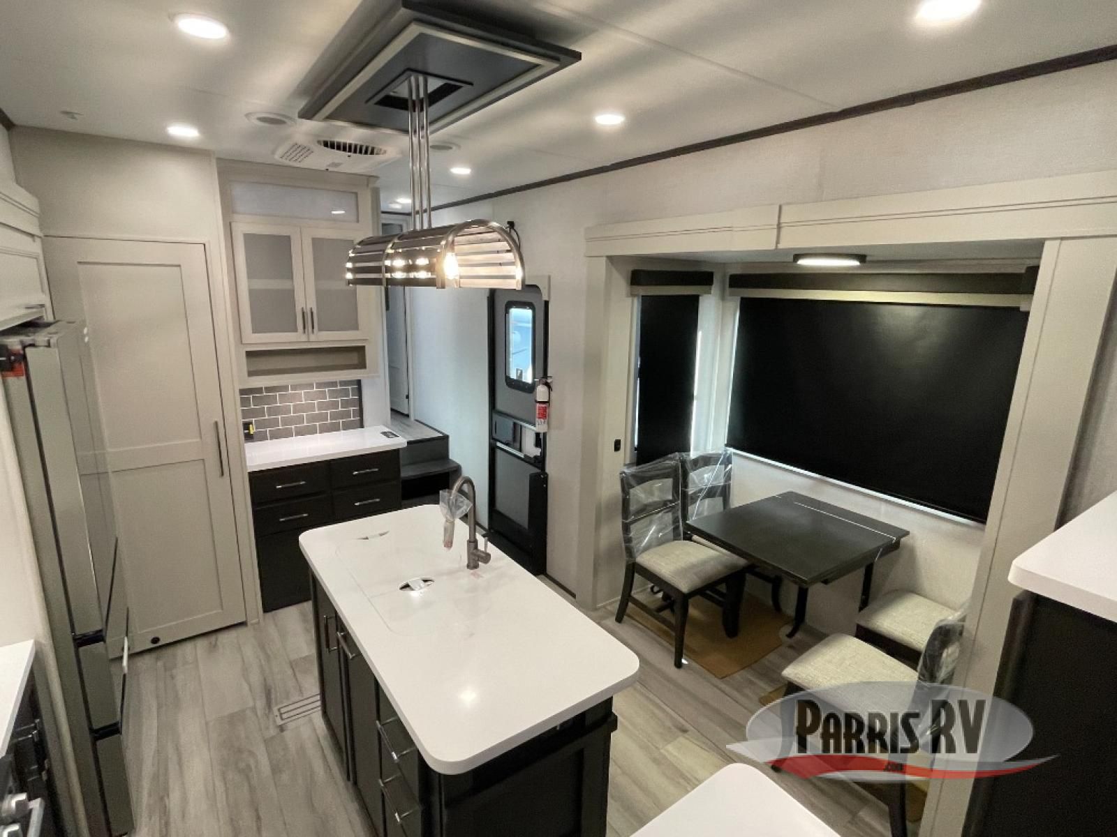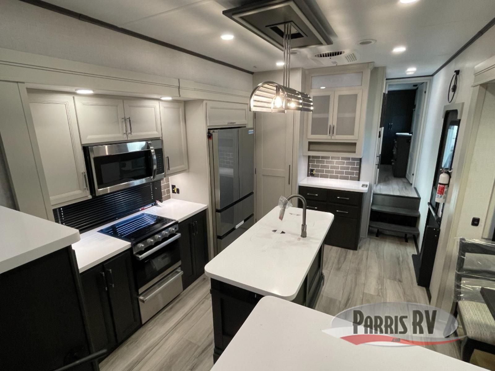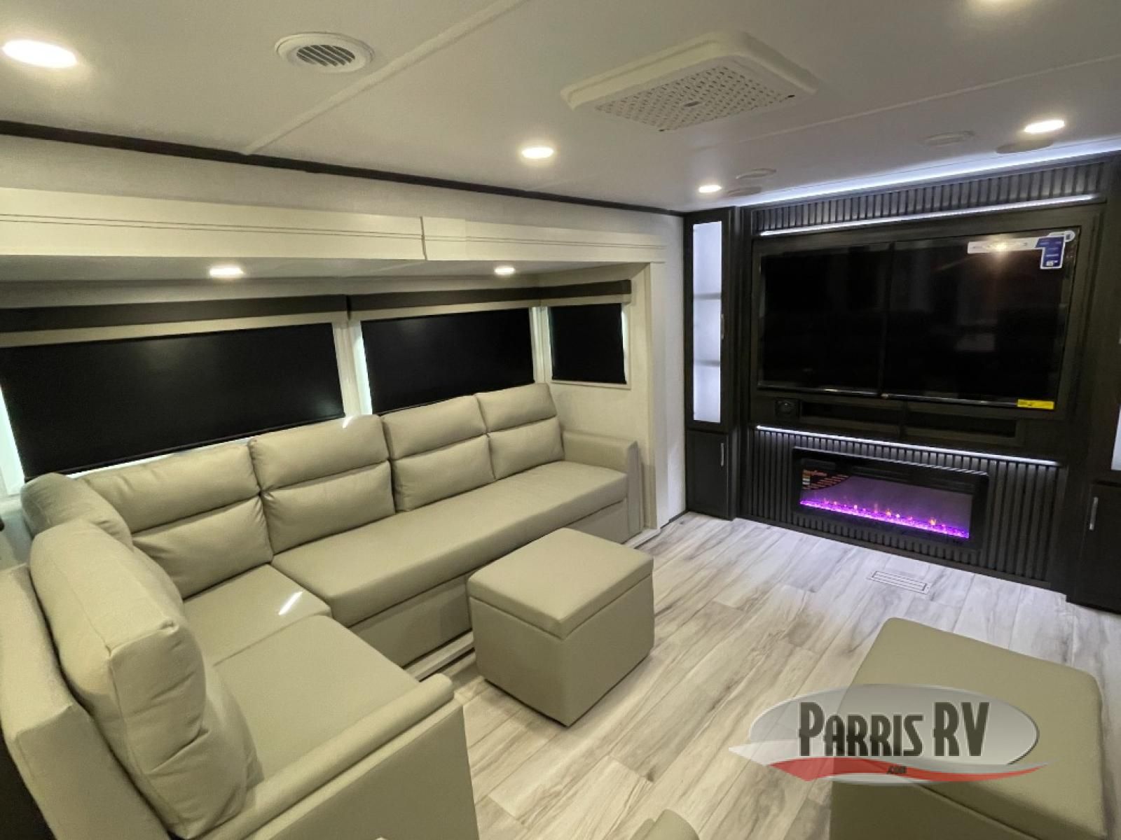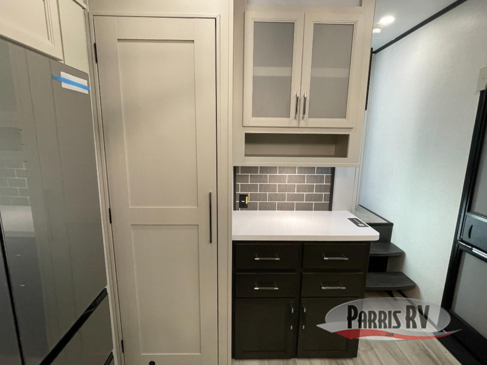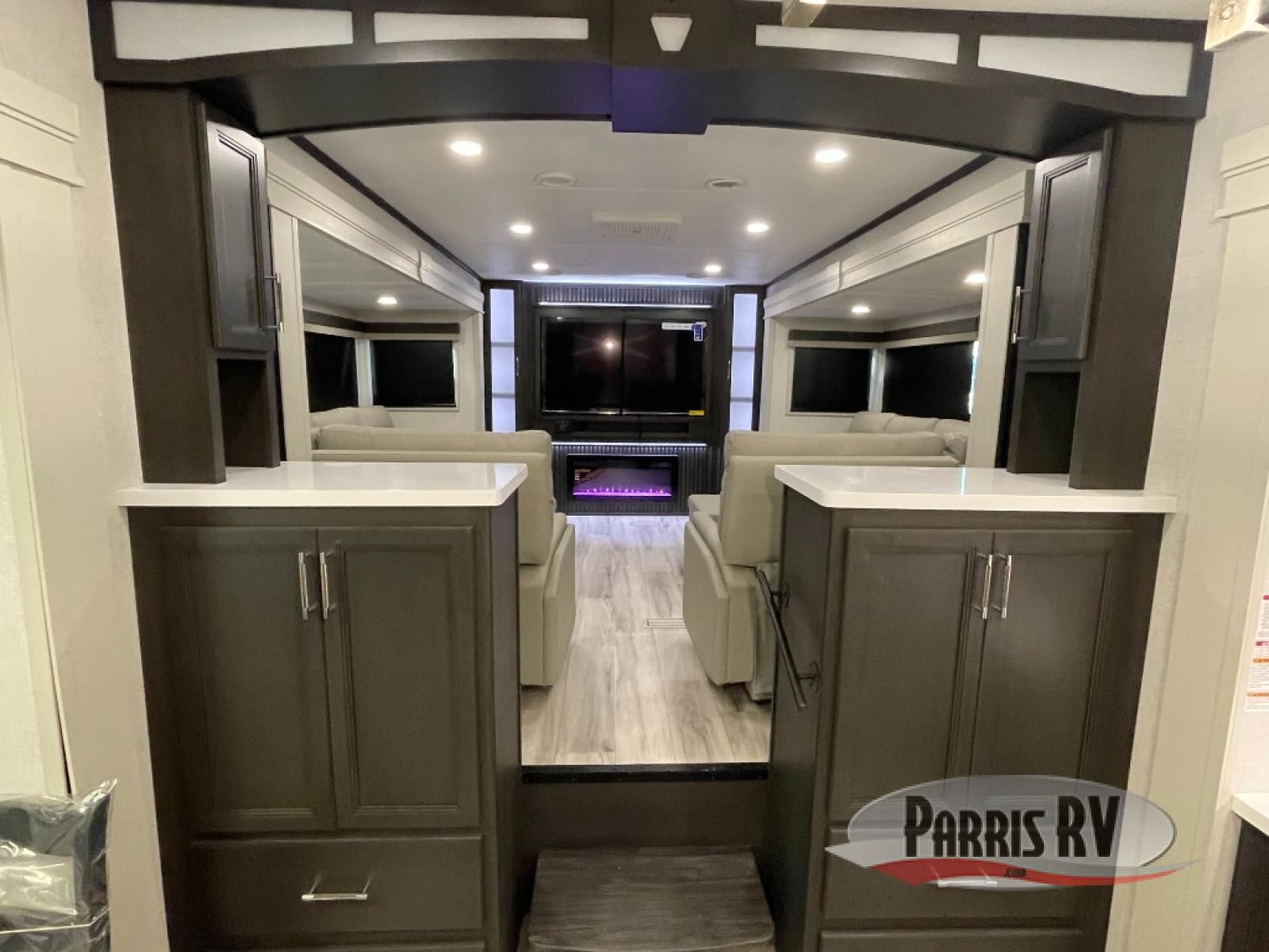 It will be so easy to enjoy trips in this spacious fifth wheel that can sleep six each night! The rear living room features L-shaped sofa slide outs with ottomans, a 65" TV with a large feature wall, and a fireplace to make it cozier. There is a stylish lighted beam and lighted steps that lead to the middle kitchen with dual opposing slides, a kitchen island, triple pantries, and a free-standing dinette. And the chef will appreciate all the kitchen appliances to make their best meals for the whole gang. As you head up the steps, you'll find a full bath to easily freshen up each day, and you'll love the front private bedroom with a king bed slide, master closet with hidden shoe storage, plus stackable washer and dryer prep!