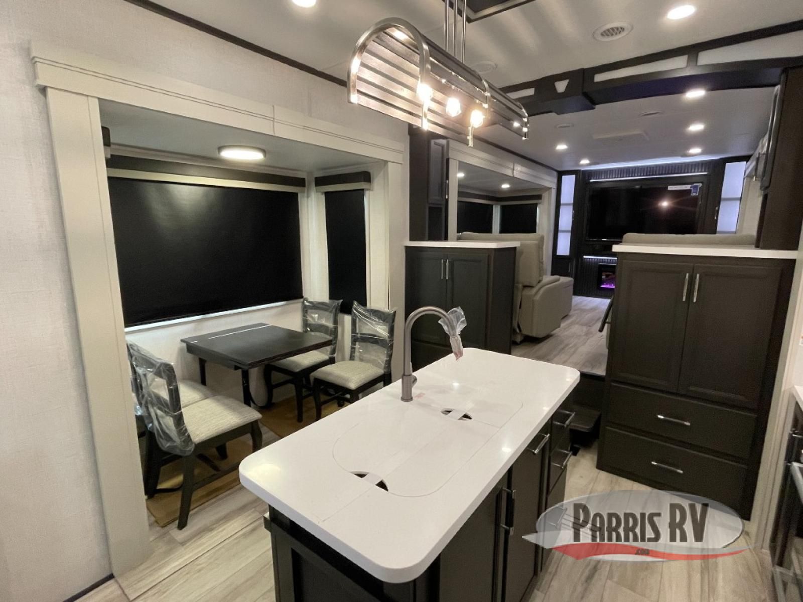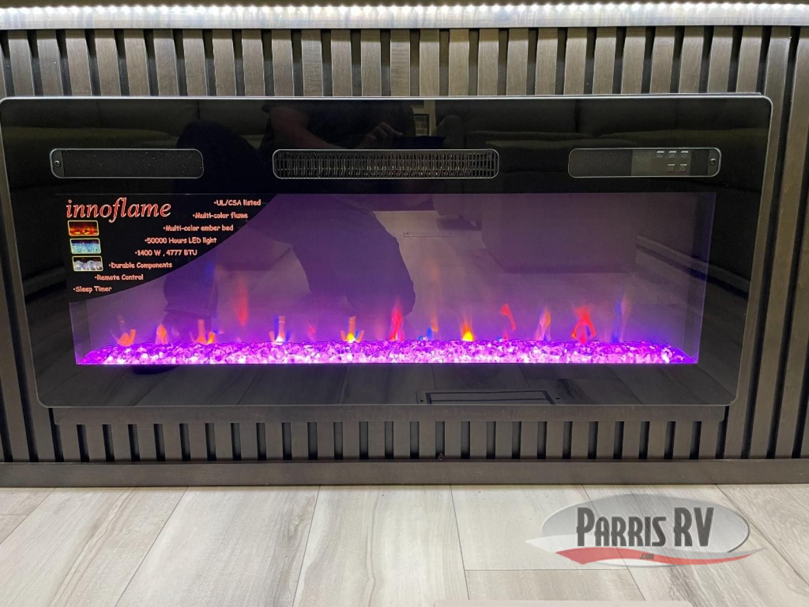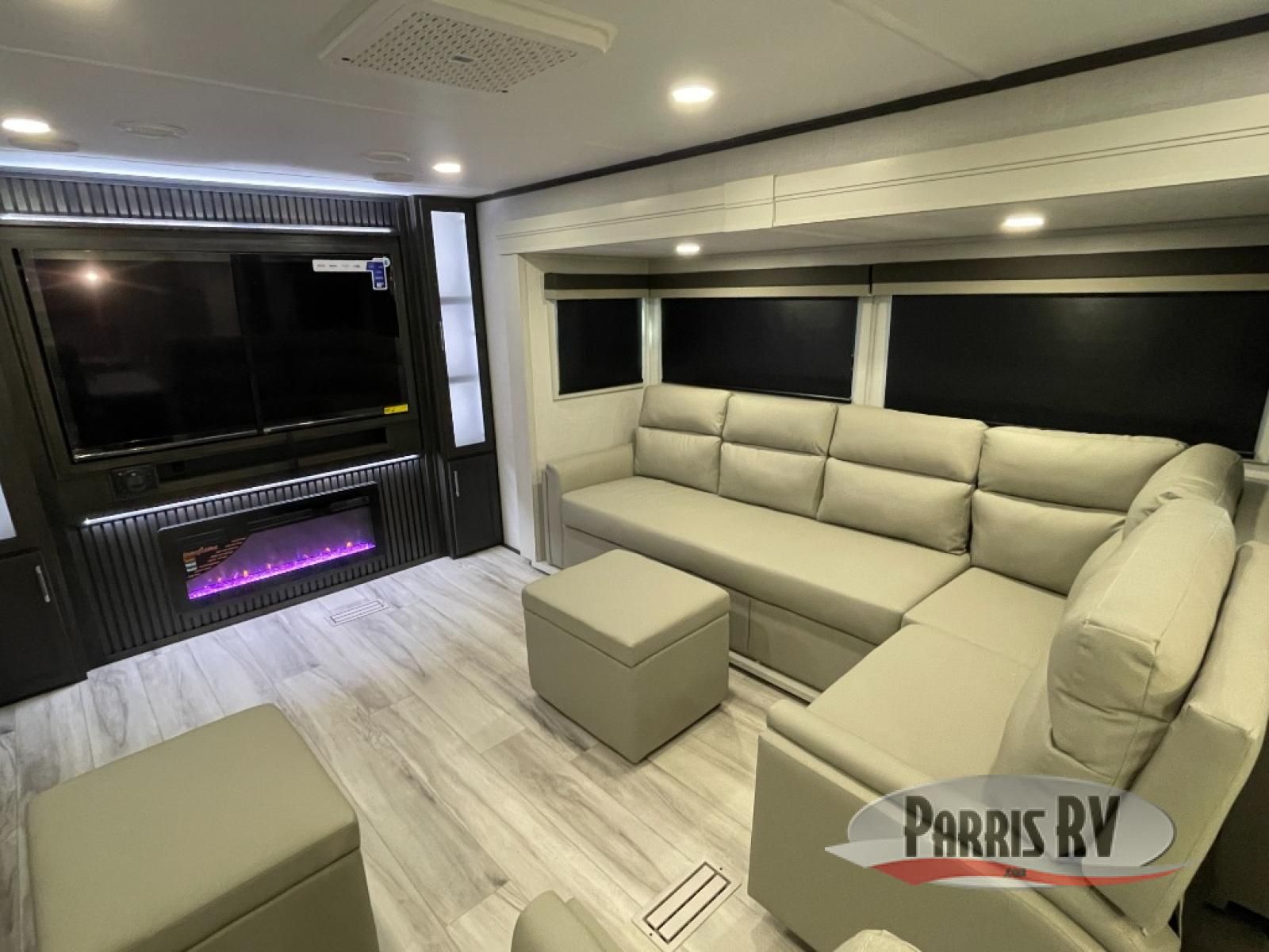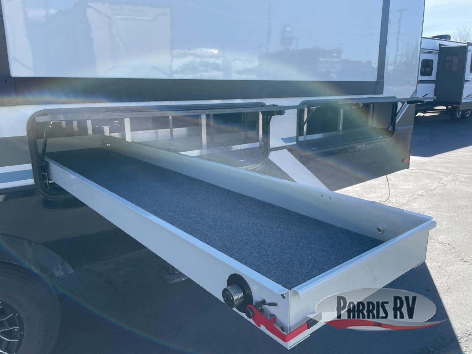 It will be so easy to enjoy trips in this spacious fifth wheel that can sleep six each night! The rear living room features L-shaped sofa slide outs with ottomans, a 65" TV with a large feature wall, and a fireplace to make it cozier. There is a stylish lighted beam and lighted steps that lead to the middle kitchen with dual opposing slides, a kitchen island, triple pantries, and a free-standing dinette. And the chef will appreciate all the kitchen appliances to make their best meals for the whole gang. As you head up the steps, you'll find a full bath to easily freshen up each day, and you'll love the front private bedroom with a king bed slide, master closet with hidden shoe storage, plus stackable washer and dryer prep!