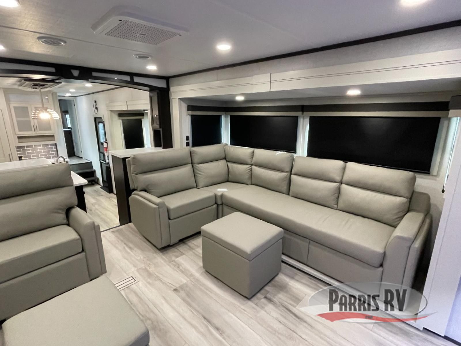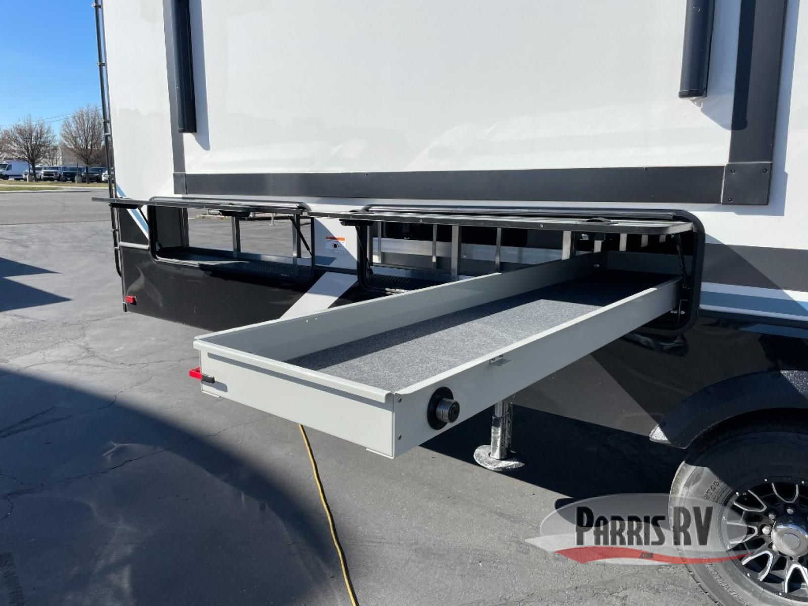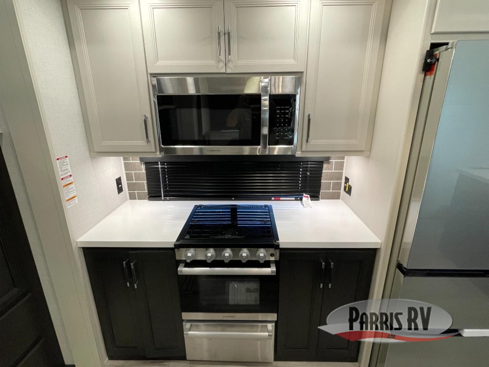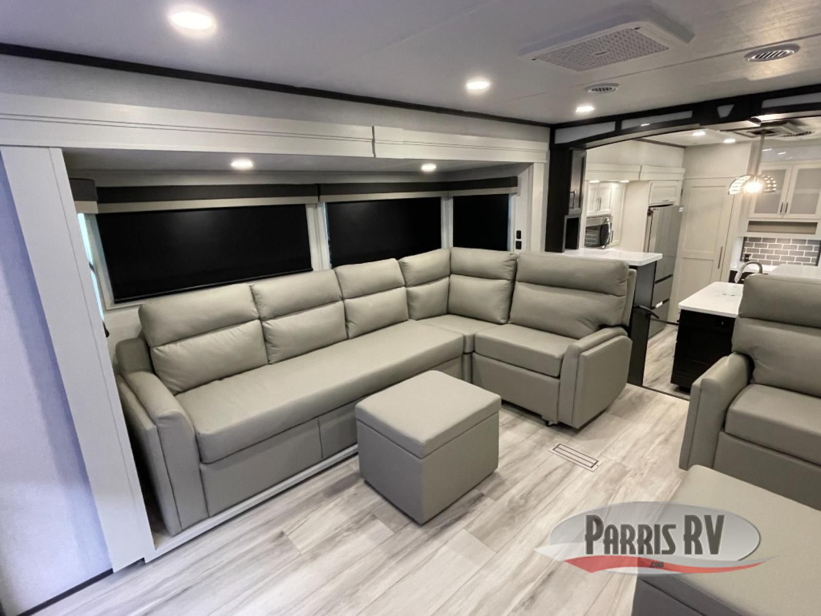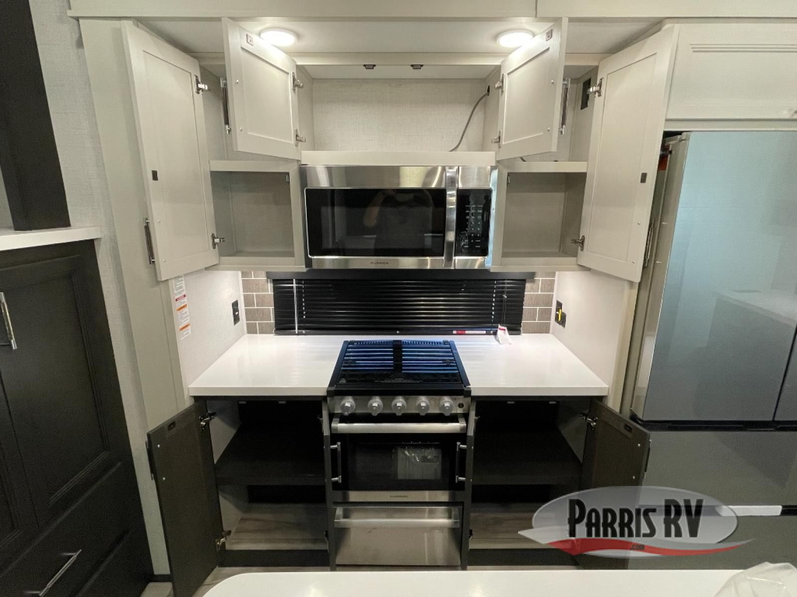 It will be so easy to enjoy trips in this spacious fifth wheel that can sleep six each night! The rear living room features L-shaped sofa slide outs with ottomans, a 65" TV with a large feature wall, and a fireplace to make it cozier. There is a stylish lighted beam and lighted steps that lead to the middle kitchen with dual opposing slides, a kitchen island, triple pantries, and a free-standing dinette. And the chef will appreciate all the kitchen appliances to make their best meals for the whole gang. As you head up the steps, you'll find a full bath to easily freshen up each day, and you'll love the front private bedroom with a king bed slide, master closet with hidden shoe storage, plus stackable washer and dryer prep!