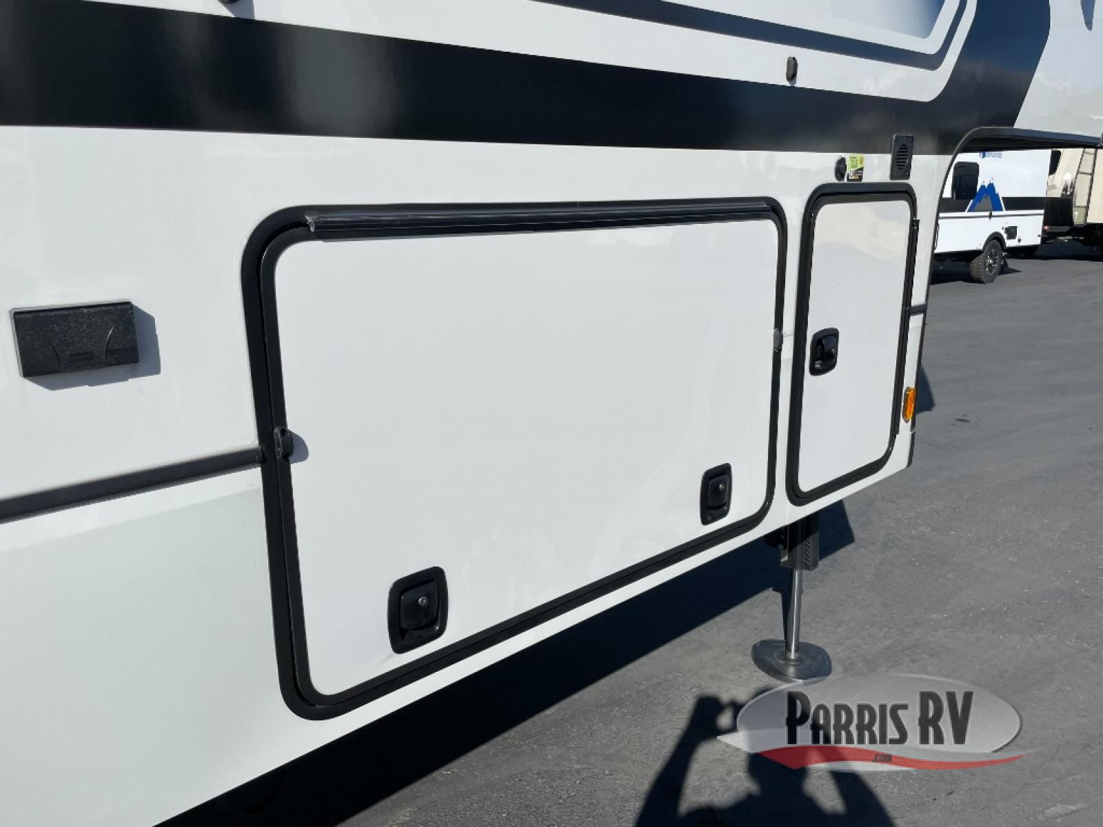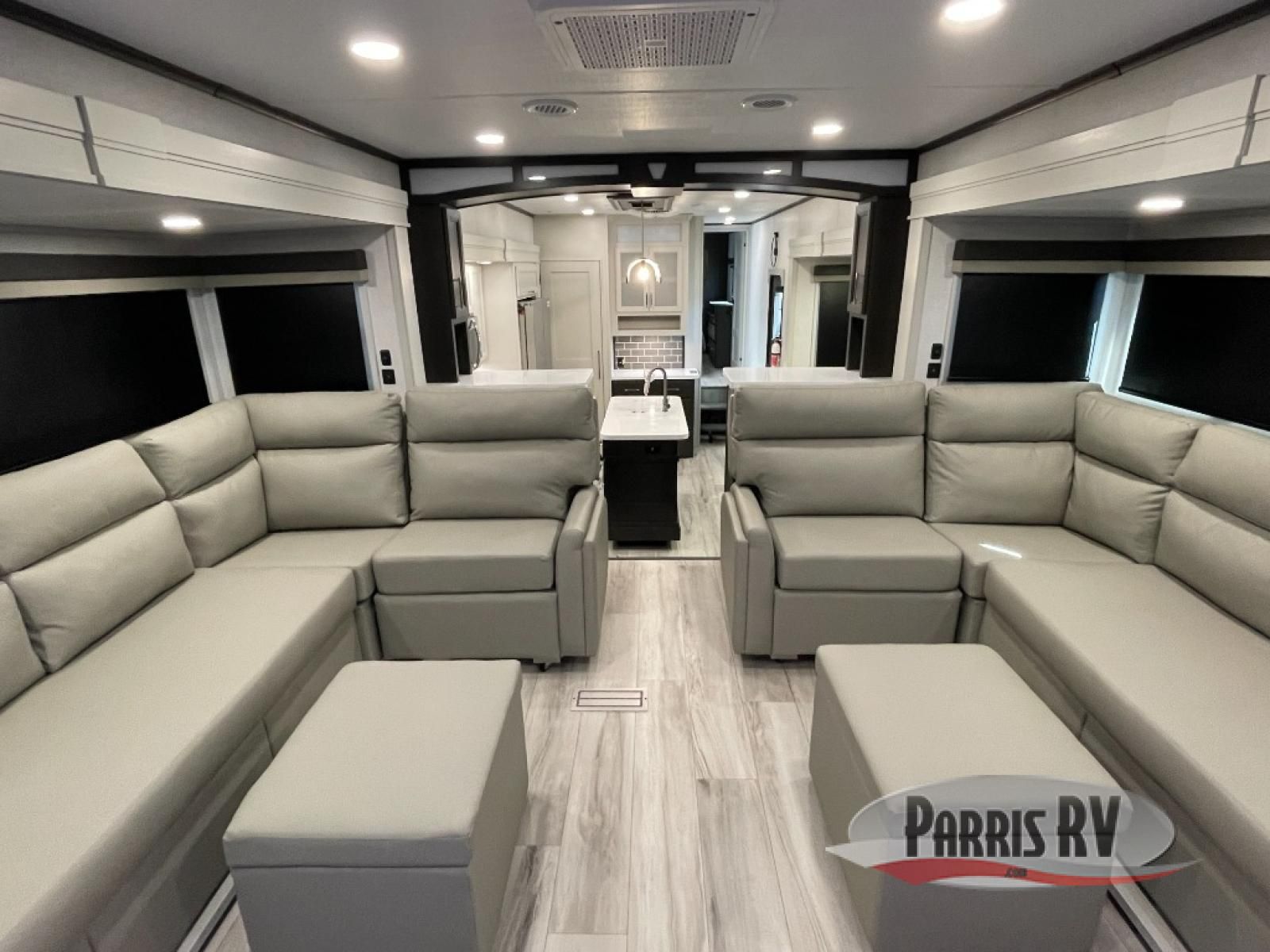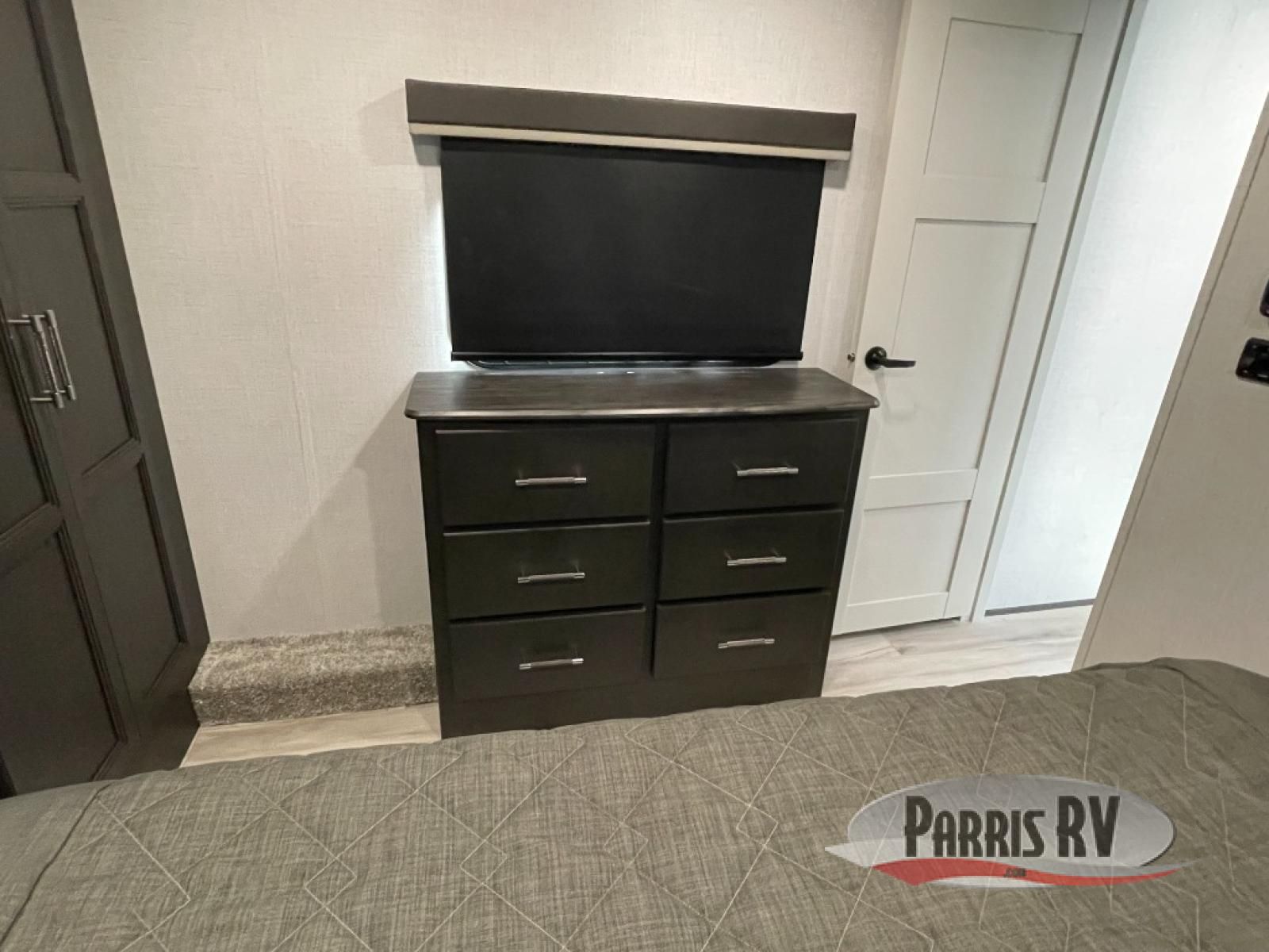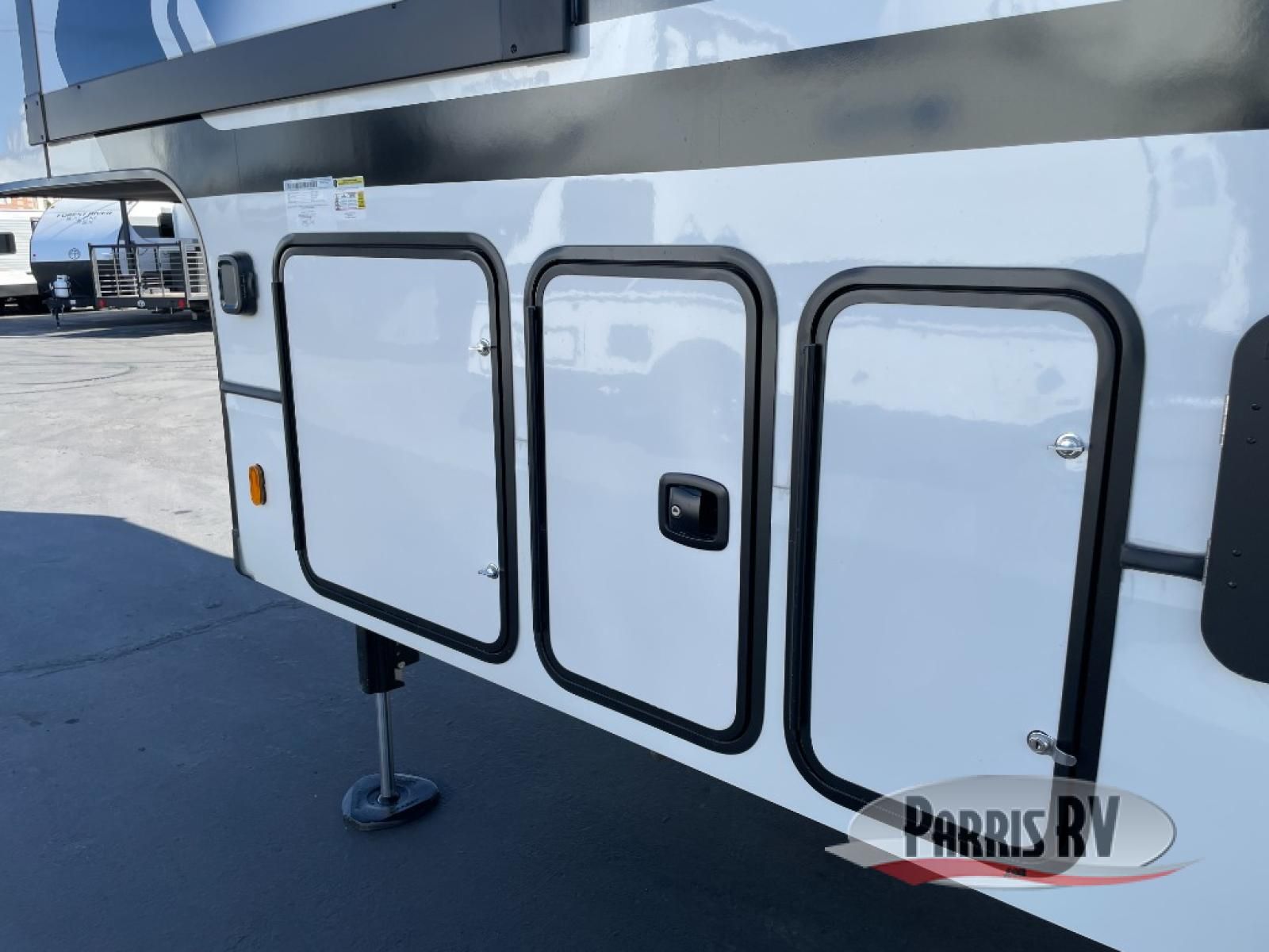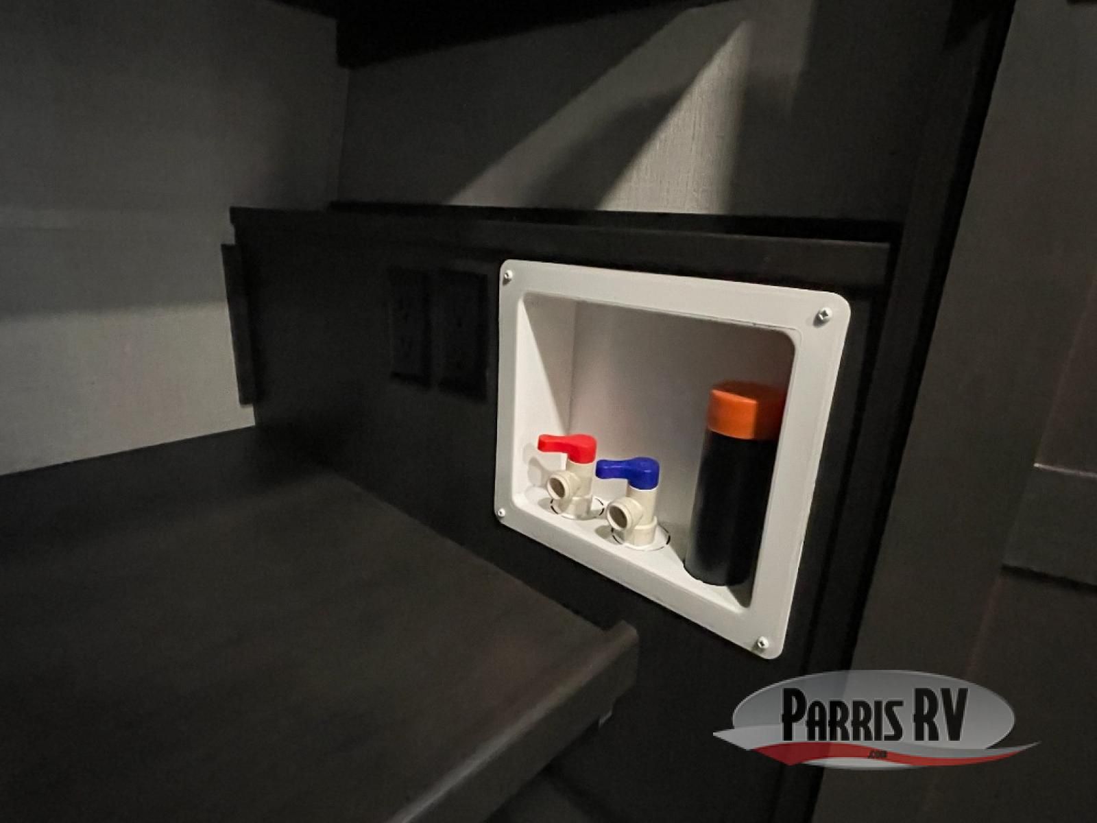 It will be so easy to enjoy trips in this spacious fifth wheel that can sleep six each night! The rear living room features L-shaped sofa slide outs with ottomans, a 65" TV with a large feature wall, and a fireplace to make it cozier. There is a stylish lighted beam and lighted steps that lead to the middle kitchen with dual opposing slides, a kitchen island, triple pantries, and a free-standing dinette. And the chef will appreciate all the kitchen appliances to make their best meals for the whole gang. As you head up the steps, you'll find a full bath to easily freshen up each day, and you'll love the front private bedroom with a king bed slide, master closet with hidden shoe storage, plus stackable washer and dryer prep!