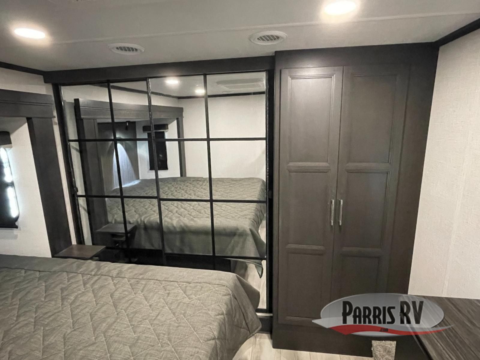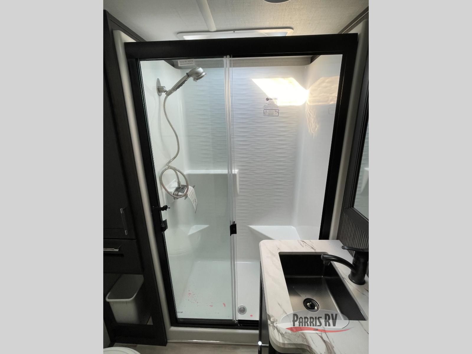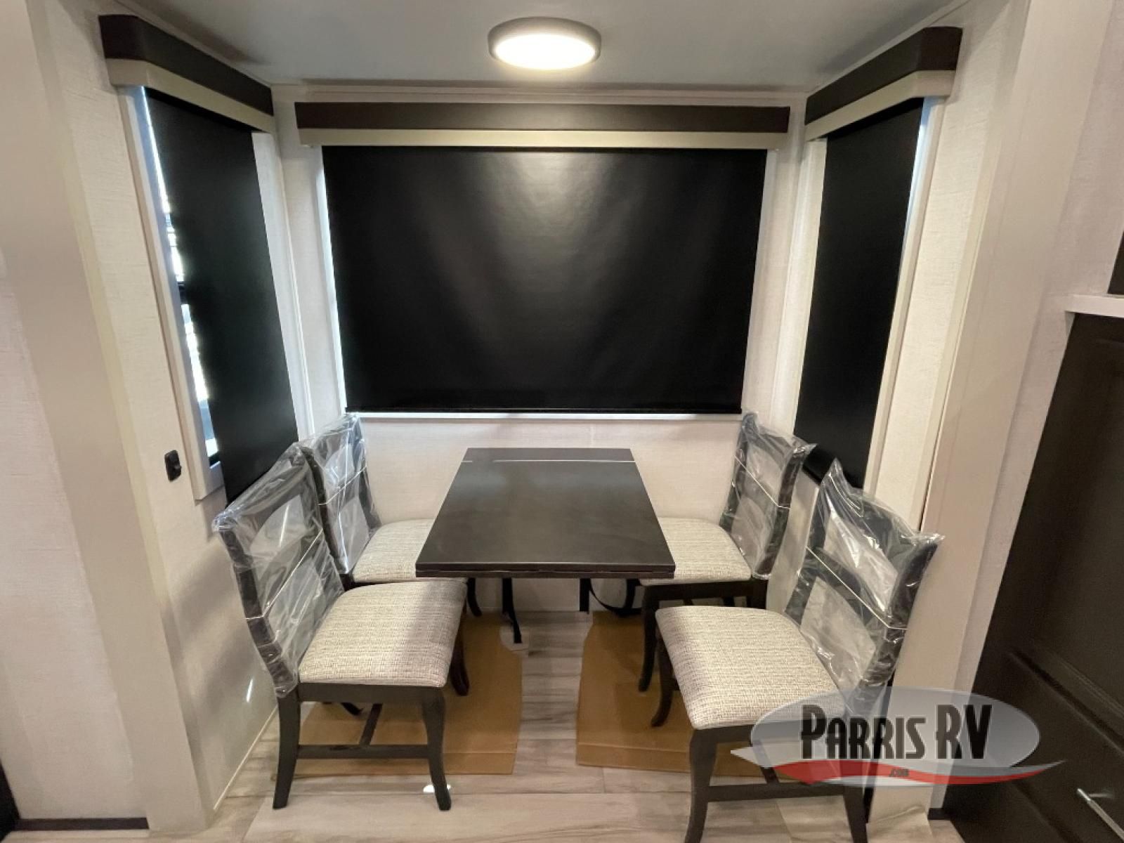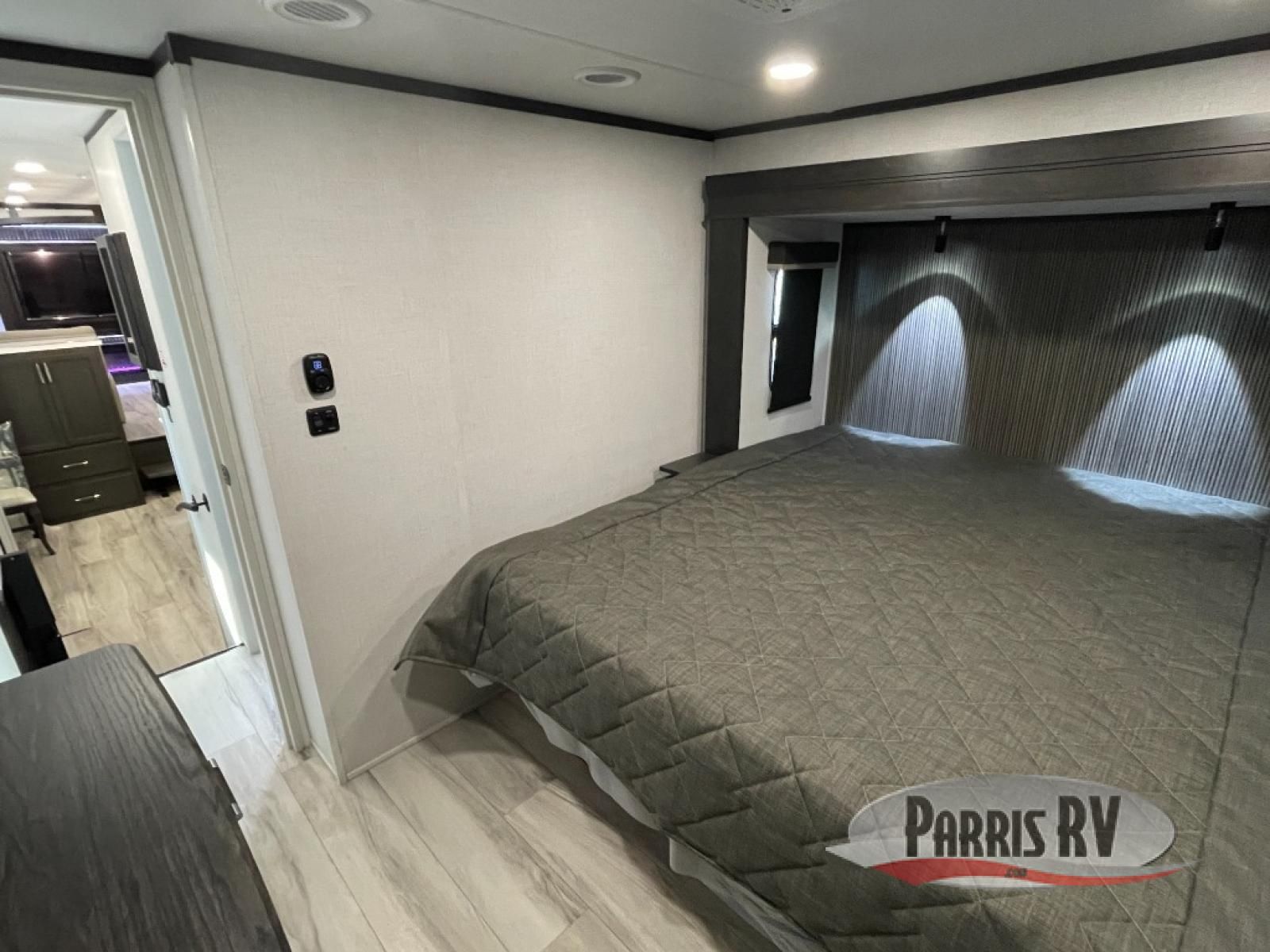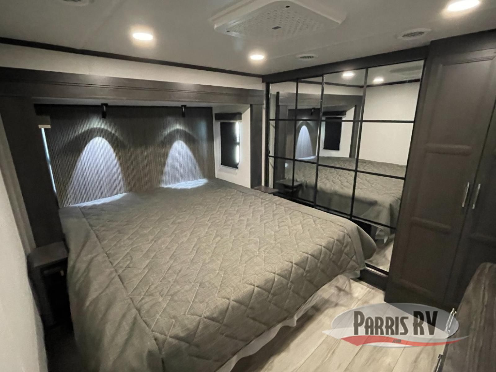 It will be so easy to enjoy trips in this spacious fifth wheel that can sleep six each night! The rear living room features L-shaped sofa slide outs with ottomans, a 65" TV with a large feature wall, and a fireplace to make it cozier. There is a stylish lighted beam and lighted steps that lead to the middle kitchen with dual opposing slides, a kitchen island, triple pantries, and a free-standing dinette. And the chef will appreciate all the kitchen appliances to make their best meals for the whole gang. As you head up the steps, you'll find a full bath to easily freshen up each day, and you'll love the front private bedroom with a king bed slide, master closet with hidden shoe storage, plus stackable washer and dryer prep!