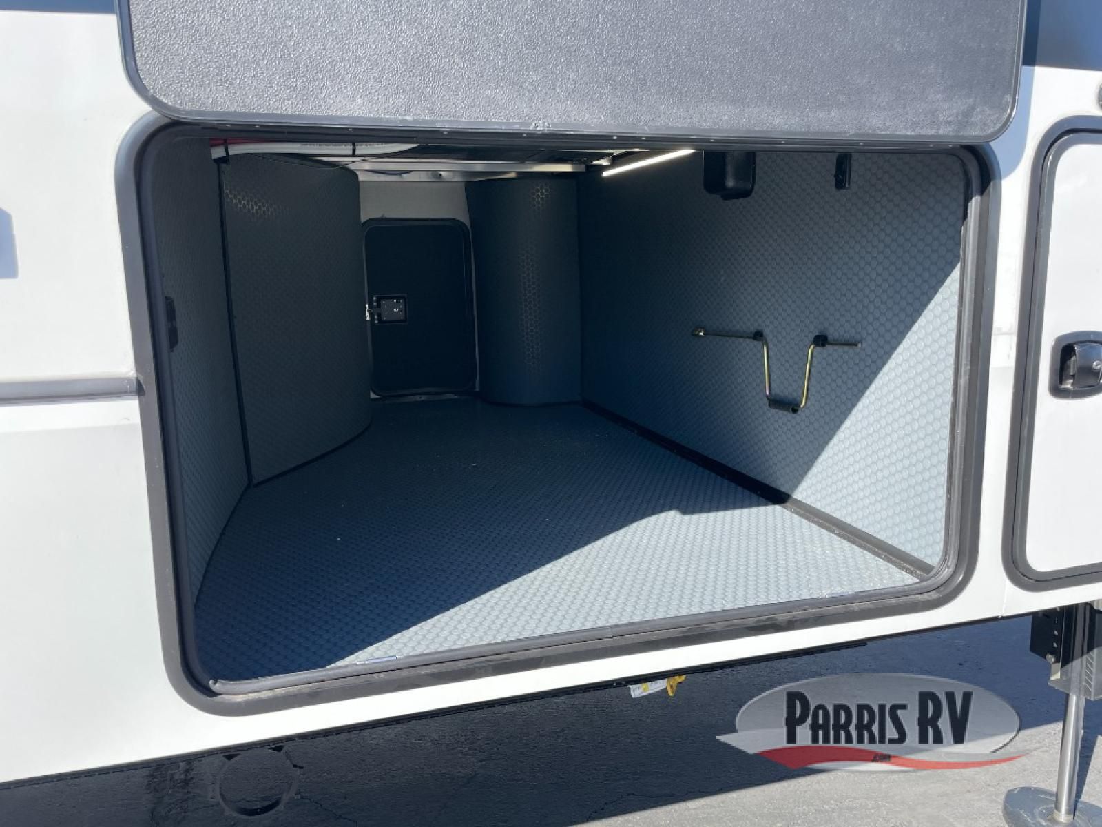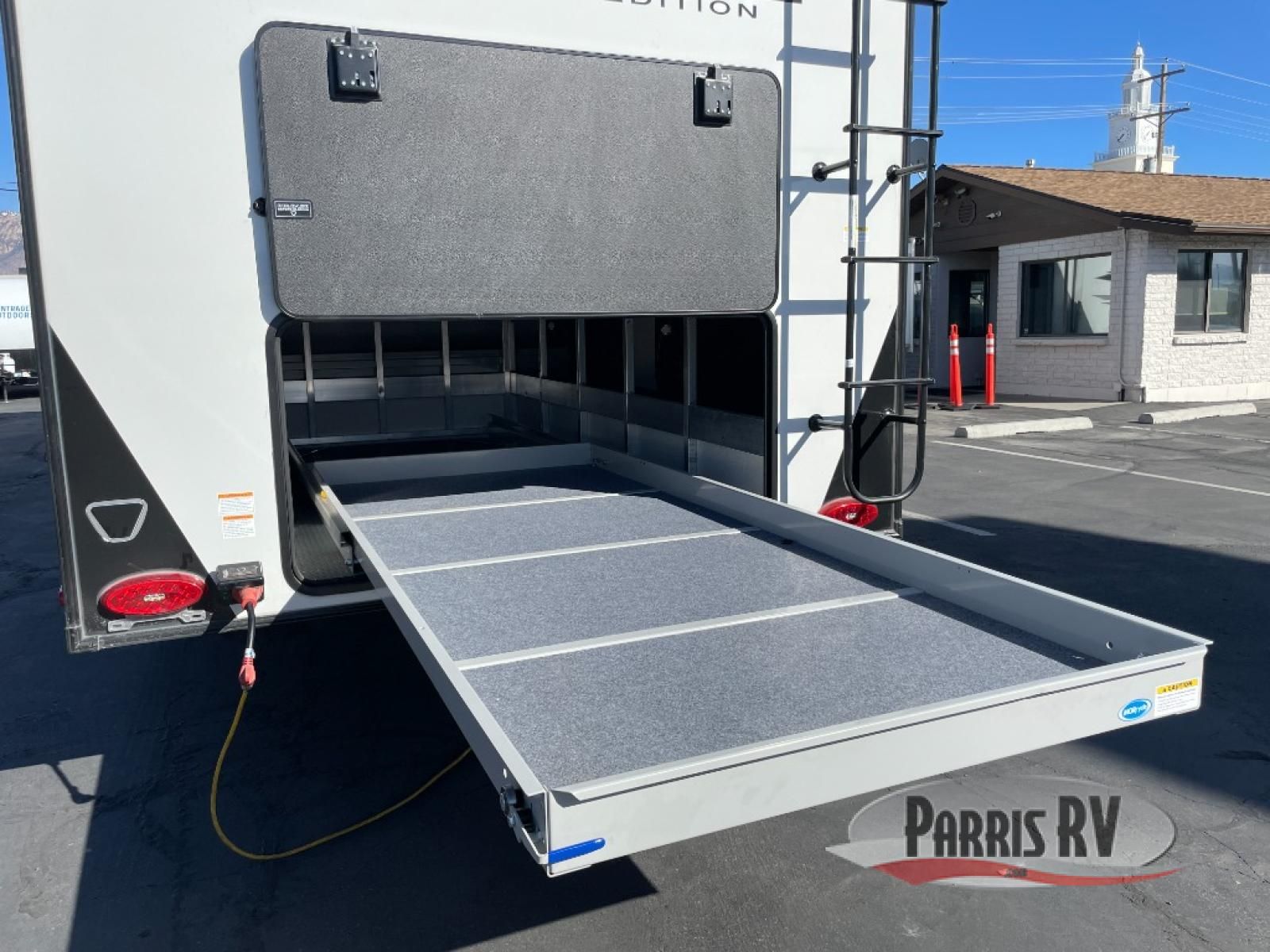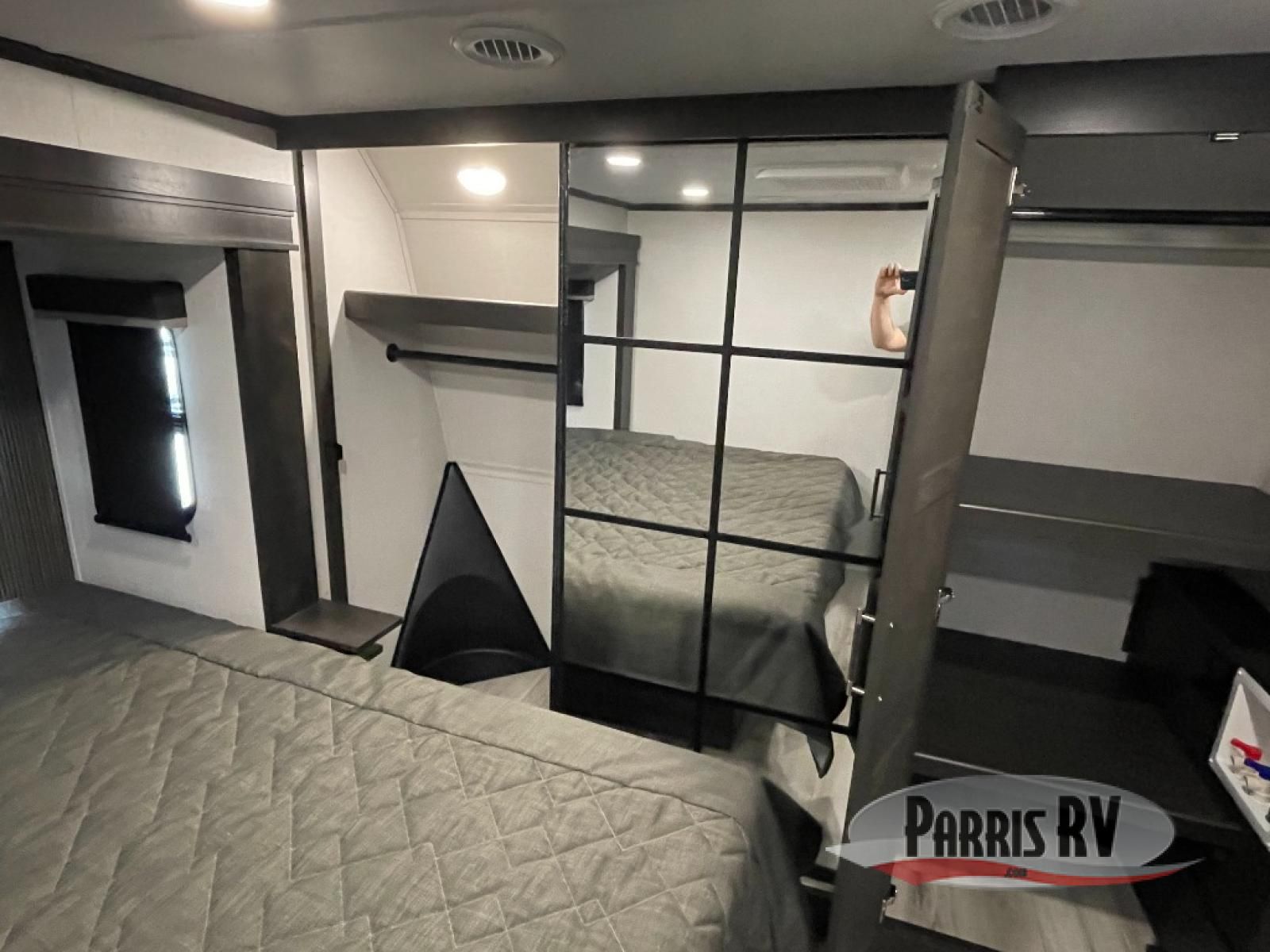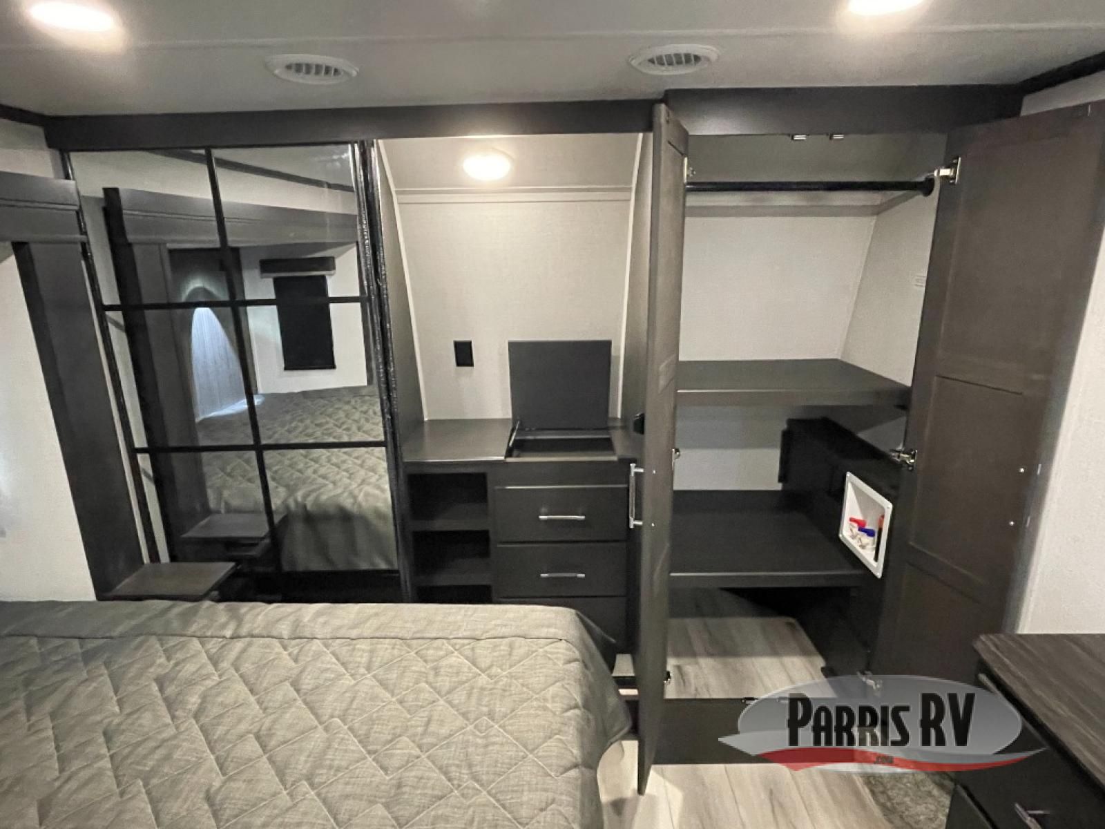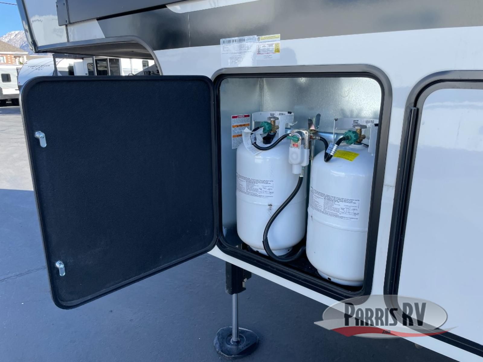 It will be so easy to enjoy trips in this spacious fifth wheel that can sleep six each night! The rear living room features L-shaped sofa slide outs with ottomans, a 65" TV with a large feature wall, and a fireplace to make it cozier. There is a stylish lighted beam and lighted steps that lead to the middle kitchen with dual opposing slides, a kitchen island, triple pantries, and a free-standing dinette. And the chef will appreciate all the kitchen appliances to make their best meals for the whole gang. As you head up the steps, you'll find a full bath to easily freshen up each day, and you'll love the front private bedroom with a king bed slide, master closet with hidden shoe storage, plus stackable washer and dryer prep!