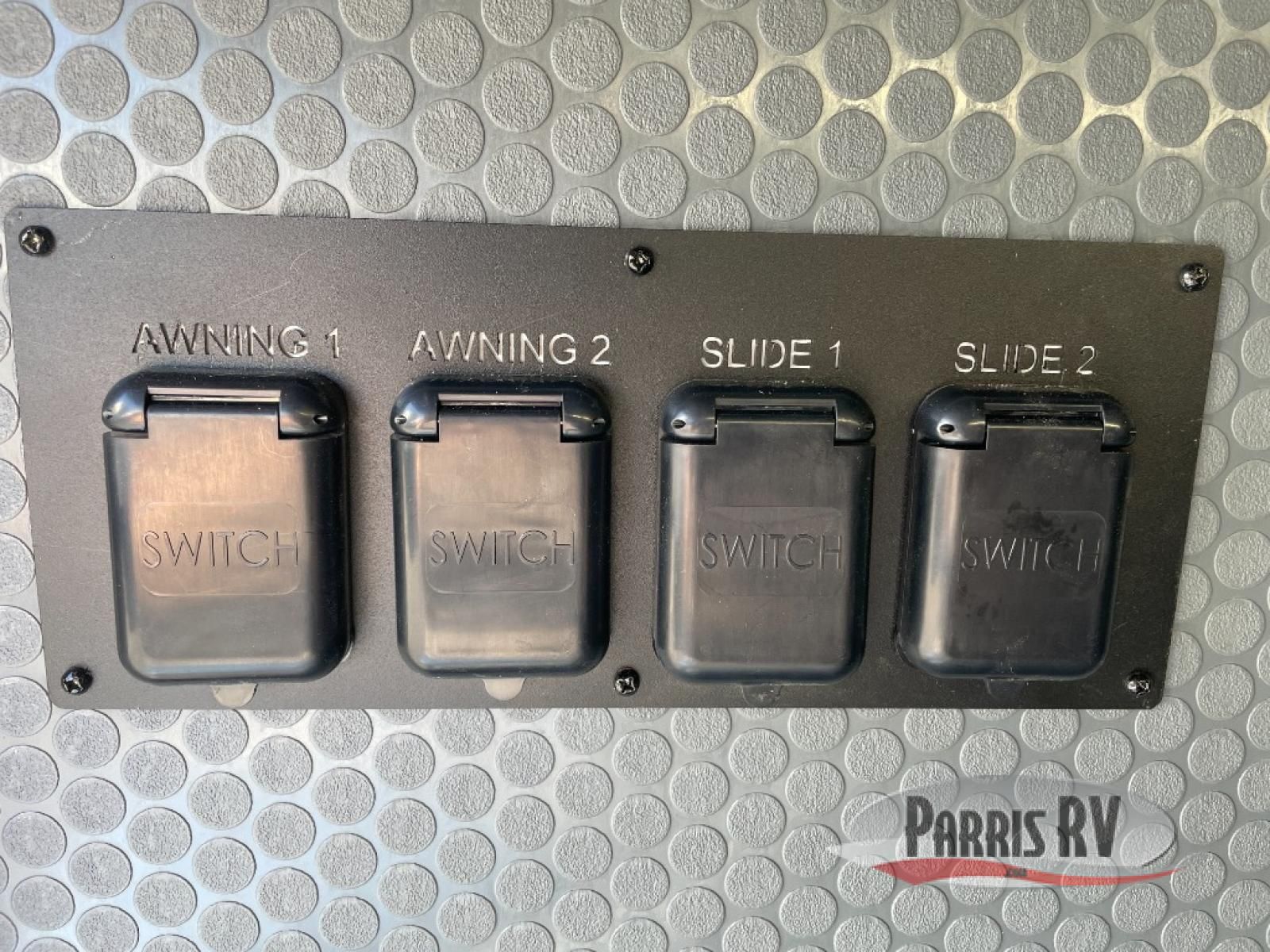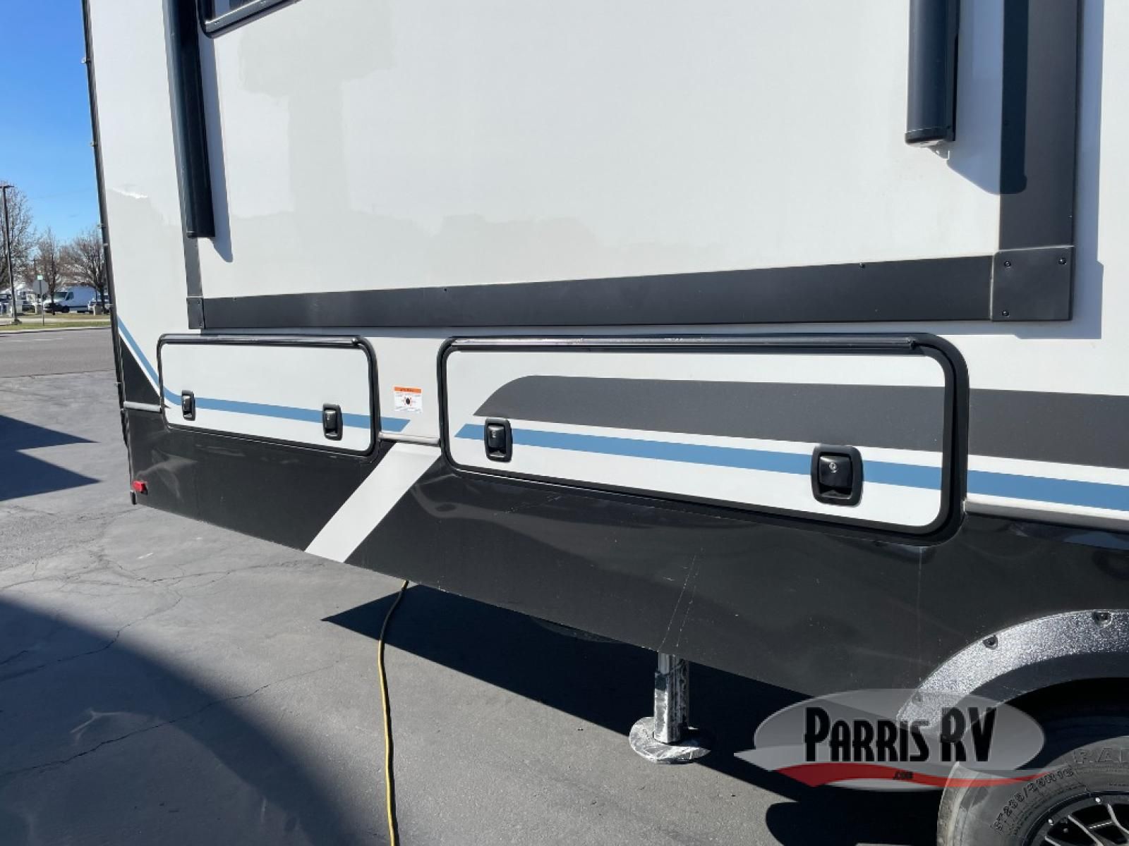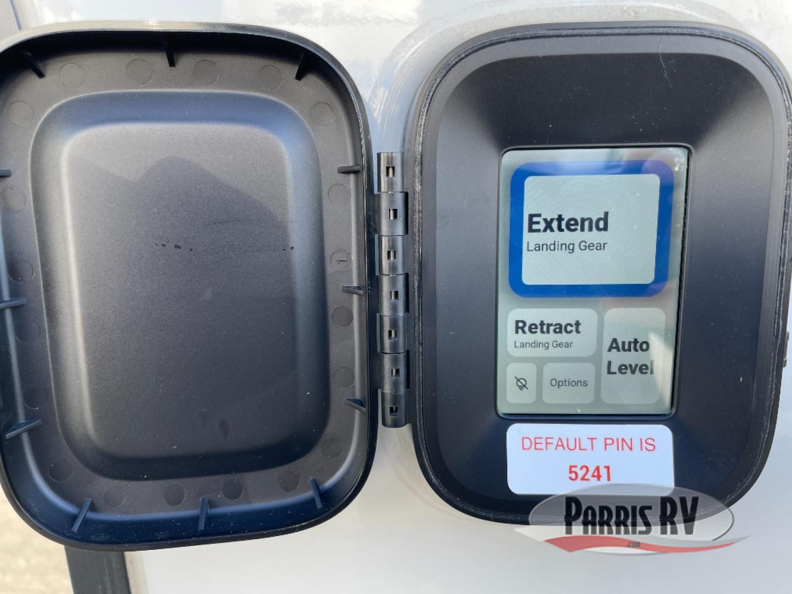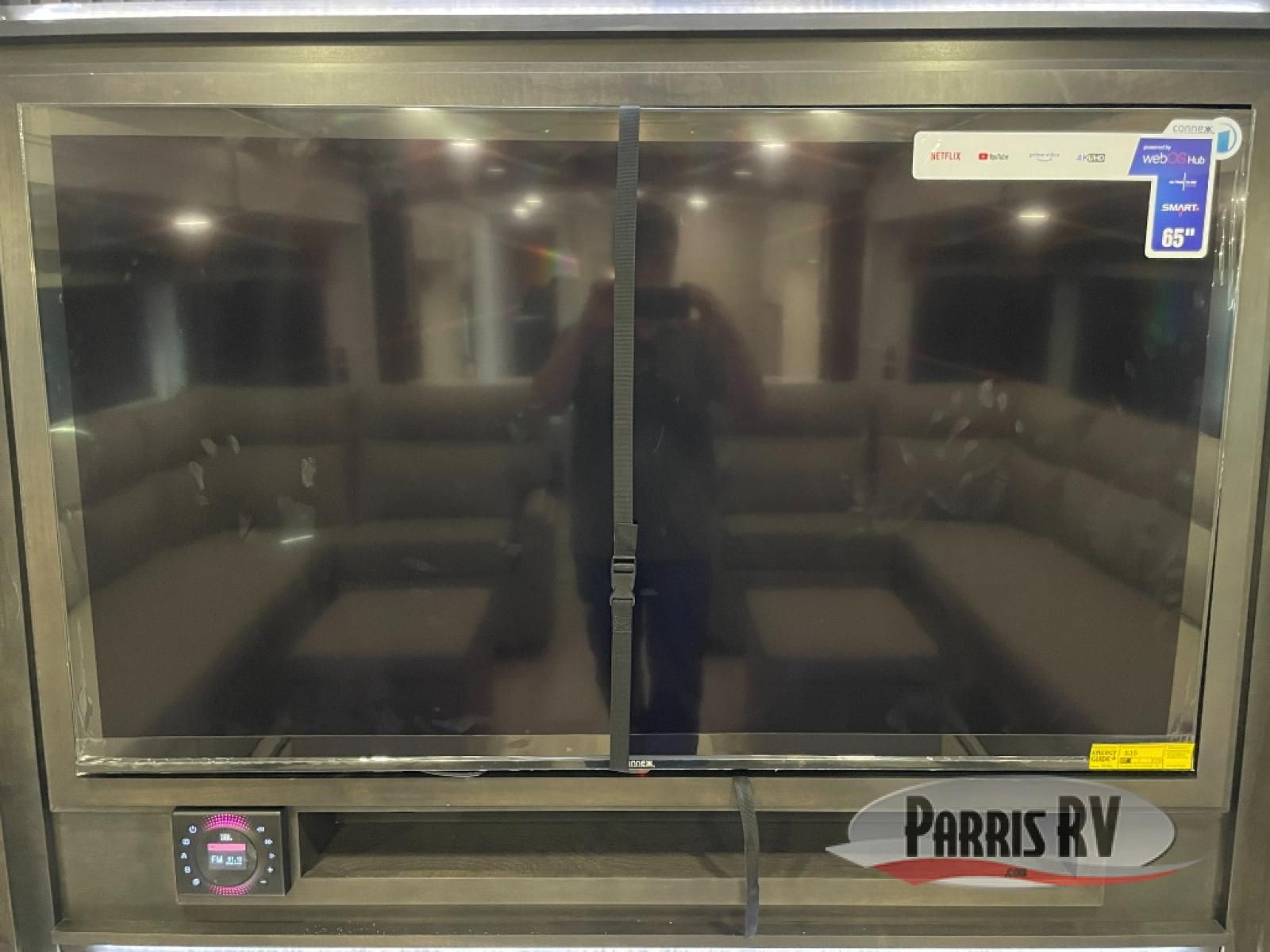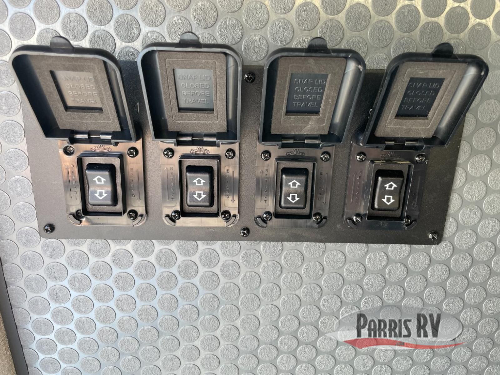 It will be so easy to enjoy trips in this spacious fifth wheel that can sleep six each night! The rear living room features L-shaped sofa slide outs with ottomans, a 65" TV with a large feature wall, and a fireplace to make it cozier. There is a stylish lighted beam and lighted steps that lead to the middle kitchen with dual opposing slides, a kitchen island, triple pantries, and a free-standing dinette. And the chef will appreciate all the kitchen appliances to make their best meals for the whole gang. As you head up the steps, you'll find a full bath to easily freshen up each day, and you'll love the front private bedroom with a king bed slide, master closet with hidden shoe storage, plus stackable washer and dryer prep!