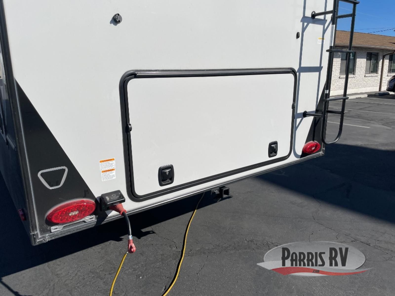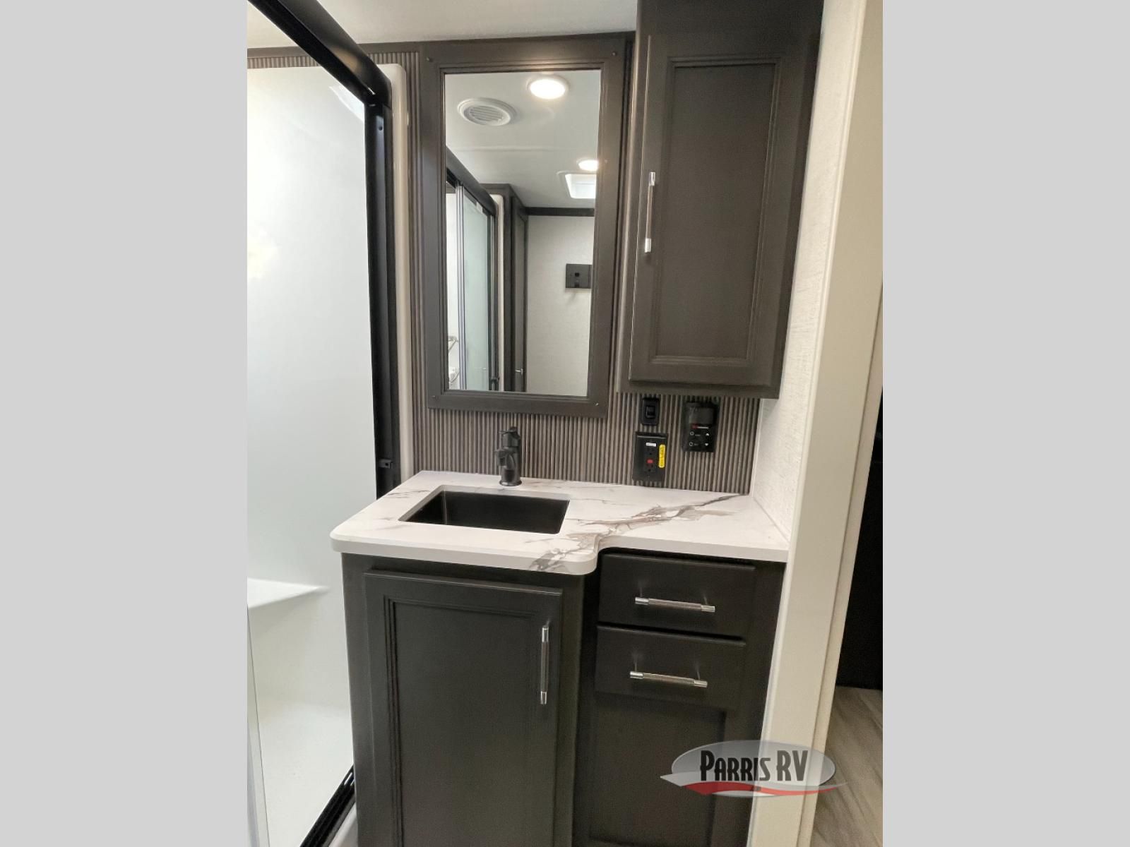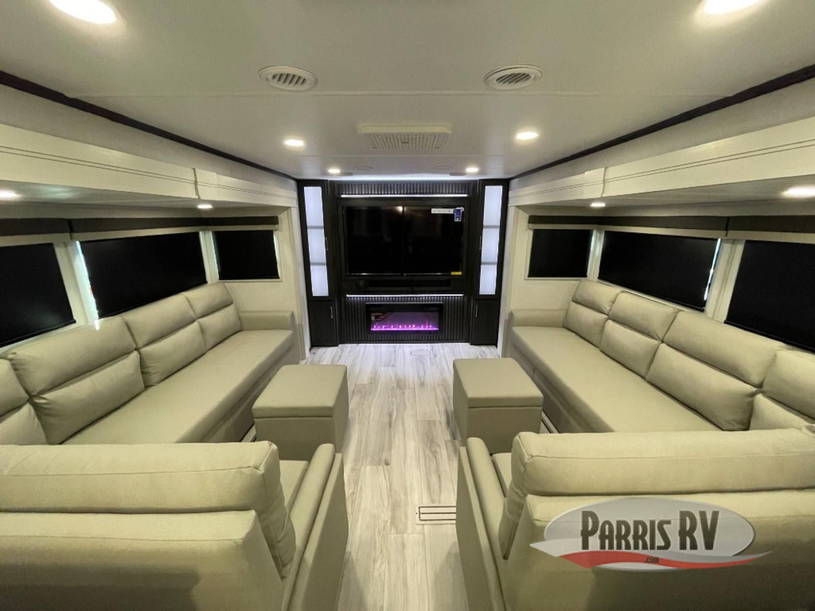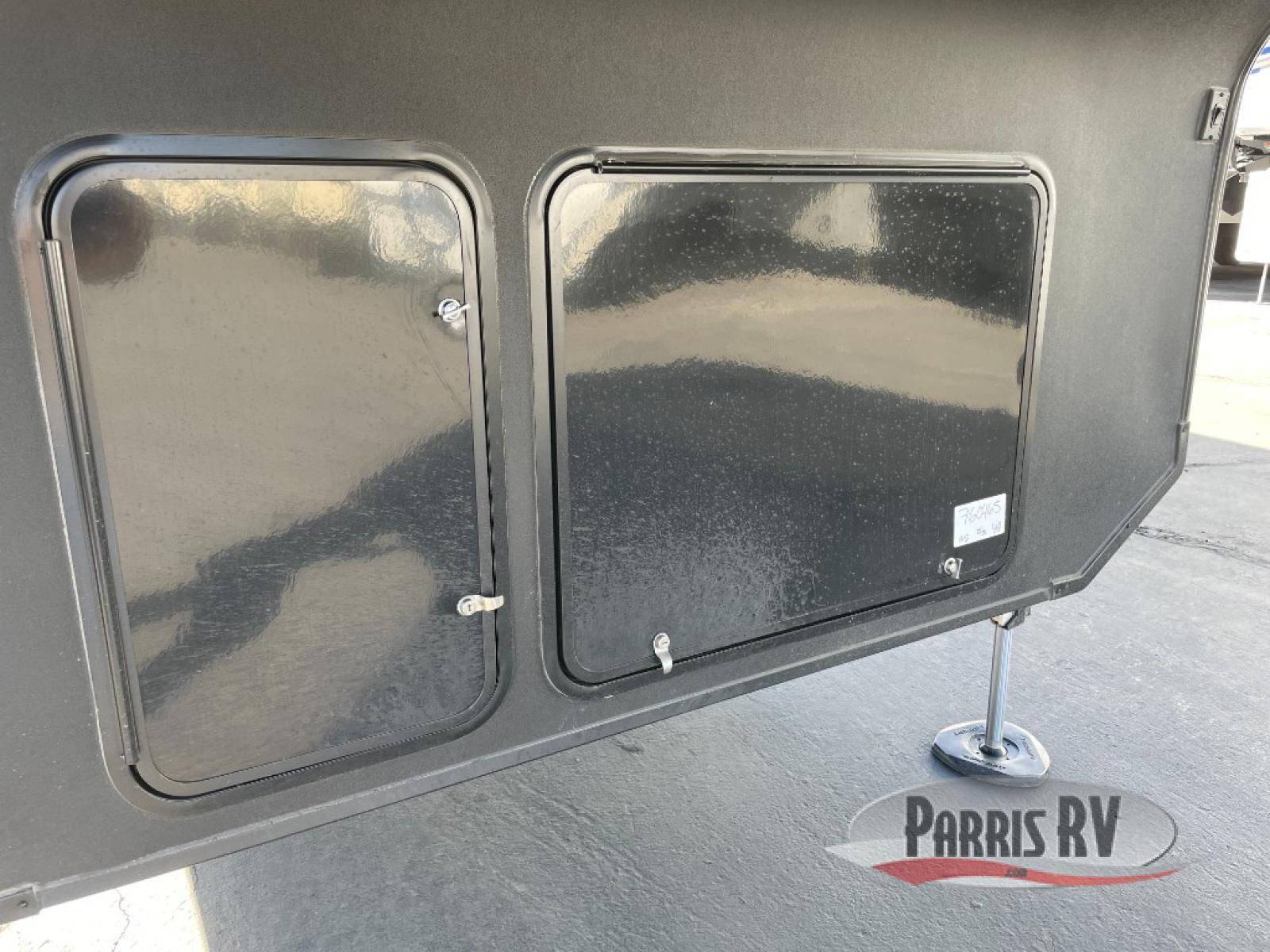 It will be so easy to enjoy trips in this spacious fifth wheel that can sleep six each night! The rear living room features L-shaped sofa slide outs with ottomans, a 65" TV with a large feature wall, and a fireplace to make it cozier. There is a stylish lighted beam and lighted steps that lead to the middle kitchen with dual opposing slides, a kitchen island, triple pantries, and a free-standing dinette. And the chef will appreciate all the kitchen appliances to make their best meals for the whole gang. As you head up the steps, you'll find a full bath to easily freshen up each day, and you'll love the front private bedroom with a king bed slide, master closet with hidden shoe storage, plus stackable washer and dryer prep!