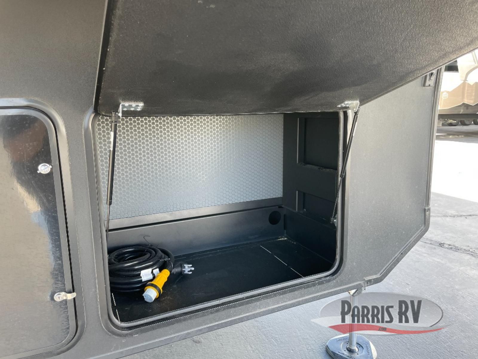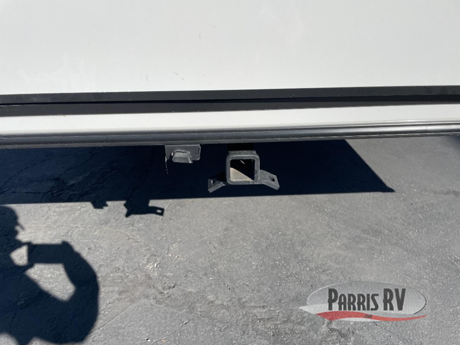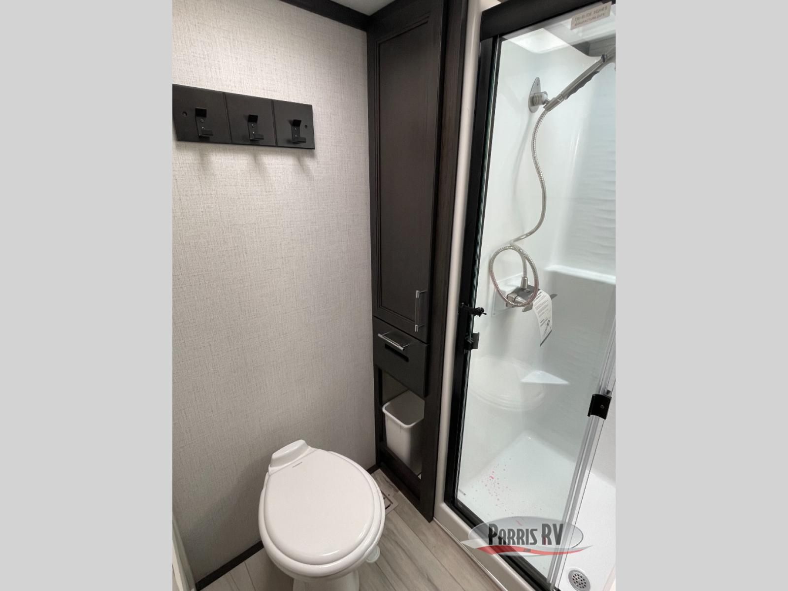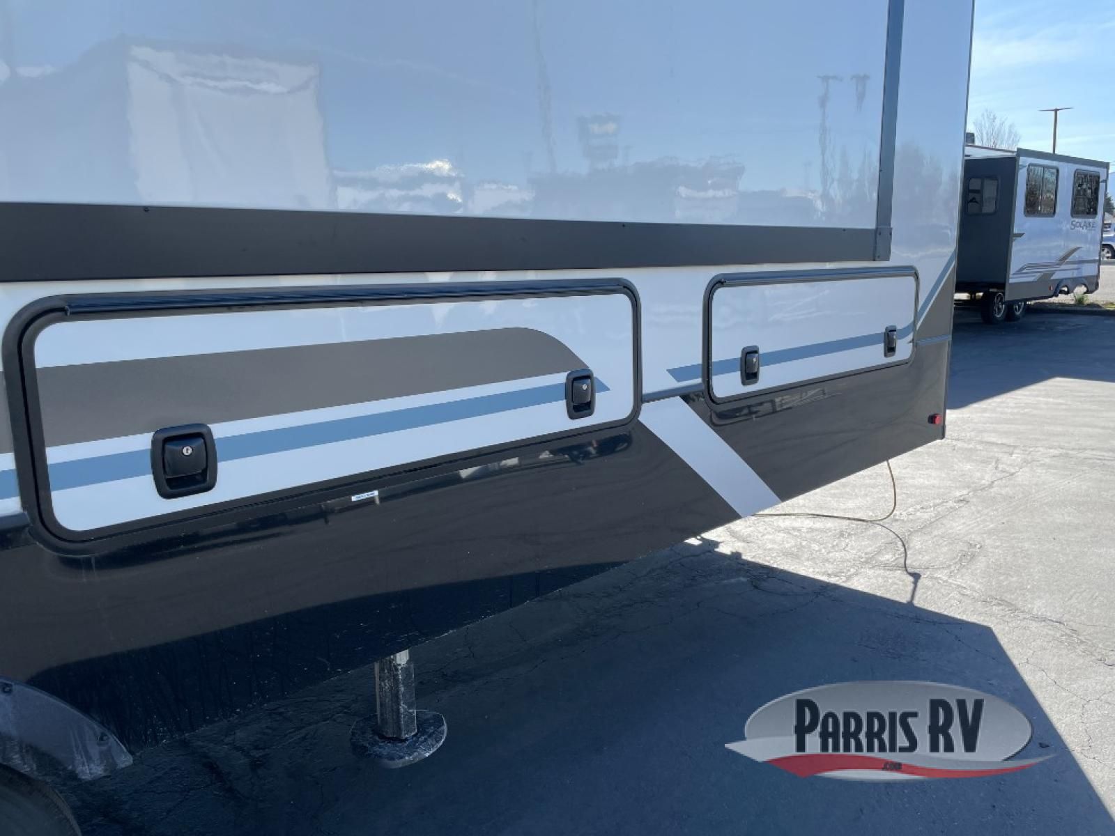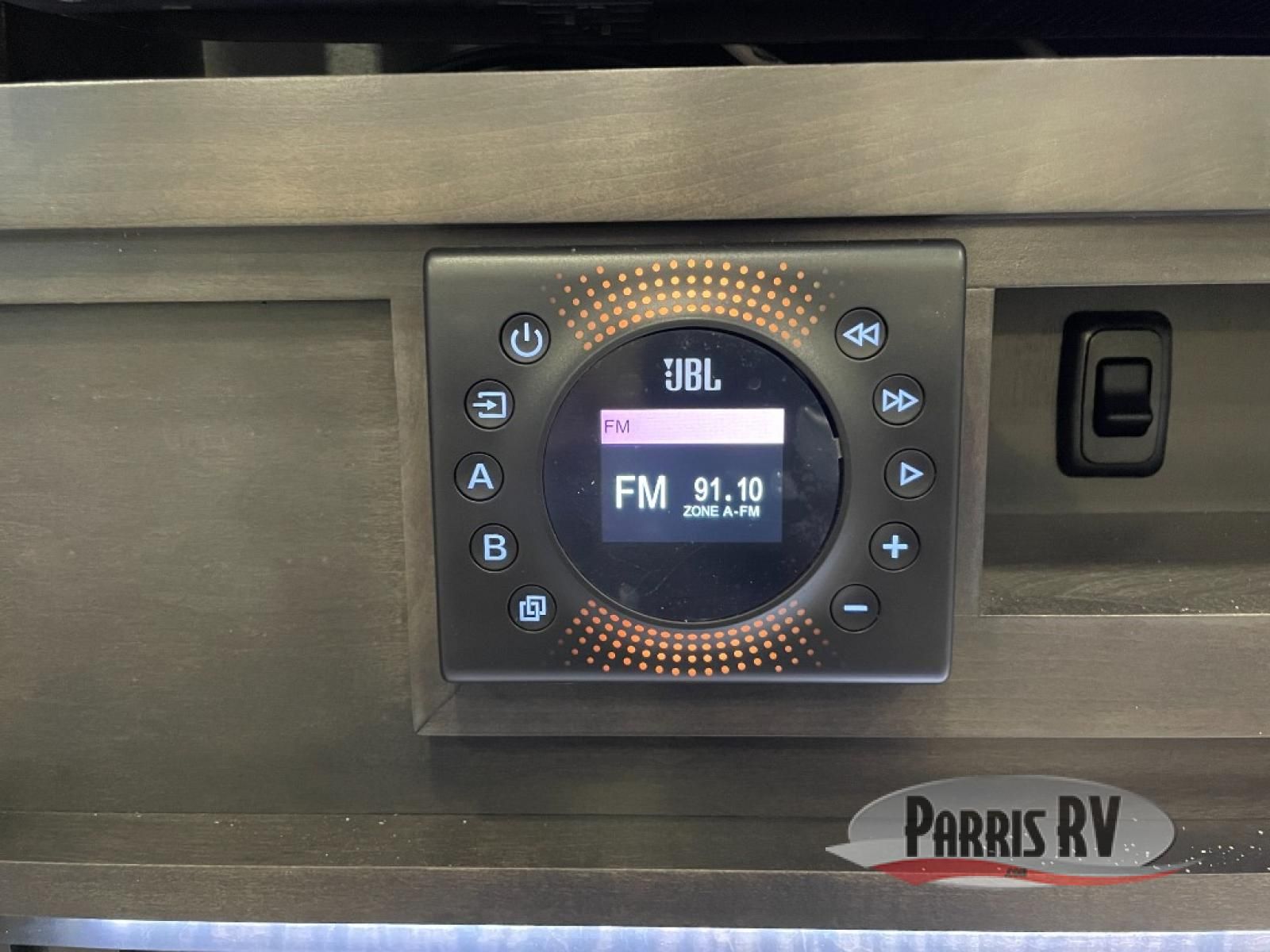 It will be so easy to enjoy trips in this spacious fifth wheel that can sleep six each night! The rear living room features L-shaped sofa slide outs with ottomans, a 65" TV with a large feature wall, and a fireplace to make it cozier. There is a stylish lighted beam and lighted steps that lead to the middle kitchen with dual opposing slides, a kitchen island, triple pantries, and a free-standing dinette. And the chef will appreciate all the kitchen appliances to make their best meals for the whole gang. As you head up the steps, you'll find a full bath to easily freshen up each day, and you'll love the front private bedroom with a king bed slide, master closet with hidden shoe storage, plus stackable washer and dryer prep!