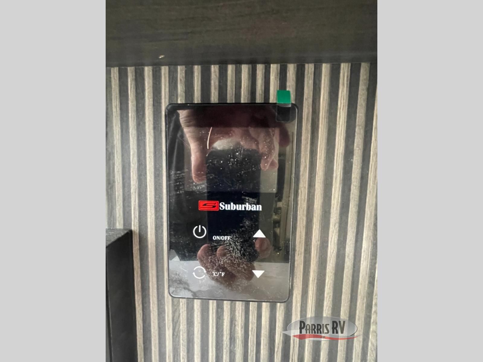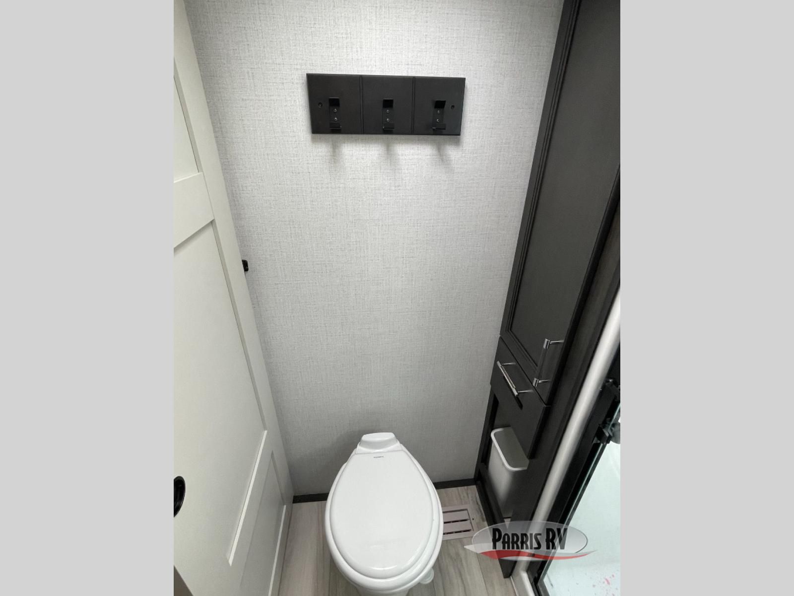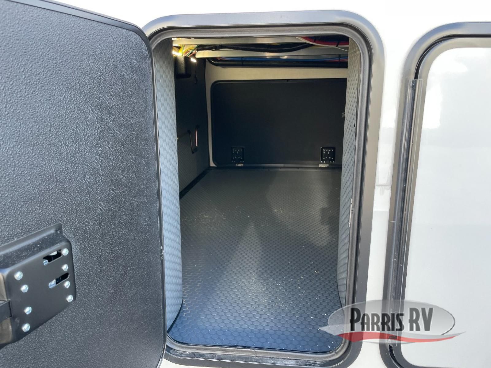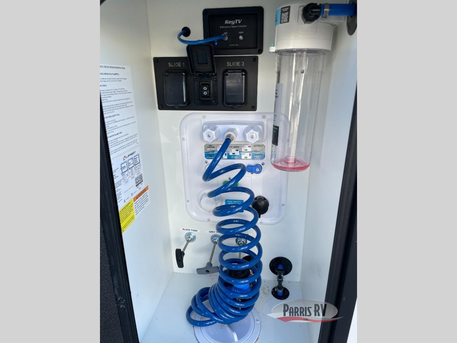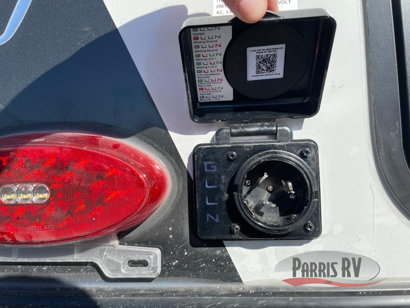 It will be so easy to enjoy trips in this spacious fifth wheel that can sleep six each night! The rear living room features L-shaped sofa slide outs with ottomans, a 65" TV with a large feature wall, and a fireplace to make it cozier. There is a stylish lighted beam and lighted steps that lead to the middle kitchen with dual opposing slides, a kitchen island, triple pantries, and a free-standing dinette. And the chef will appreciate all the kitchen appliances to make their best meals for the whole gang. As you head up the steps, you'll find a full bath to easily freshen up each day, and you'll love the front private bedroom with a king bed slide, master closet with hidden shoe storage, plus stackable washer and dryer prep!