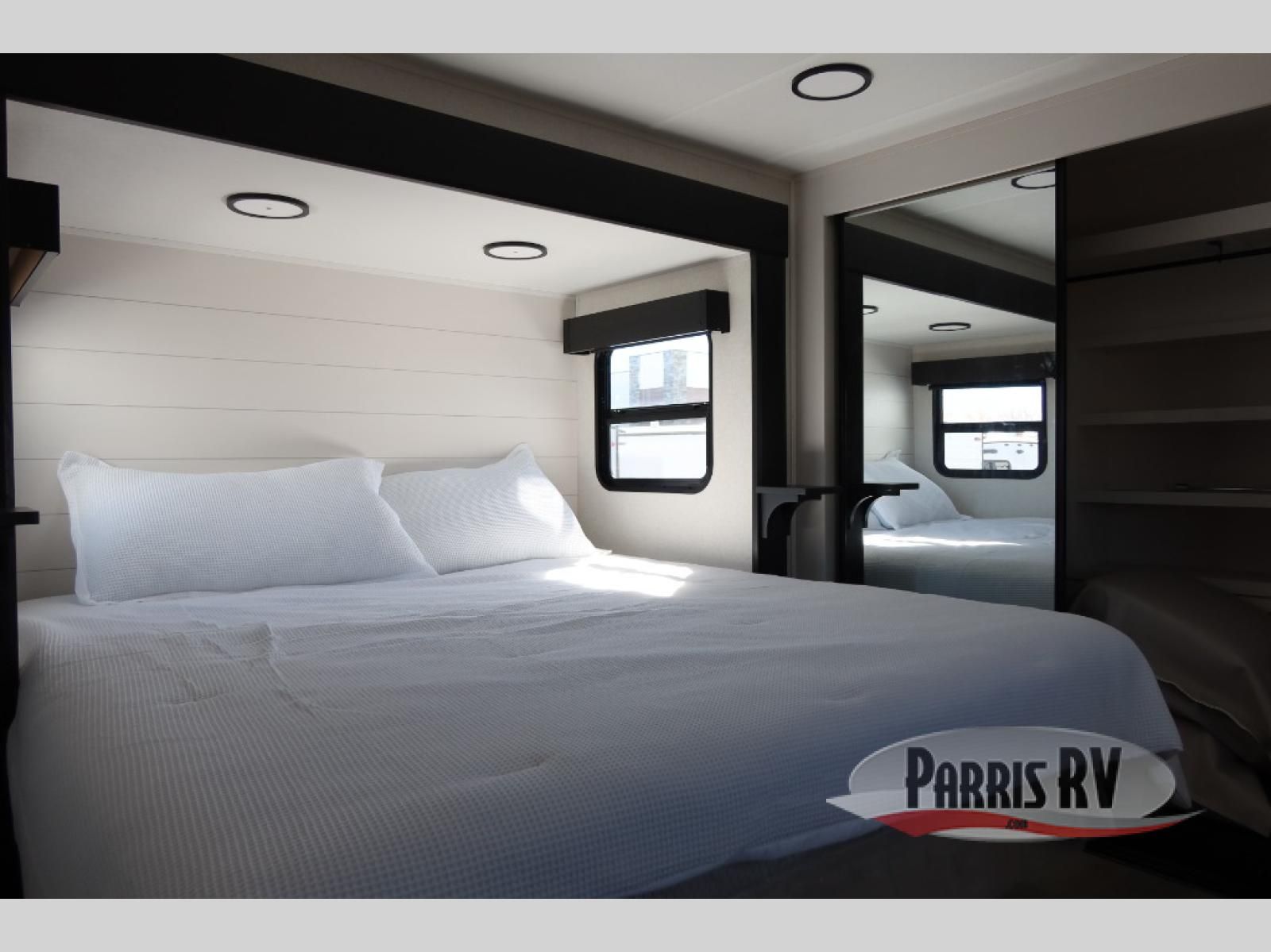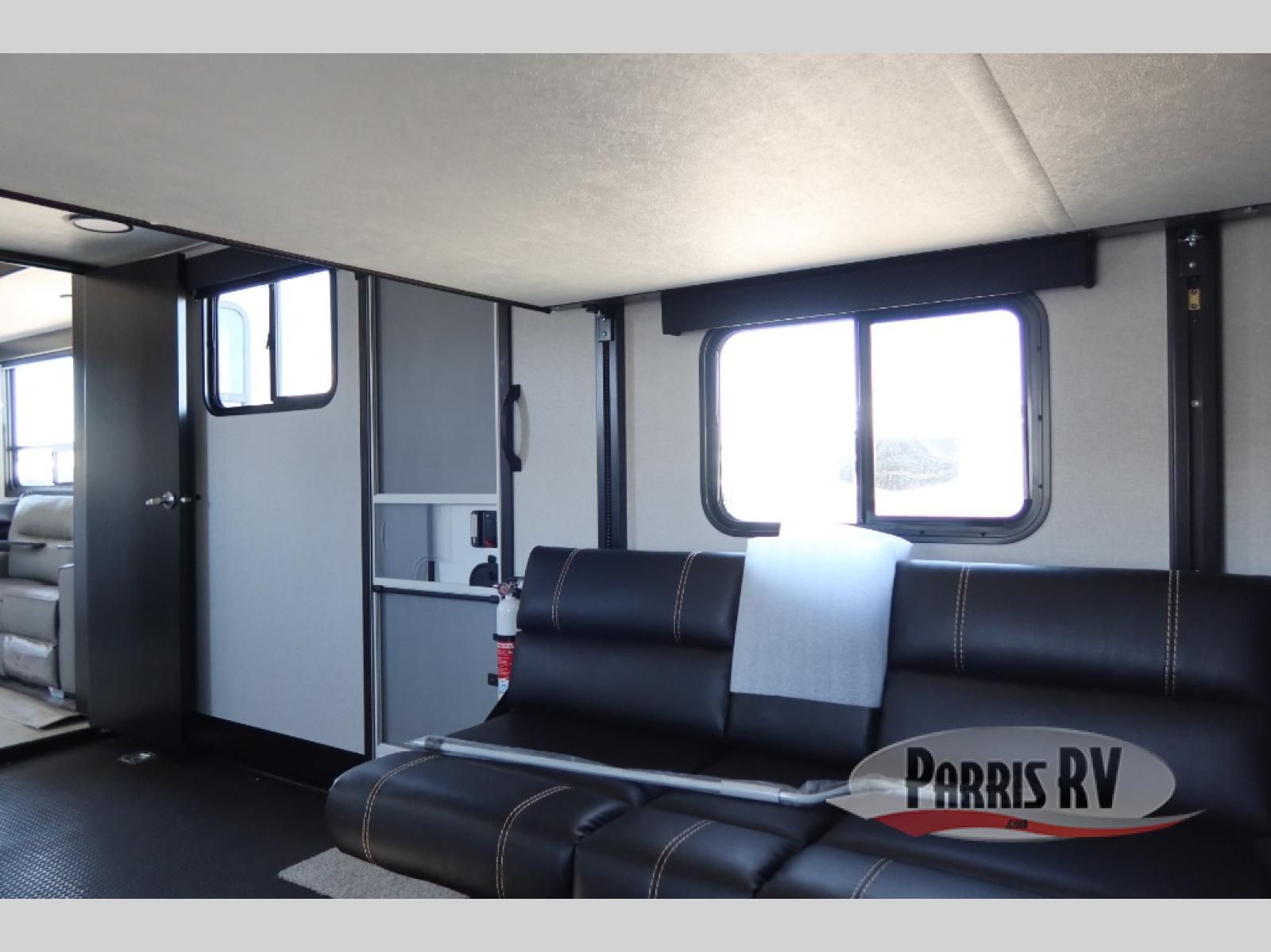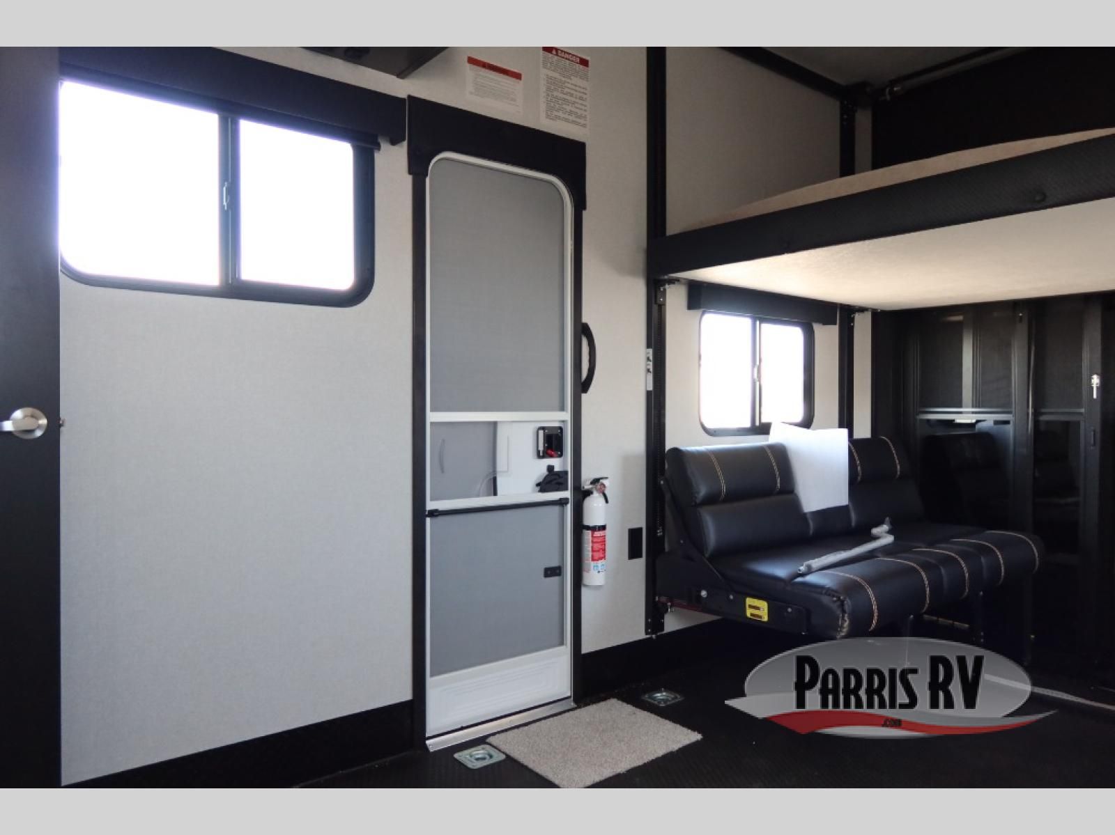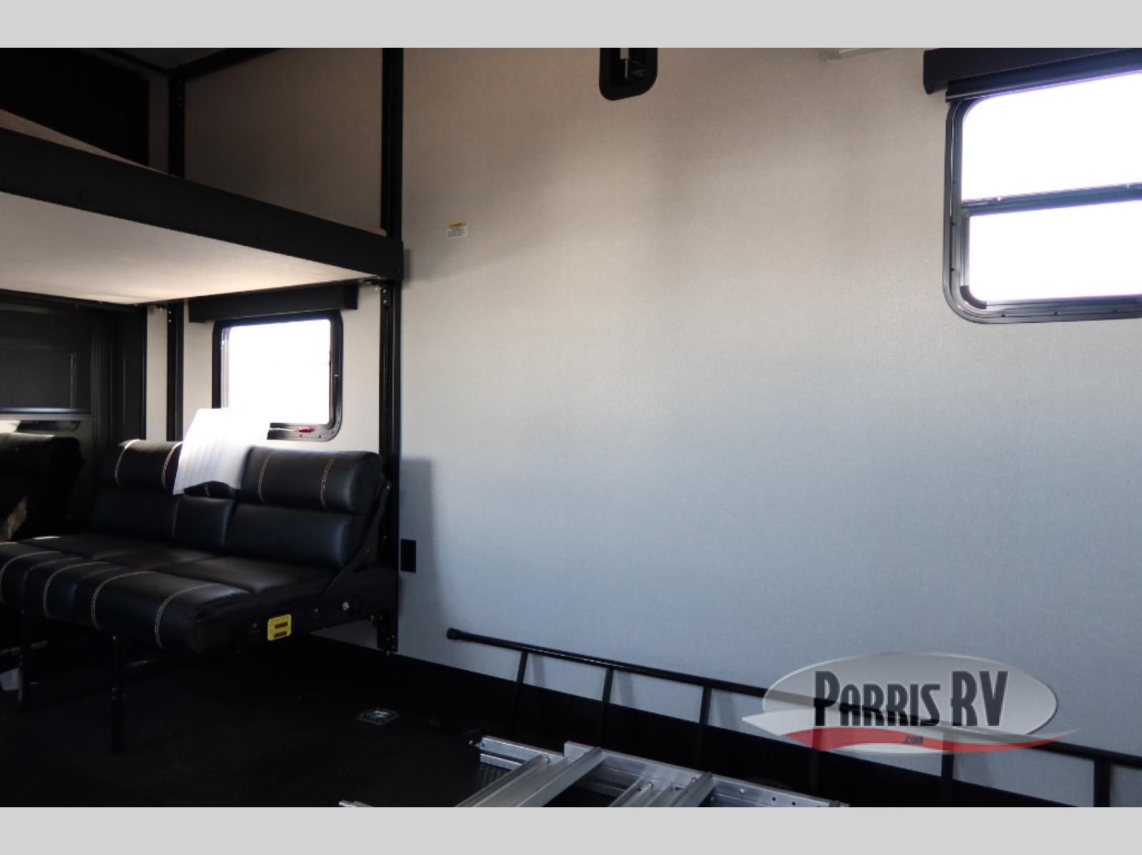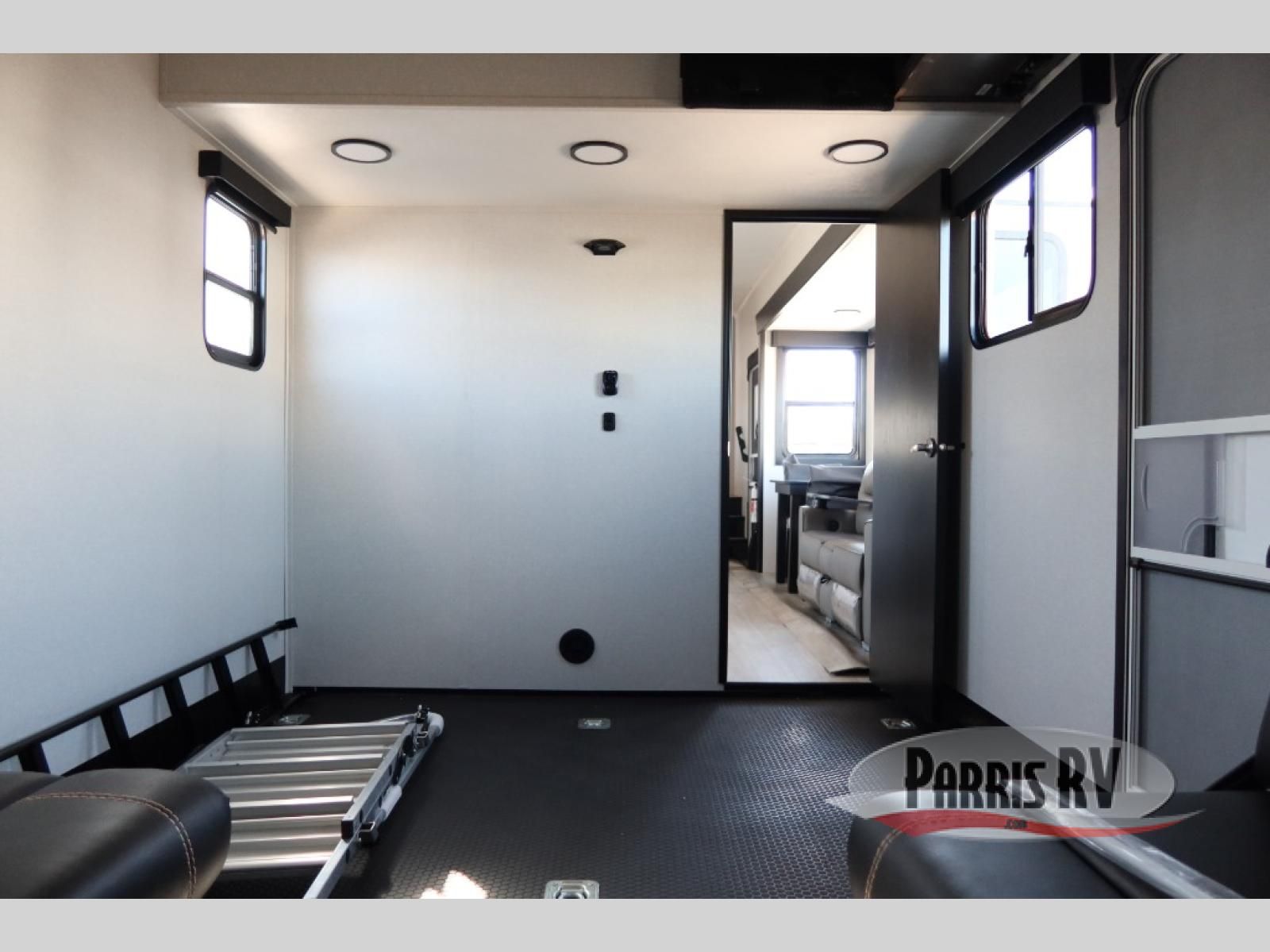 Get on the road with this toy hauler fifth wheel! The 14' garage is a playground for your toys, offering ample space for your ATV, motorcycle, or other gear. The loft above provides additional storage and an electric queen bed for a comfortable rest. The living room is a haven for relaxation, featuring an L-shaped sofa and a theater-style seat perfect for enjoying your favorite shows or movies on the TV. The kitchen is a culinary delight, equipped with a 12V refrigerator, microwave, overhead cabinets, and ample countertop space. The credenza with roll-out table is perfect for meal prep or serving, and the full bathroom provides a private space to freshen up, while the half bath option in the garage gives you more options. The cherry on top is that the front bedroom is a regal retreat, featuring a king bed, drawers, and a spacious walk-in closet.