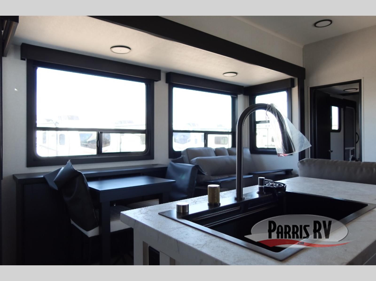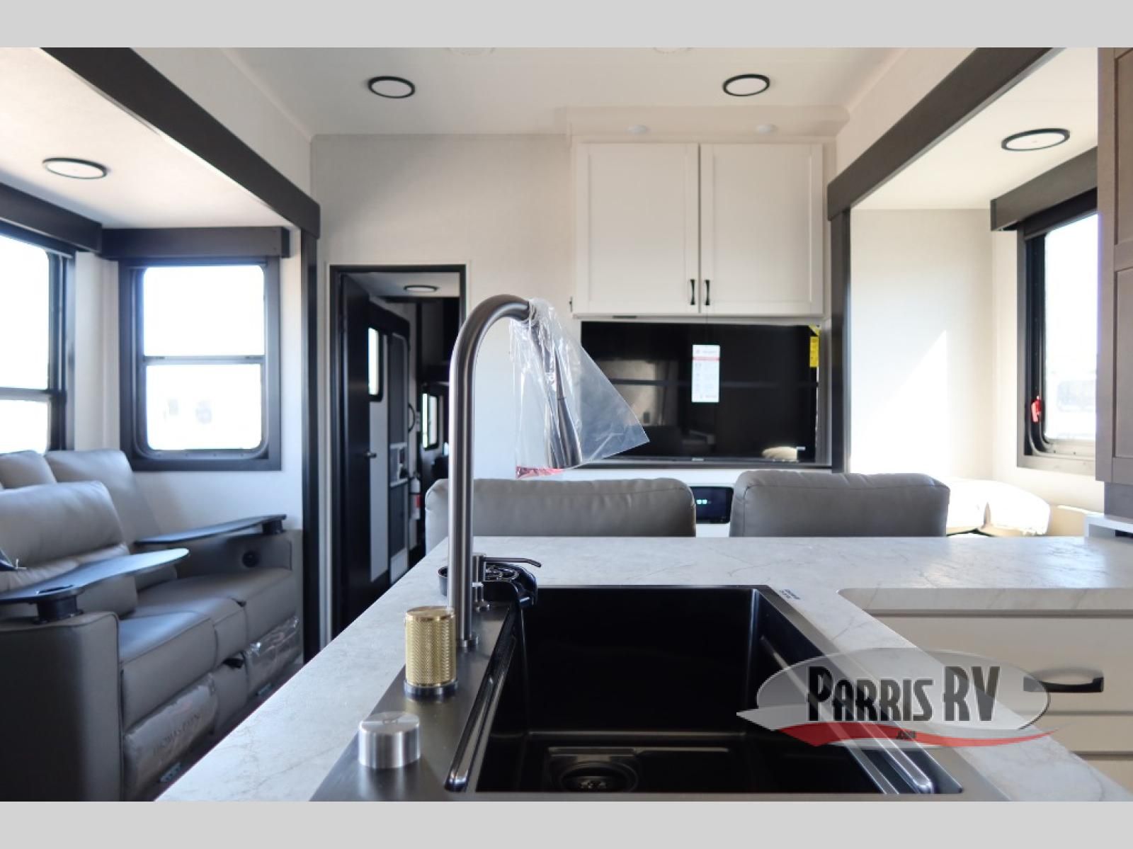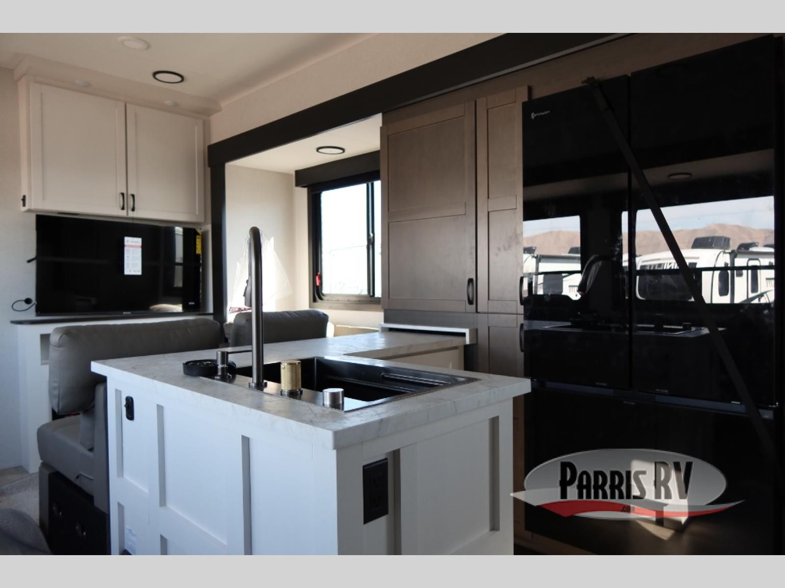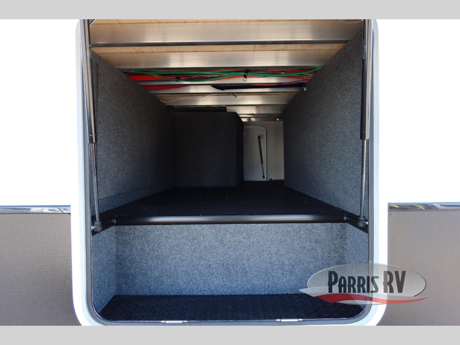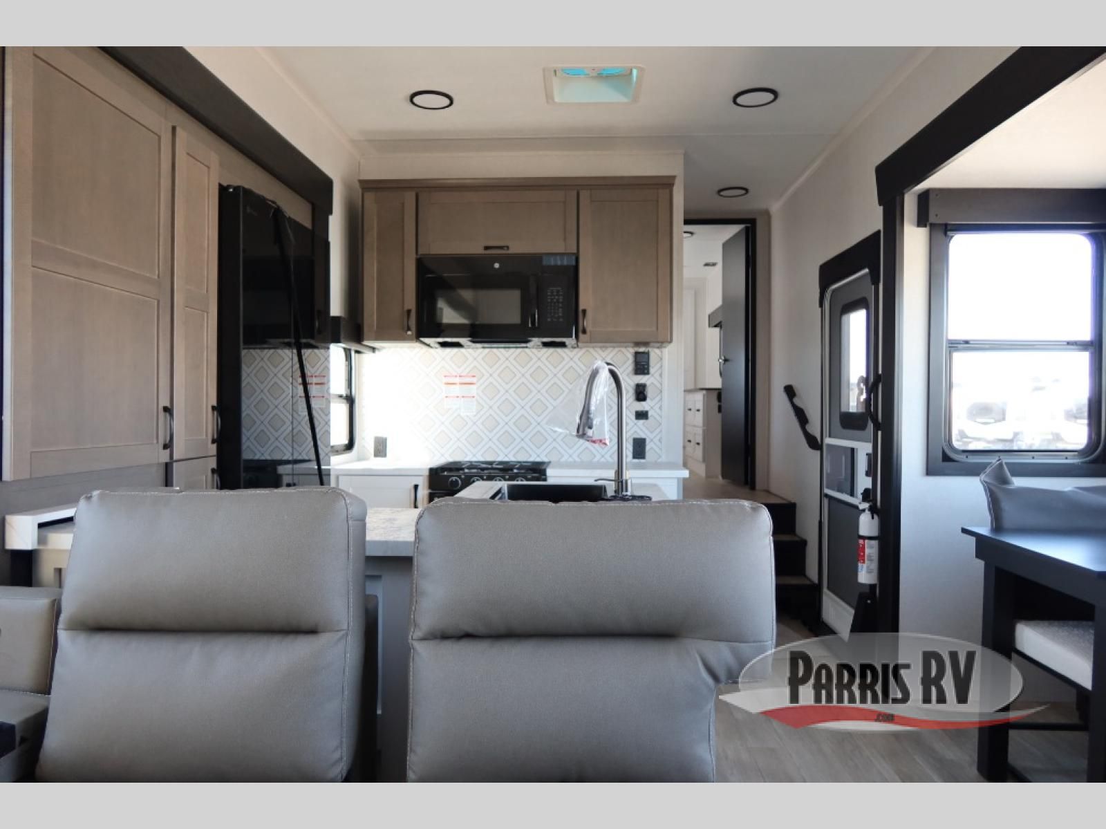 Get on the road with this toy hauler fifth wheel! The 14' garage is a playground for your toys, offering ample space for your ATV, motorcycle, or other gear. The loft above provides additional storage and an electric queen bed for a comfortable rest. The living room is a haven for relaxation, featuring an L-shaped sofa and a theater-style seat perfect for enjoying your favorite shows or movies on the TV. The kitchen is a culinary delight, equipped with a 12V refrigerator, microwave, overhead cabinets, and ample countertop space. The credenza with roll-out table is perfect for meal prep or serving, and the full bathroom provides a private space to freshen up, while the half bath option in the garage gives you more options. The cherry on top is that the front bedroom is a regal retreat, featuring a king bed, drawers, and a spacious walk-in closet.