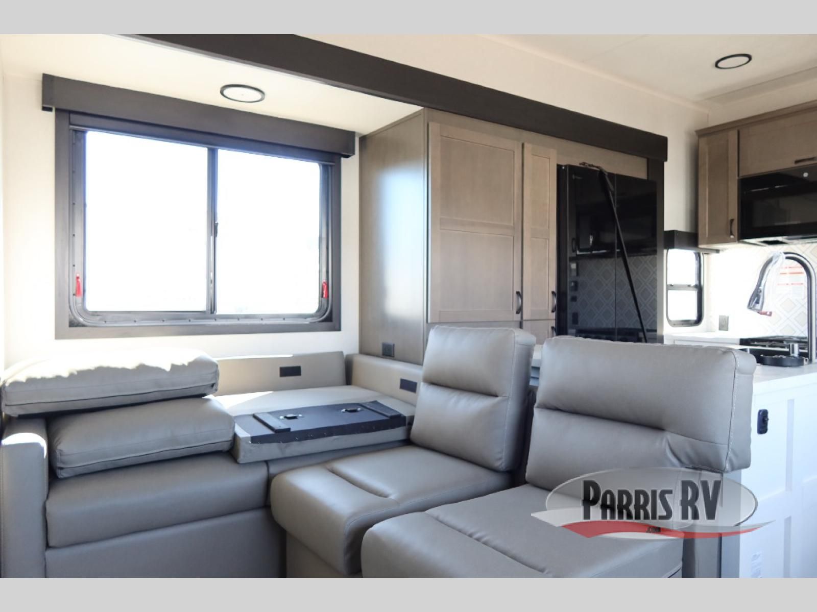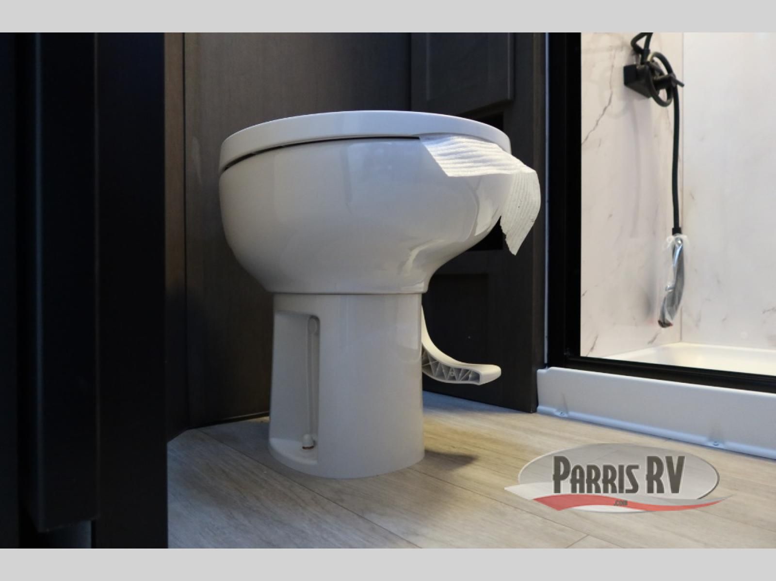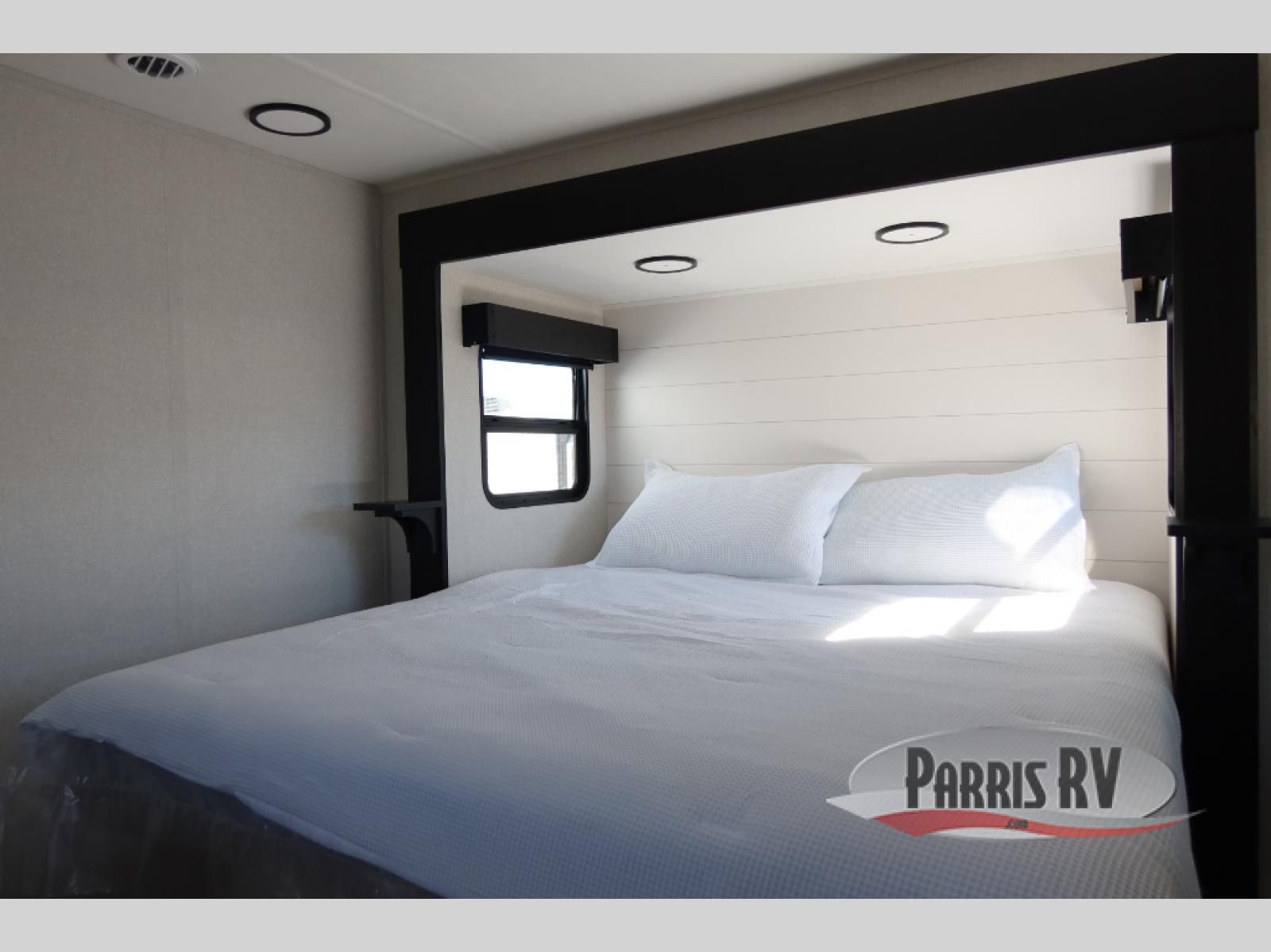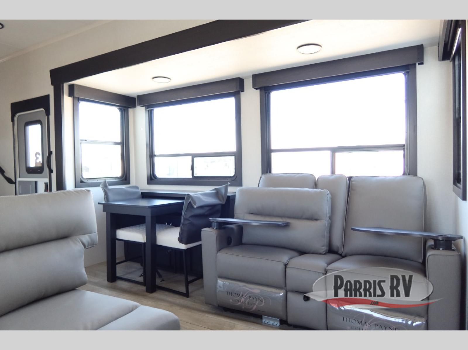 Get on the road with this toy hauler fifth wheel! The 14' garage is a playground for your toys, offering ample space for your ATV, motorcycle, or other gear. The loft above provides additional storage and an electric queen bed for a comfortable rest. The living room is a haven for relaxation, featuring an L-shaped sofa and a theater-style seat perfect for enjoying your favorite shows or movies on the TV. The kitchen is a culinary delight, equipped with a 12V refrigerator, microwave, overhead cabinets, and ample countertop space. The credenza with roll-out table is perfect for meal prep or serving, and the full bathroom provides a private space to freshen up, while the half bath option in the garage gives you more options. The cherry on top is that the front bedroom is a regal retreat, featuring a king bed, drawers, and a spacious walk-in closet.