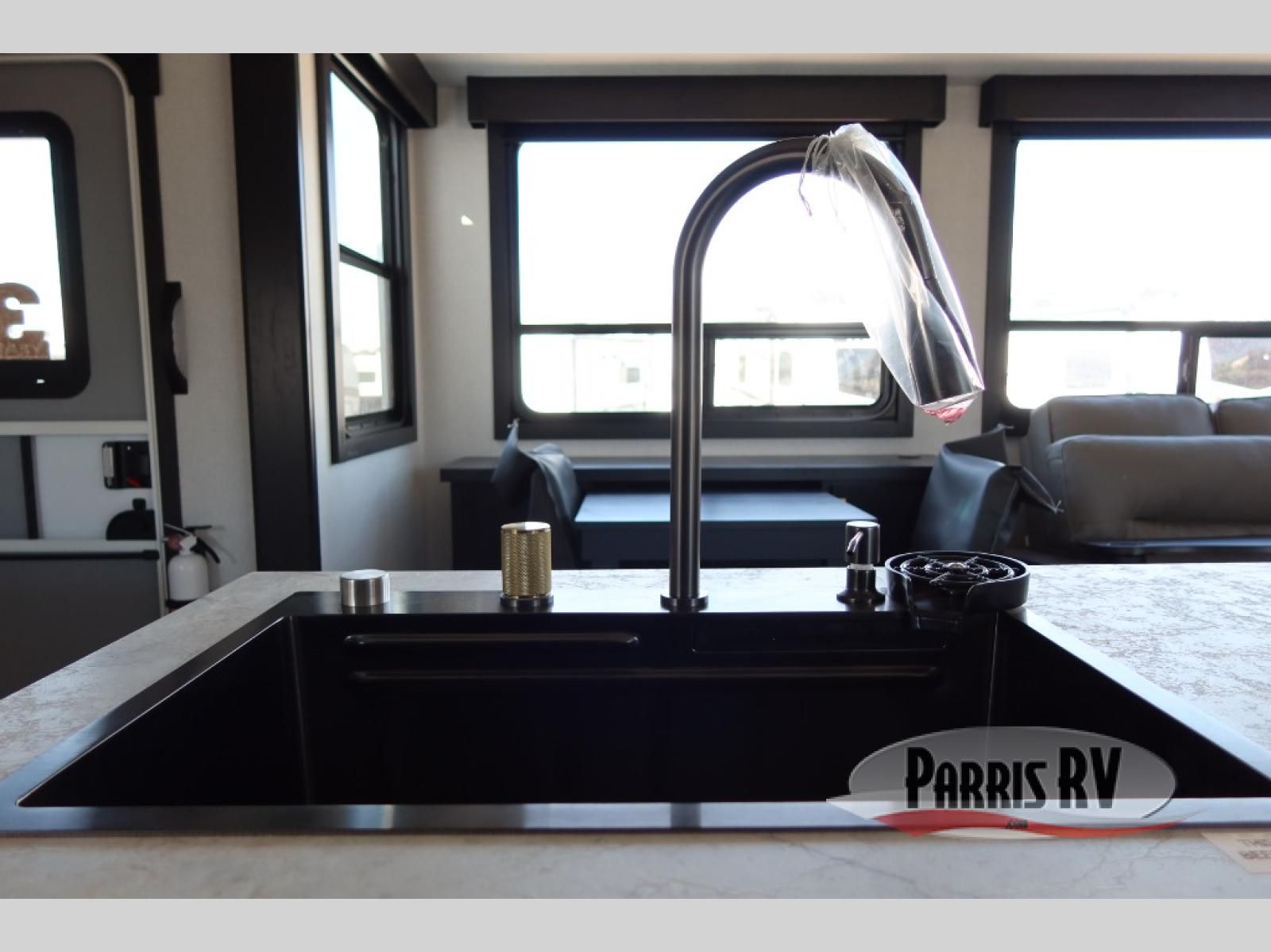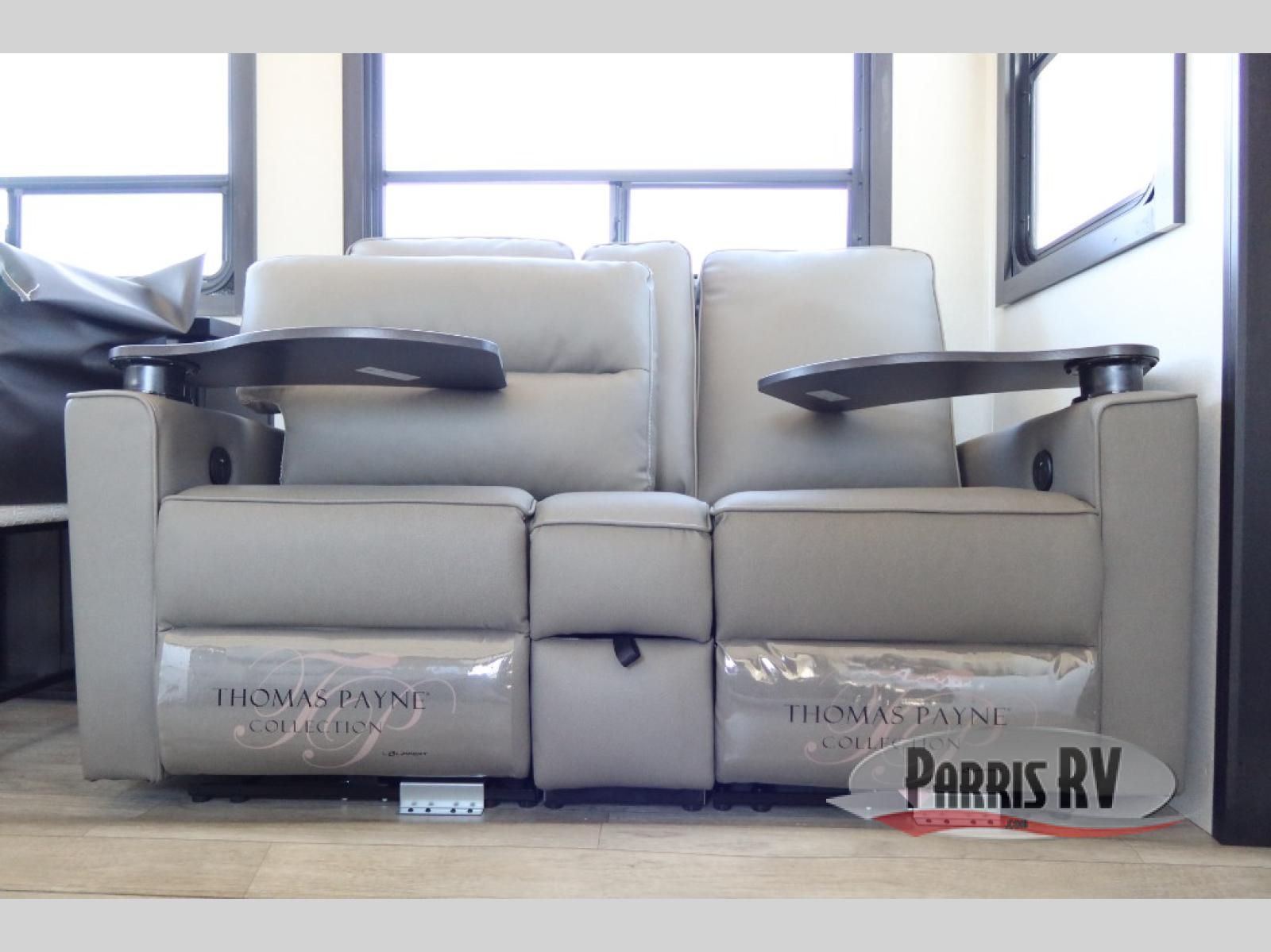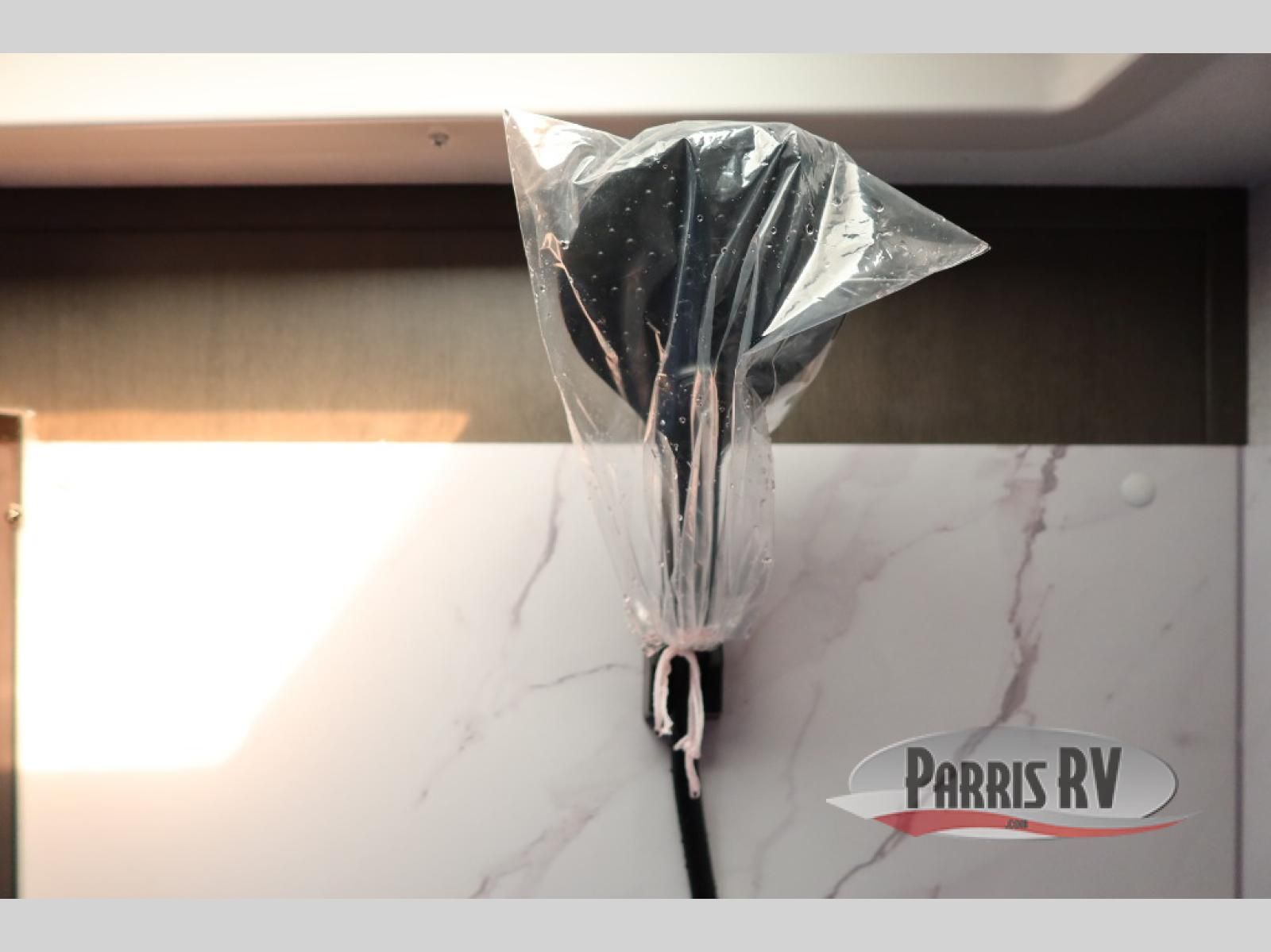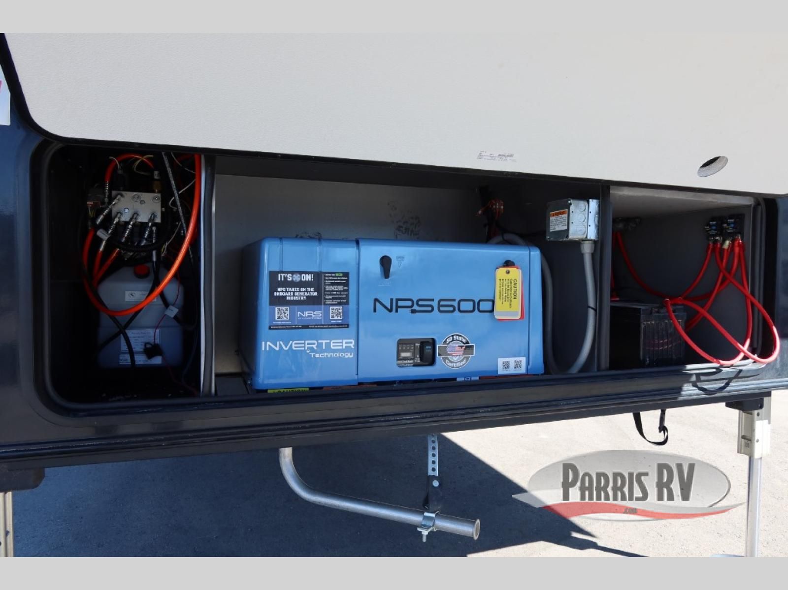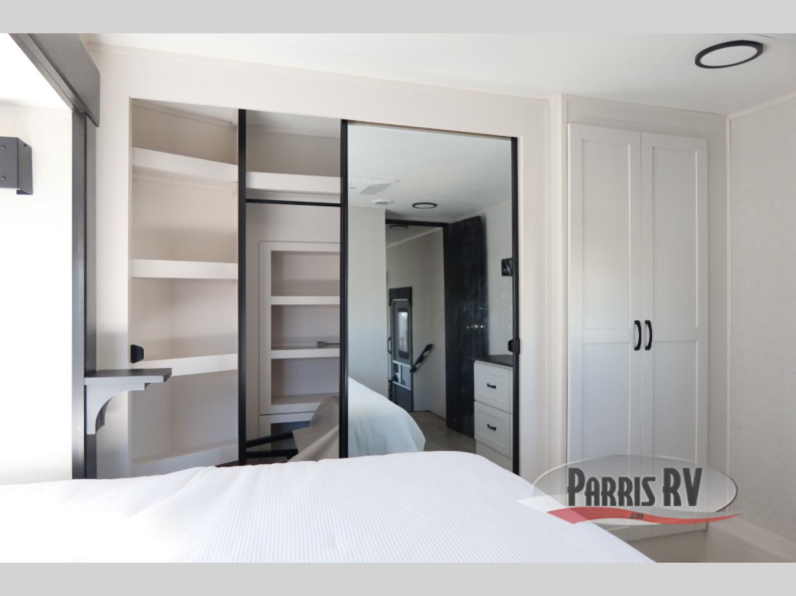 Get on the road with this toy hauler fifth wheel! The 14' garage is a playground for your toys, offering ample space for your ATV, motorcycle, or other gear. The loft above provides additional storage and an electric queen bed for a comfortable rest. The living room is a haven for relaxation, featuring an L-shaped sofa and a theater-style seat perfect for enjoying your favorite shows or movies on the TV. The kitchen is a culinary delight, equipped with a 12V refrigerator, microwave, overhead cabinets, and ample countertop space. The credenza with roll-out table is perfect for meal prep or serving, and the full bathroom provides a private space to freshen up, while the half bath option in the garage gives you more options. The cherry on top is that the front bedroom is a regal retreat, featuring a king bed, drawers, and a spacious walk-in closet.