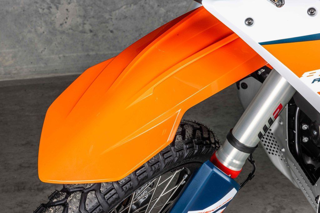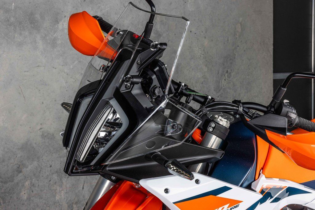 Inspired by the Dakar-winning KTM 450 RALLY, a striking front end gives the KTM 890 ADVENTURE R true READY TO RACE looks. In addition, the structure below the fairing makes use of 2 forged aluminum brackets that provide maximum stiffness to the front mask, windshield, and instrument tower. This, along with using in-mold graphics for durability and a high front fender to keep the front wheel rotating freely in heavy dirt, makes the KTM 890 ADVENTURE R ready for any adventure.