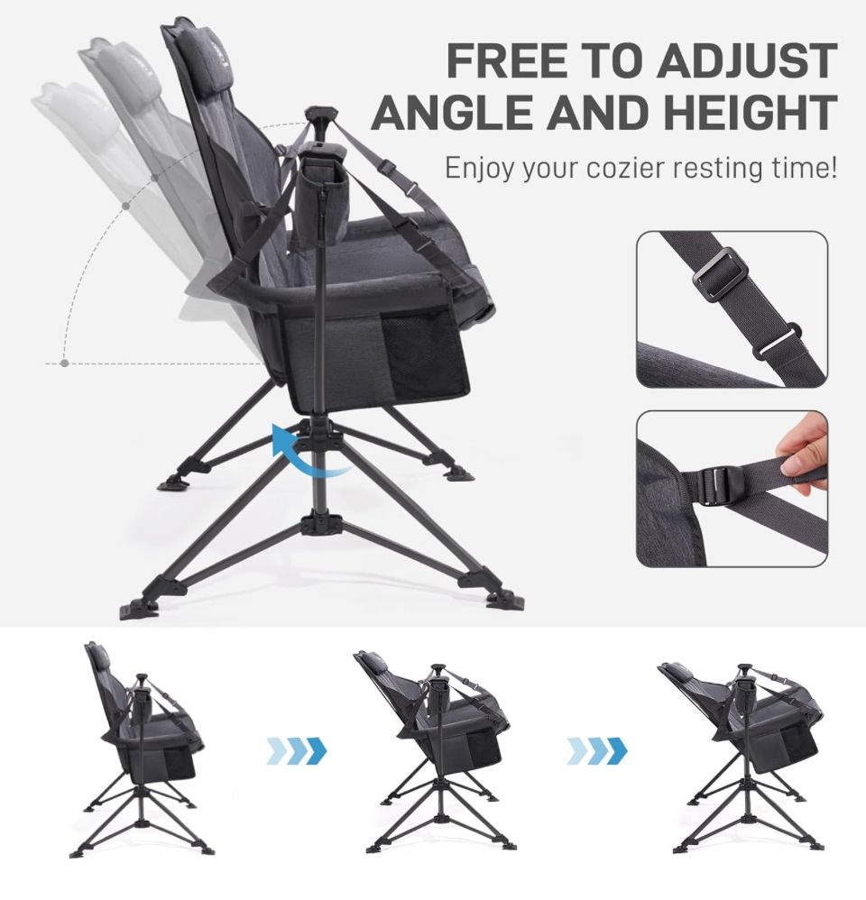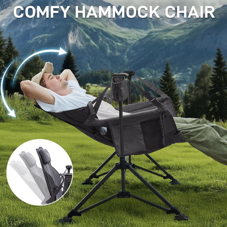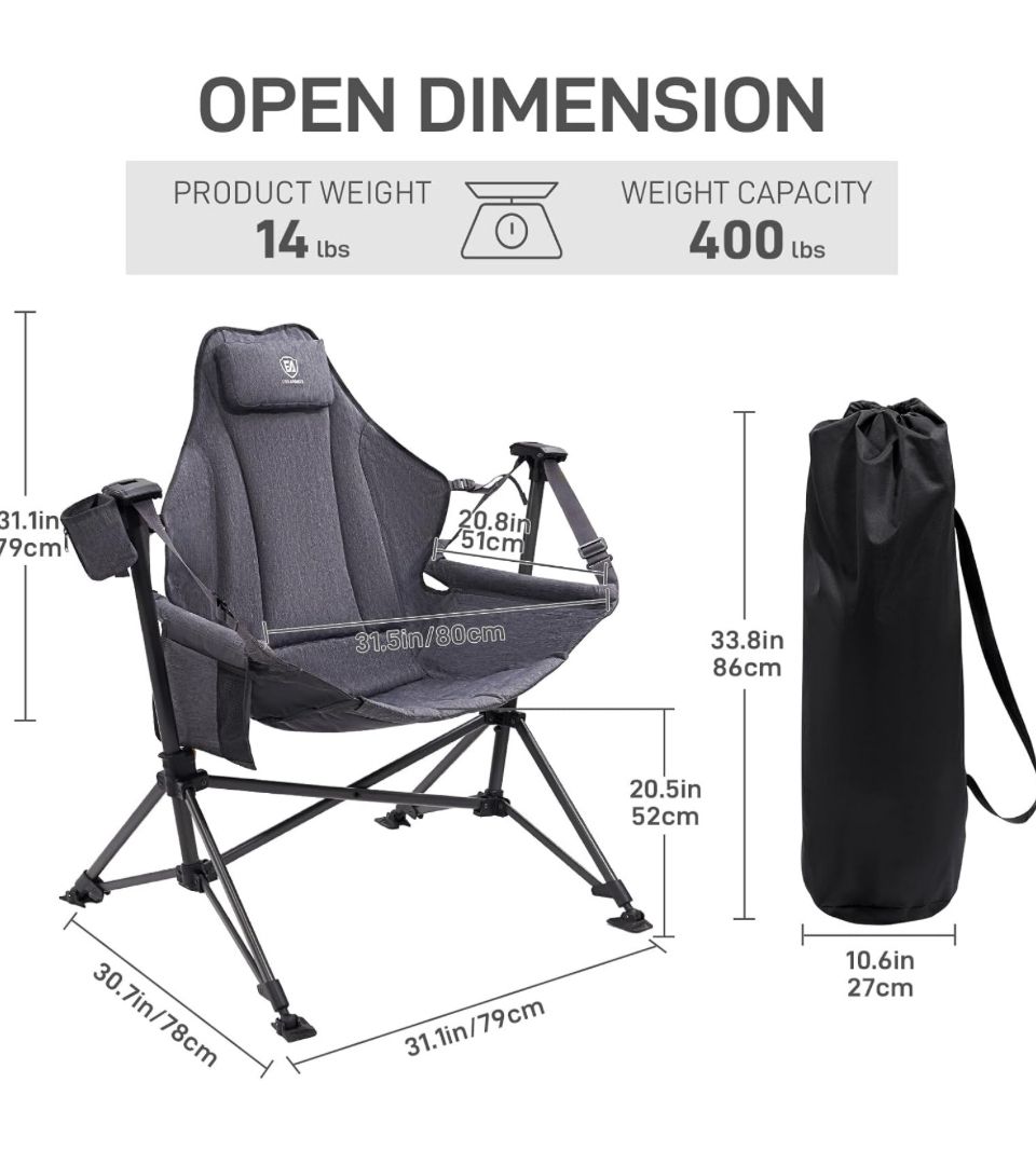 Oversized& Padded for Comfort: Made of softer, breathable and comfortable fabrics, with few padded cushion inside for extra comfort. Our oversized hammock chair measures 31.5in for the seat surface, which will provide you with a roomy seat area to sit freely even cross-legged or wiggle around unrestricted. Adjustable Design: This camping swing chair's seat height and backrest angle can be easily adjusted to your liking. Put your hands on the side armrests and you can enjoy a relaxing rocking time anywhere you want. Comes with a detachable cup holder,you can place it on the left or right side depending on your preferences. 400LBS: The frame of rocking chair outdoor is made of high-quality iron pipe, designed as a triangular stabilizing structure, can bear up to 400lbs, very strong and stable. While remaining stable and sturdy, it is also portable and comes with a carry bag, so you can easily take this chair on the go! 5s Set Up: No need for complicated installation, you just need to lift both ends of the bracket with both hands upward, the bracket will be unfolded under the force of gravity and locked automatically, and then finally put on the chair surface. Safe and convenient. Multi Purpose Uses: EVER ADVANCED rocker camping chairs for adults that is built for anywhere: Enjoy your freely swing relaxing time whether indoor or outdoor.