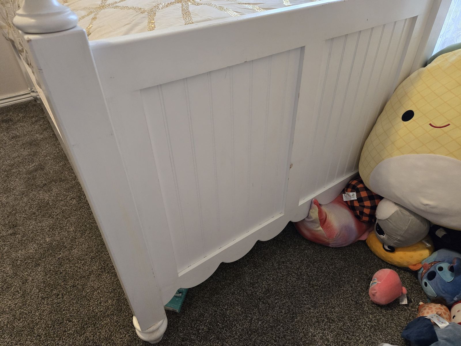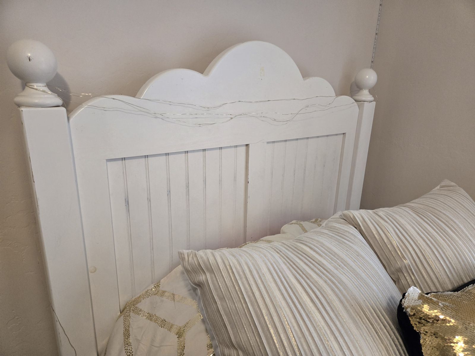 This custom made solid wood twin size bed is the perfect addition to your child's room. Features stylish scalloped edges and bead board detail. This bed has been used through my 2 girls. Has a little where and tear as with any used item, but in otherwise good condition.