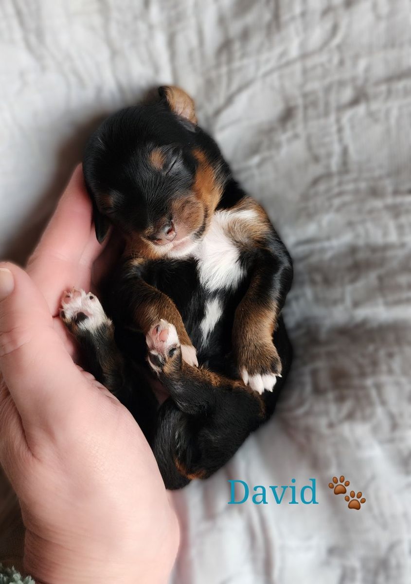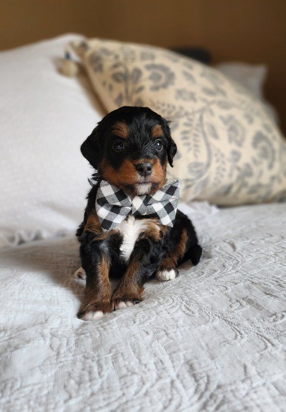 ZelleMeet darling David, a smallest of his litter. David is a small Mini Bernedoodle with classic tri-color markings and blocky structure features many Bernedoodle families look for. Paired with a soft, wavy fleece coat are the low to non-shedding qualities making him a great fit for those who have allergy-considerations. David has a balanced, medium energy level that adapts perfectly to a variety of needs and desires. He’s expected to mature into a Mini Bernedoodle, likely in the 20–25 pound range—sturdy enough for everyday adventures, yet still easy to take along wherever life leads. Raised right in our home with intentional care and plenty of love, David is growing with his litter into being a fun-loving affectionate pup. We follow thoughtful puppy-raising protocols to help her transition smoothly into his new home, including early crate training, house training foundations, socialization, and introductions to the basics. For those living at a distance, we’re happy to help coordinate safe travel options, including flight nanny or ground delivery. David will be ready the first week of April, just in time for fantastic outdoor weather. Reach out to meet David in person or set up a video call.