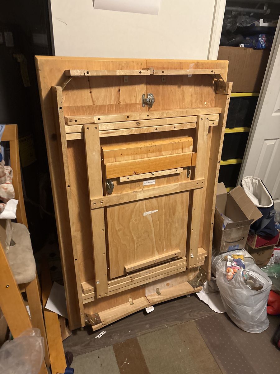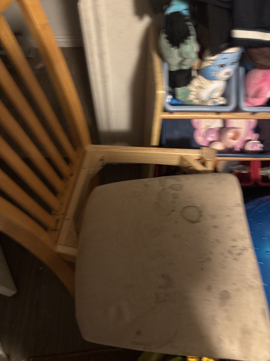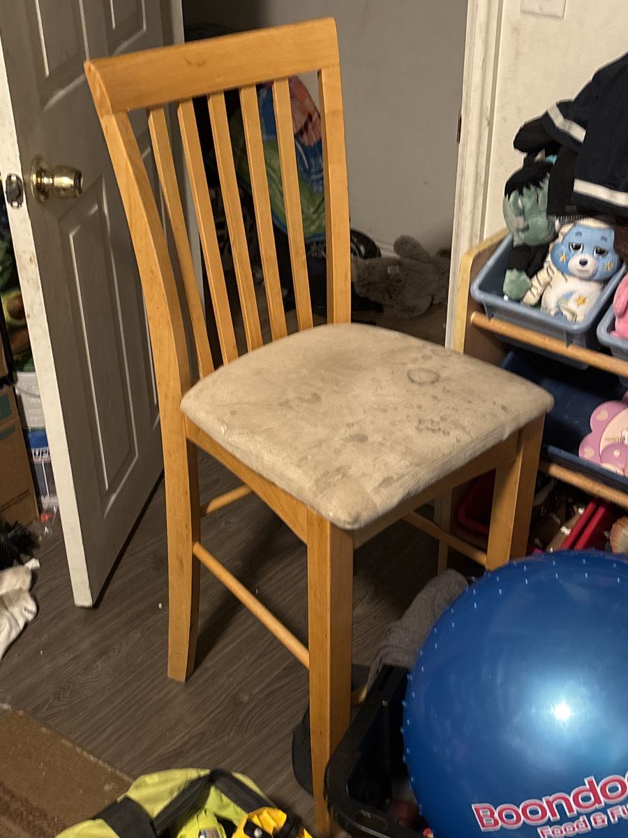 GooglePayis a hardwood, high table and chairs. It's very high-quality. I think it's maple, but I'm not sure. This set has seen a lot of abuse and use, but there is still a ton of life left. For someone who has minimum basic skills, you can restore this and have a set that's worth well over $1000. It has a built-in extension leaf under the table.
