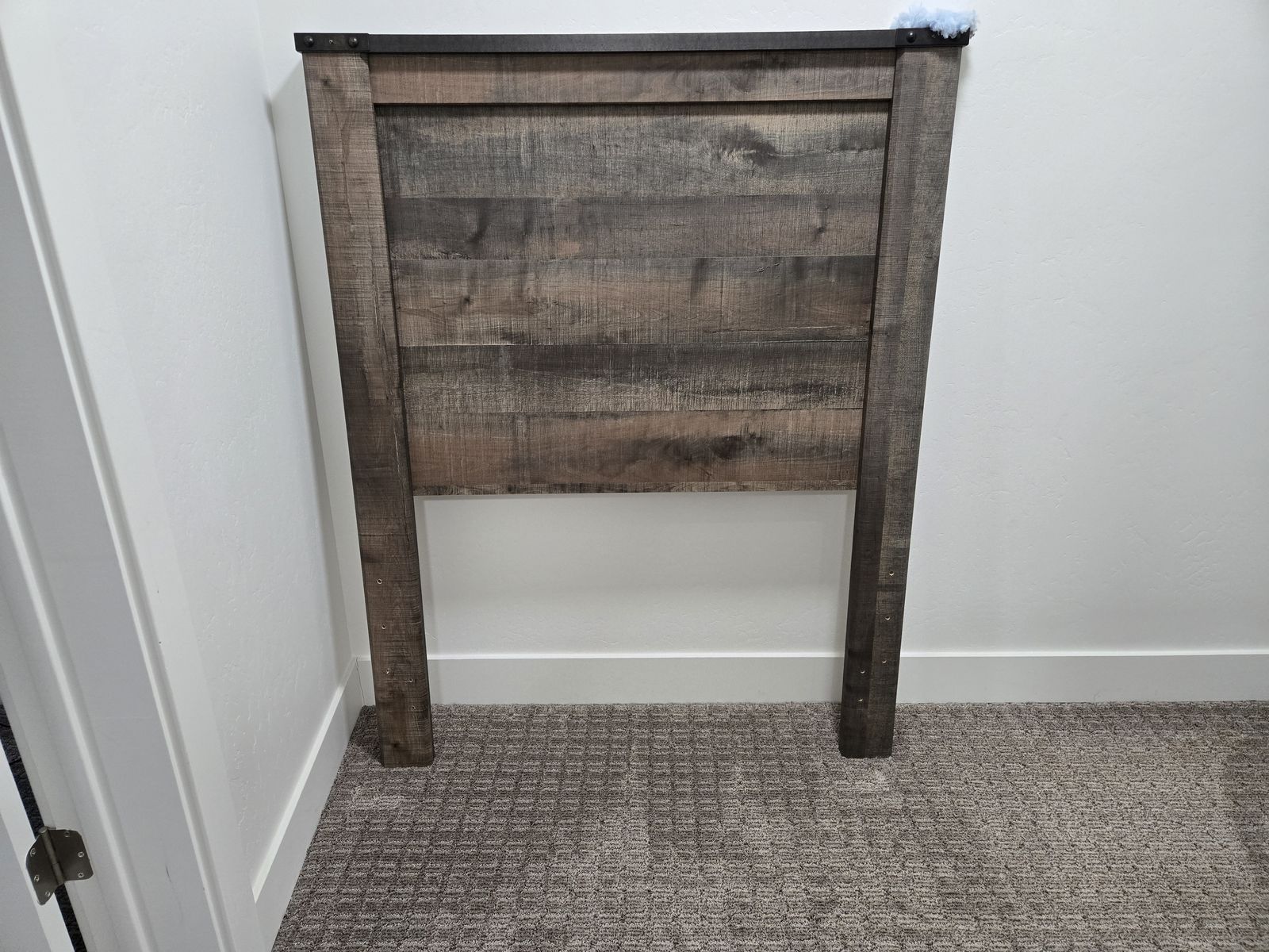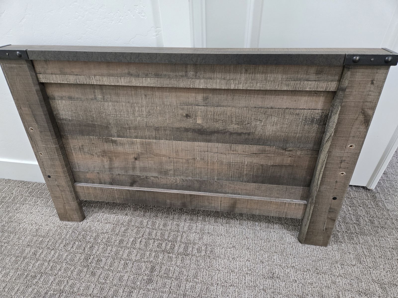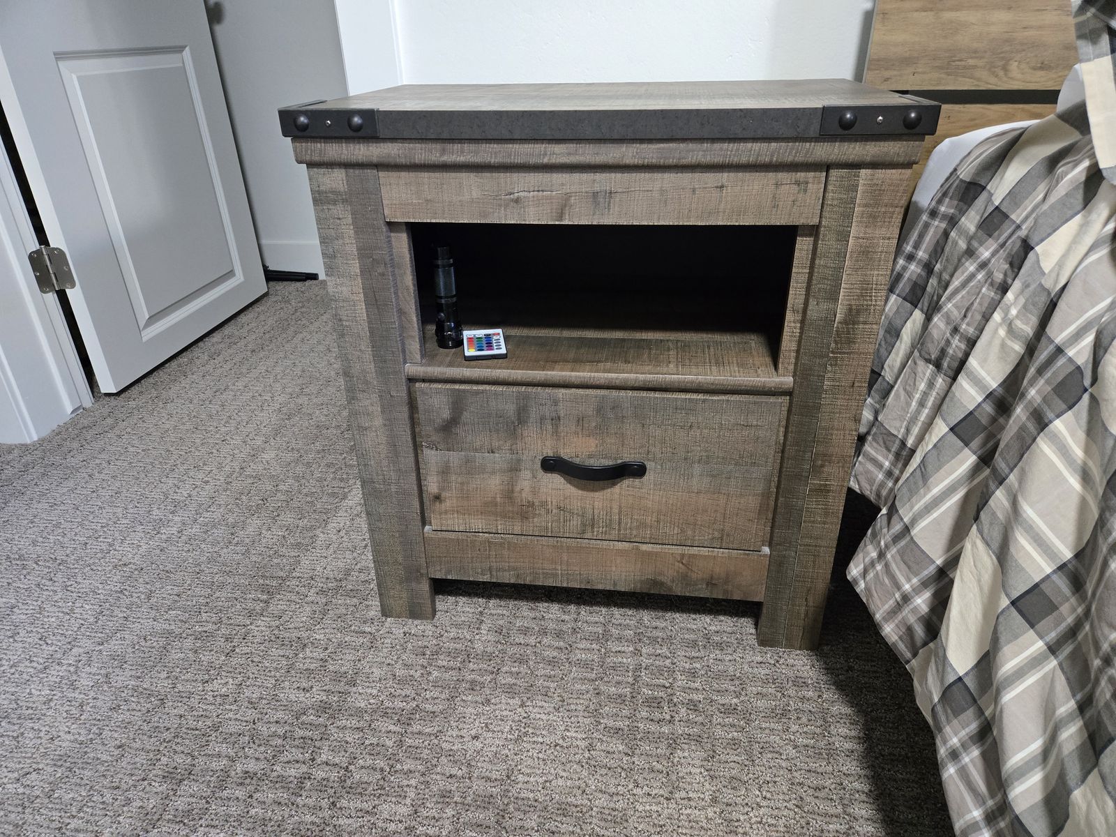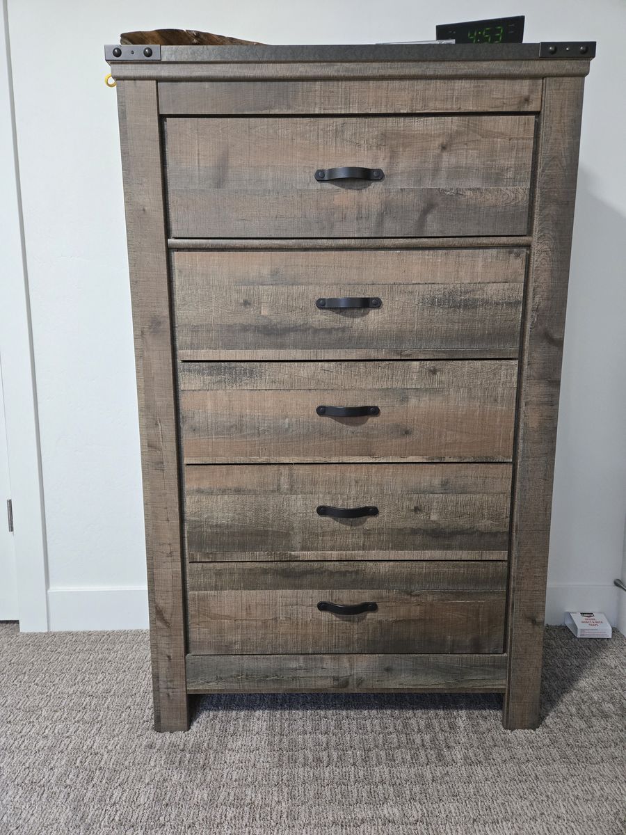 This set is in perfect condition. Hardly used at all. Originally bought at Ashley Furniture. Features a rustic wood look with metal details on edges. Night stand features usb chargers in the back as well. Includes, headboard, footboard, bed rails, Dresser, and nightstand.