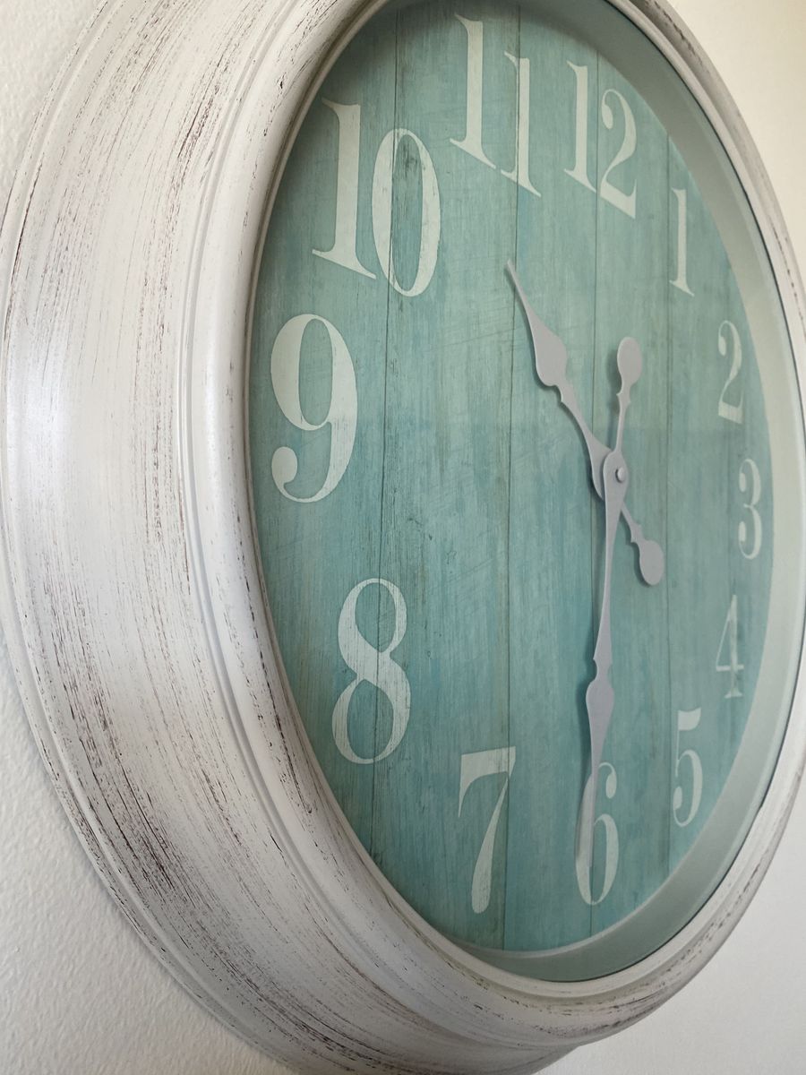 Approximately 22 inches across wall clock in excellent working condition. Cream/Aqua. Comes from a clean house. Pick up in Clinton. Only $20