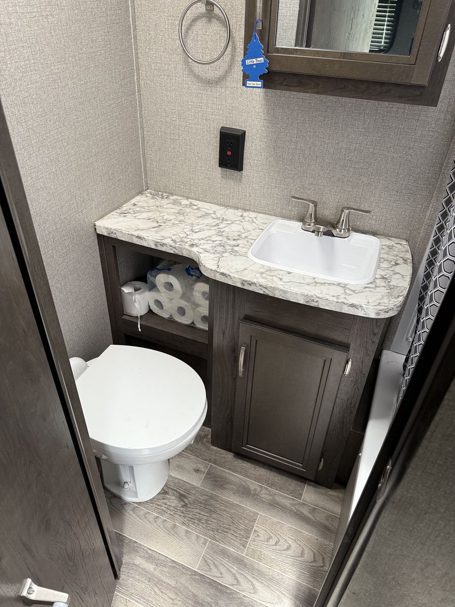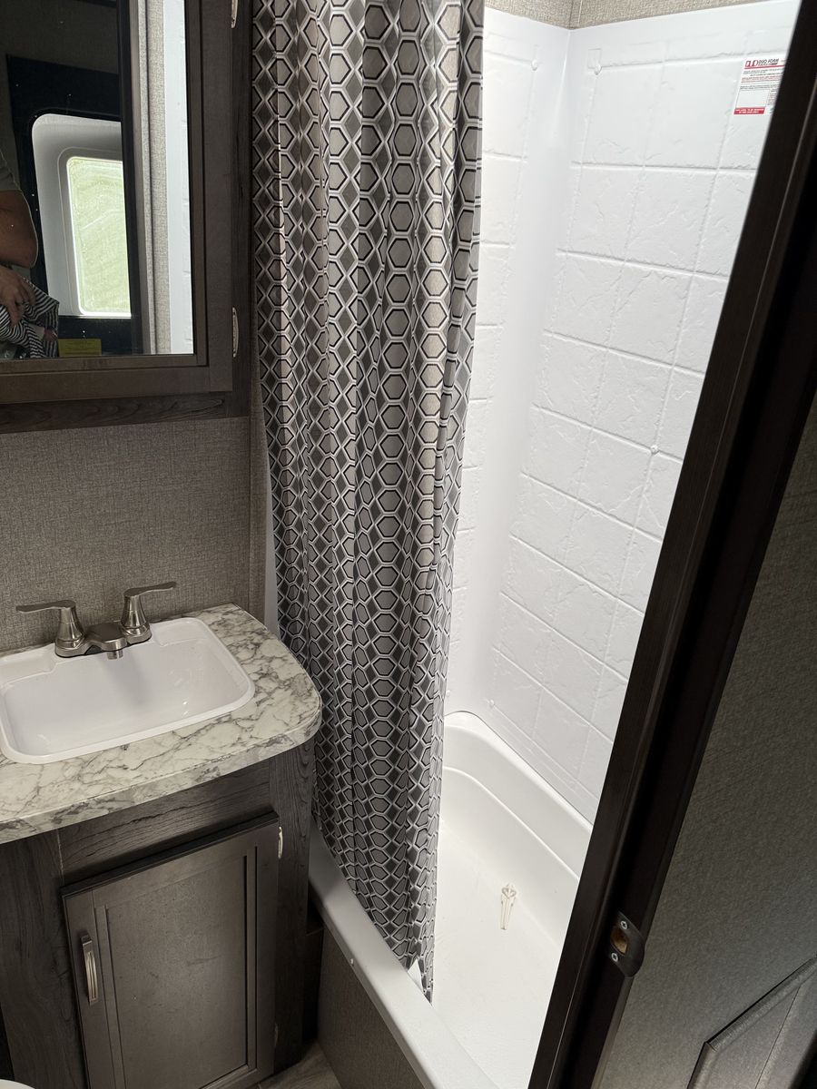 Power awning with LED lights and speakers; outside LP quick connect for a grill; exterior TV mount; outside shower.