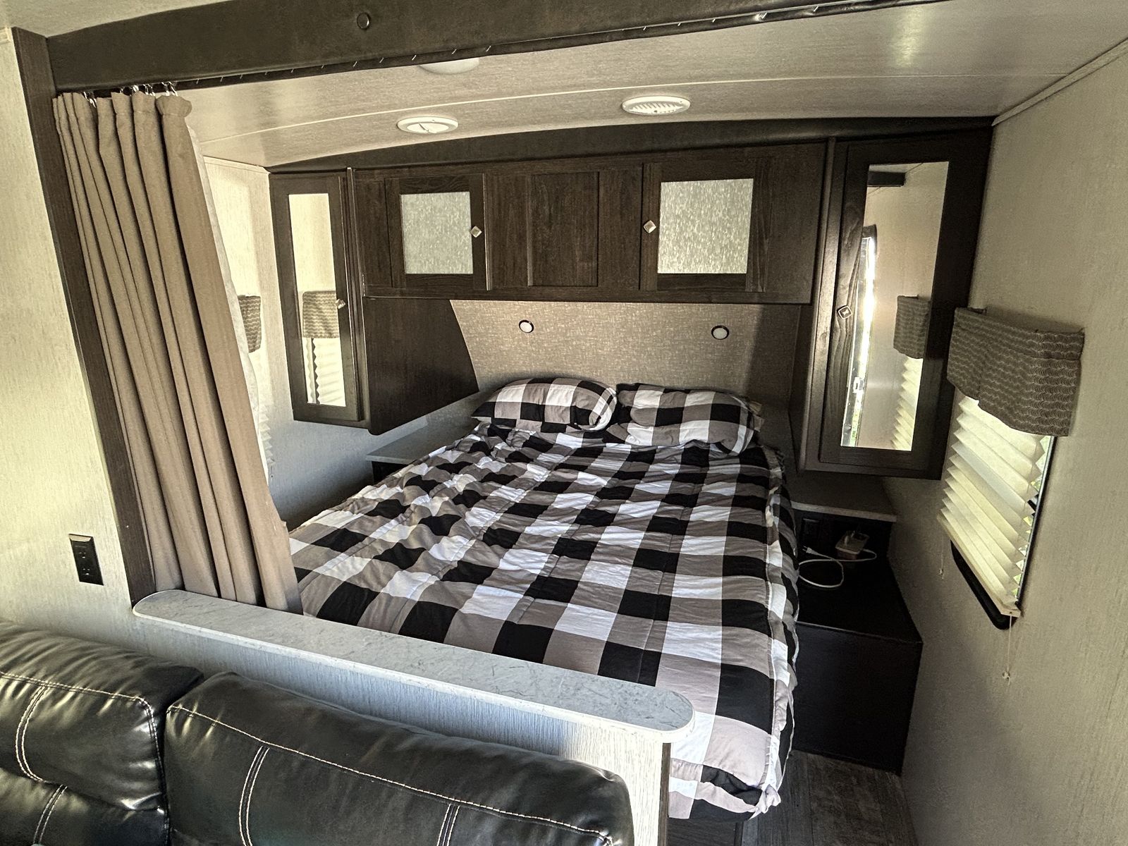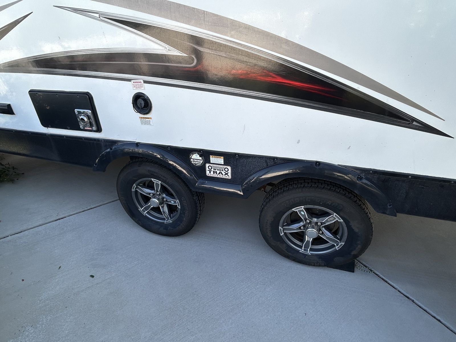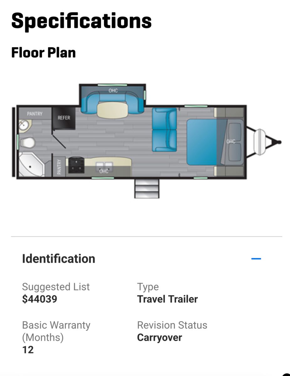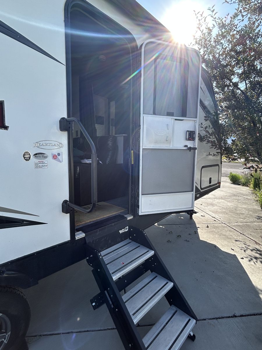Heartland 22 FBS travel trailer. Sleeps up to 6 people. Queen bed, sofa conversion bed, and dinette bed. Large countertop. 2 TVs. Has been an excellent trailer for my family. I am the original owner. I have made a few upgrades, but it is mostly original. Upgrades include: Lithium Ion Batteries, residential mattress (only has about 14 nights of sleep on it) and new tires (have around 1000 miles of use). Total miles on the trailer is around 7000 miles. Dry weight 5500 lbs, max weight 6800 lbs, hitch weight is only 395 lbs dry. The low hitch weight helps to reduce squatting and makes for an easier tow. Wide track axles help it track when towing. This would be a great trailer if towing with an SUV or 1/2 ton truck.