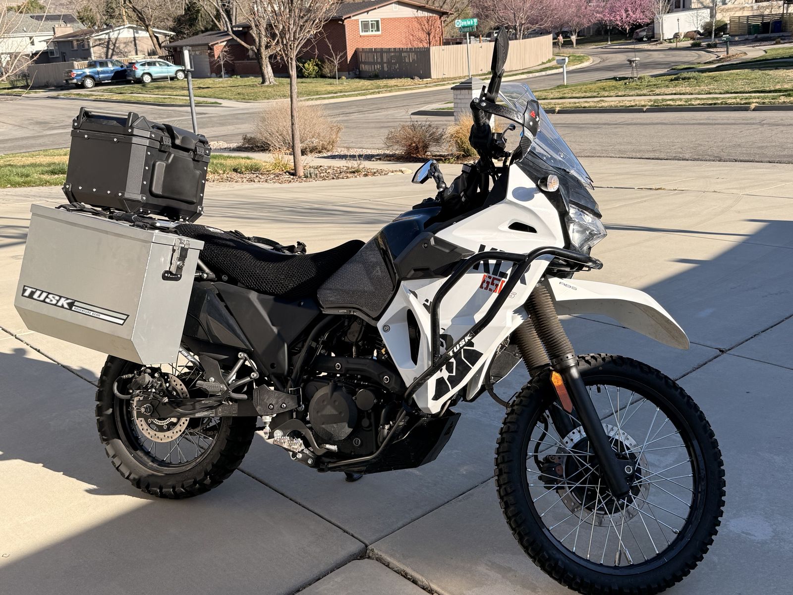 Improvements: Tusk 2Track tires D-Flex Pro Handguards Tusk Aluminum Skid Plate w/ low profile drain nut Tusk Crash Bars and Pannier Racks Tusk shift lever and Foot Pegs Tusk Fender Eliminator Kit USB Charger Thermobob, includes engine temperature gauge (evens engine temp for longer life) Tank stickers (grip) Double Take Mirrors Tusk Olympus pannier bags Wind Rider Seat Cover Top Case Quad lock mount
