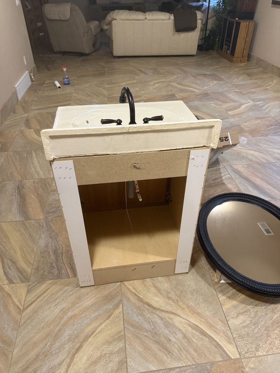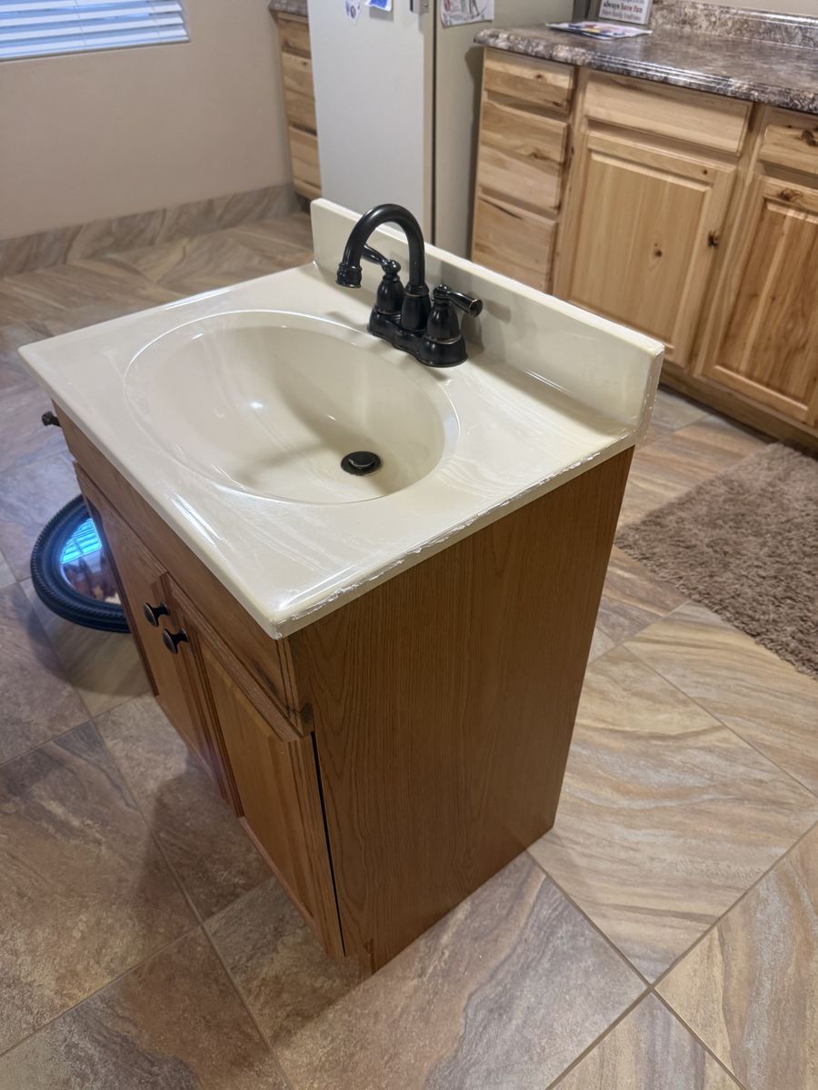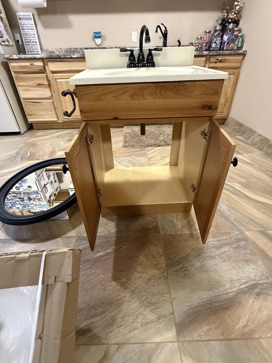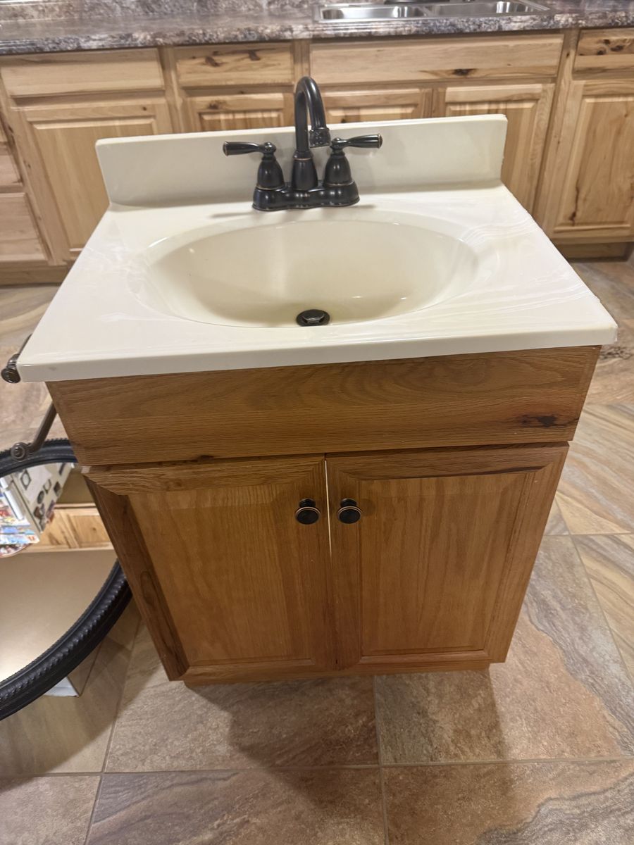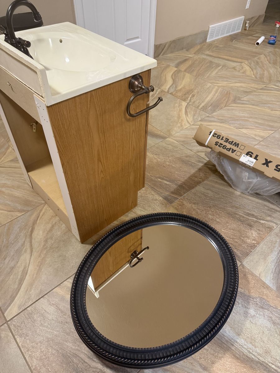 Oak Bathroom Cabinet 24" wide 19" deep 36 1/2" high (the height is including the back splash. Real oak front faux oak sides in very good condition. Upgraded door knobs, with two counter tops. One brand new countertop is (white) and still in the original packaging, and the other is off white as seen on the cabinet. The faucet is a Moen with a swivel spout. The mirror/medicine cabinet is 31" tall by 25 1/2" wide with 2 glass shelves on the inside. The color is matte black with some gold accent. also included is a bronze bath tissue holder in new condition. The photos should serve as to the condition.