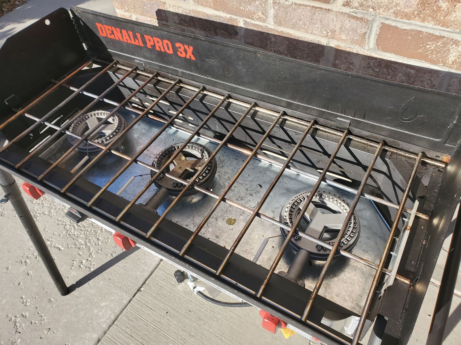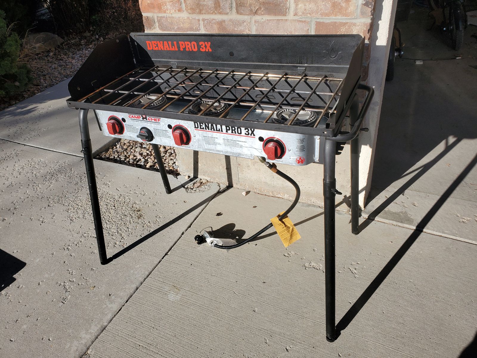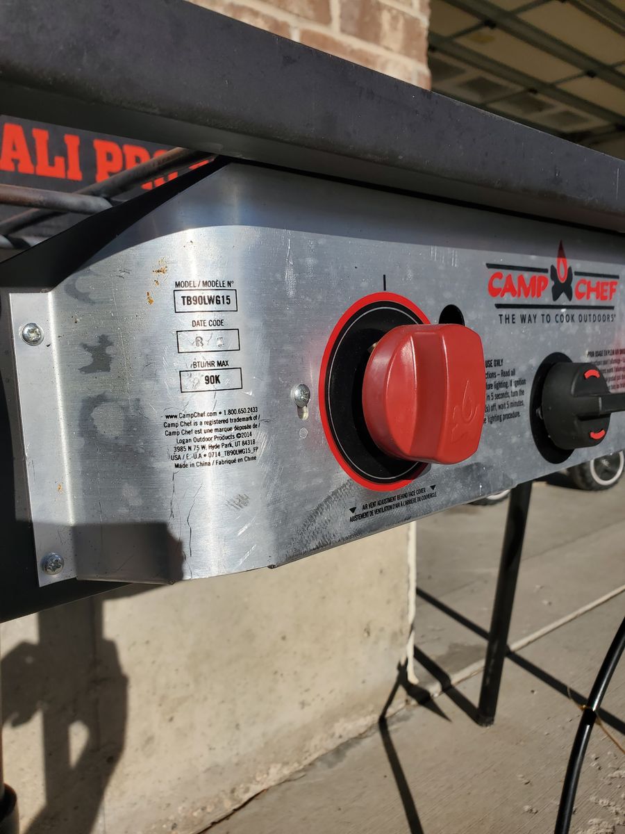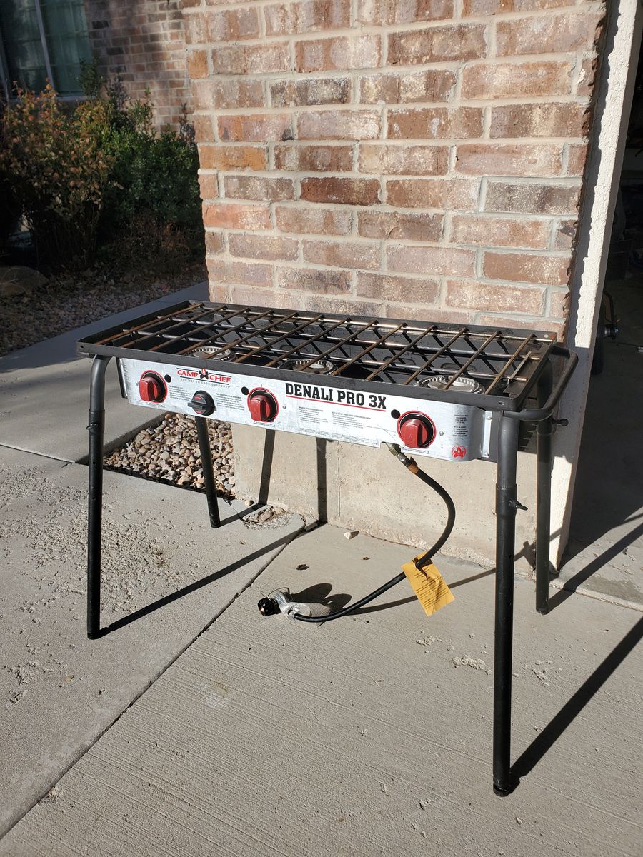 VenmoLuxury 3-burner Camp Chef Denali Pro 3X Camping Stove. In lightly used condition. Functions perfectly. I'm the original and only owner of it and I've owned it probably for about 8 years. Sadly, my hopes to use it were far greater than the number of times we took it camping (we didn't end up camping enough really; only took it on about 4 camping trips). It's relatively clean. Comes with a zipper carrying case (there's a small hole in the case, but the case still functions great), wind guard (I've got photos with and without it attached) and a flat cast iron griddle (my favorite accessory; it's detachable and about 13.5"x17.5" for the cooking area). It also has a convenient place to store the legs for the entire stove (stored underneath as shown in the photo). This camping stove also has feet on the legs that are adjustable for uneven surfaces. Has fully functioning regulator for propane tank, adjustable burner knobs, and an auto-igniter. Max output capacity is 90,000 BTU/h.