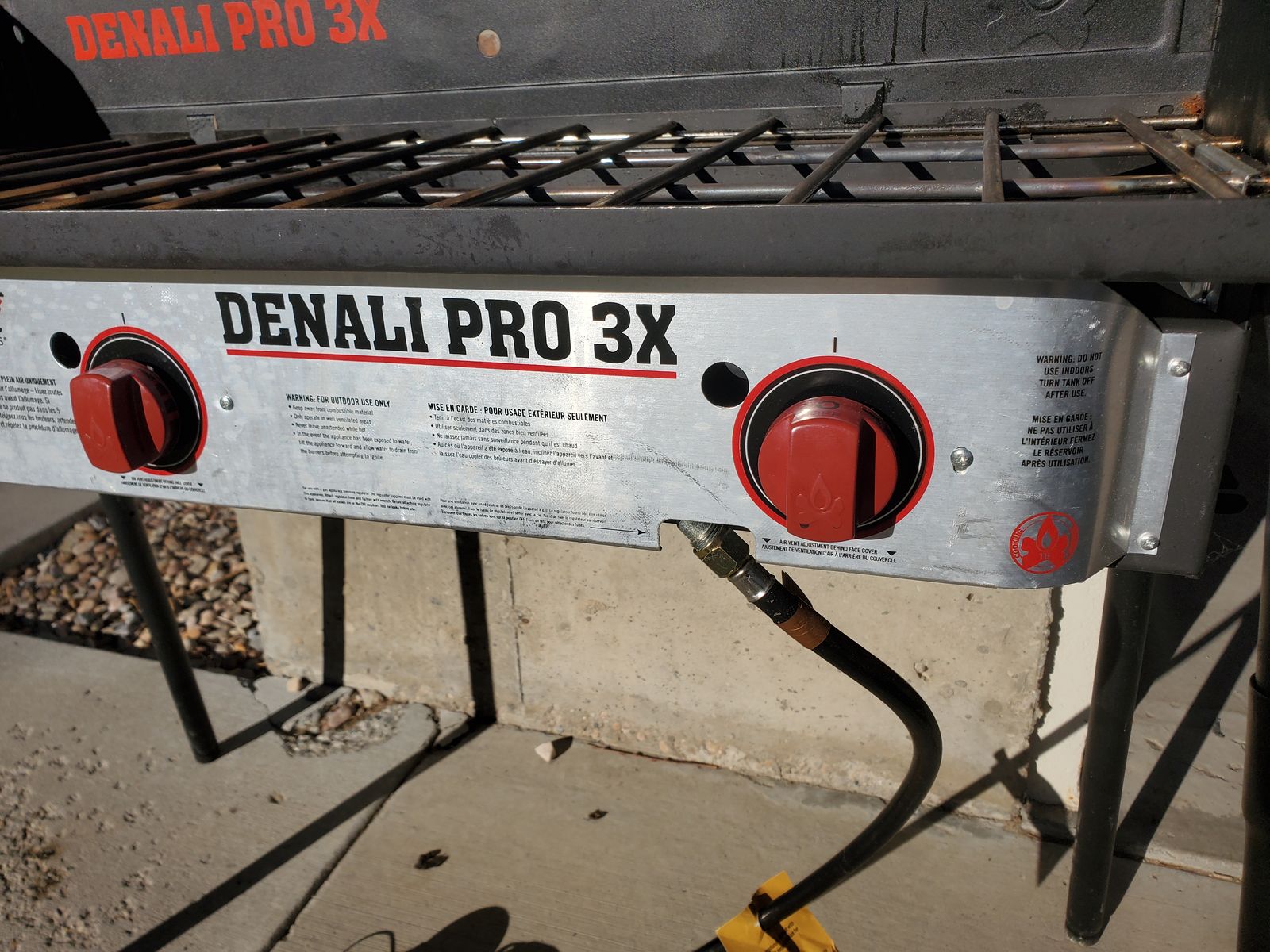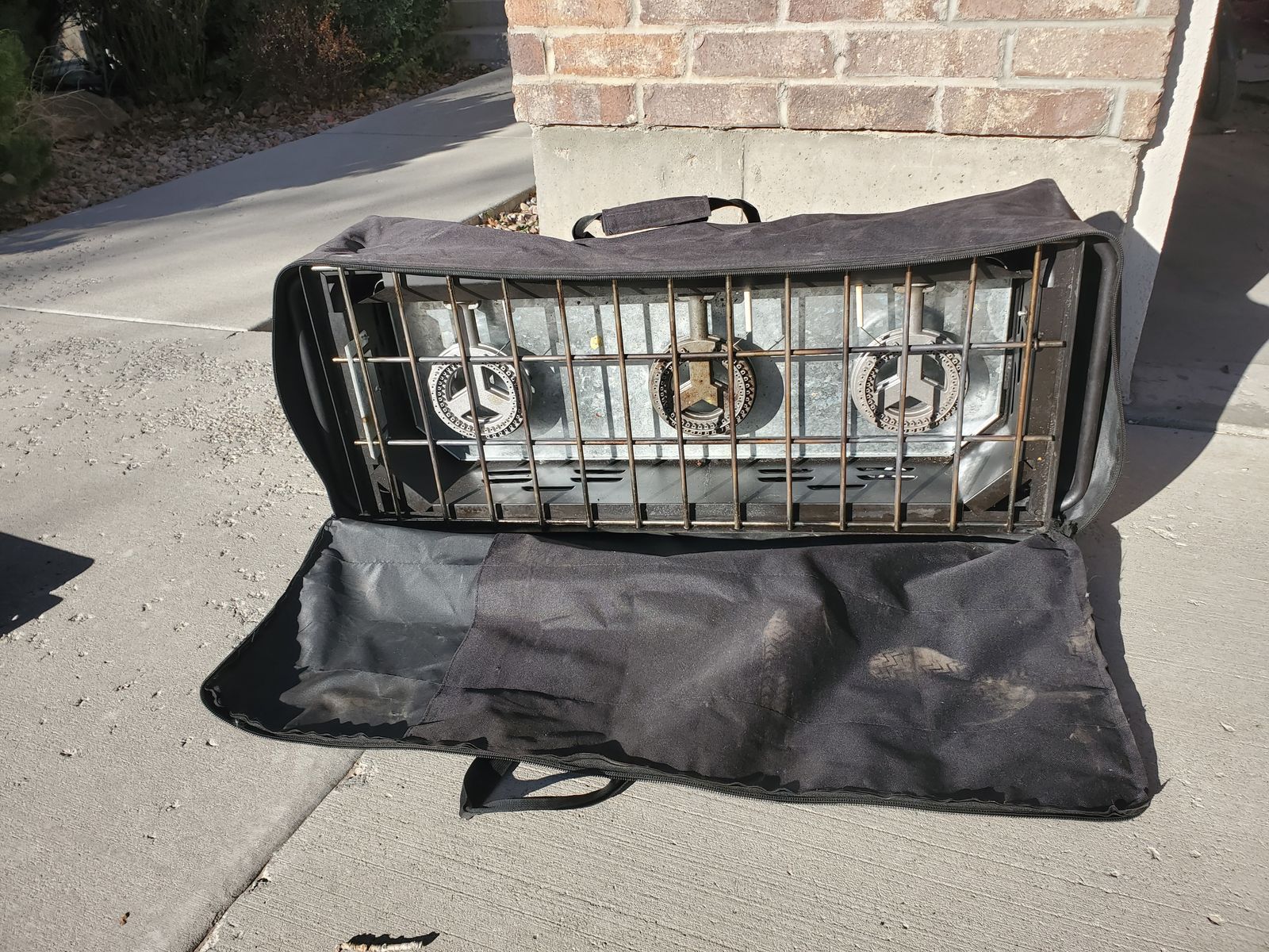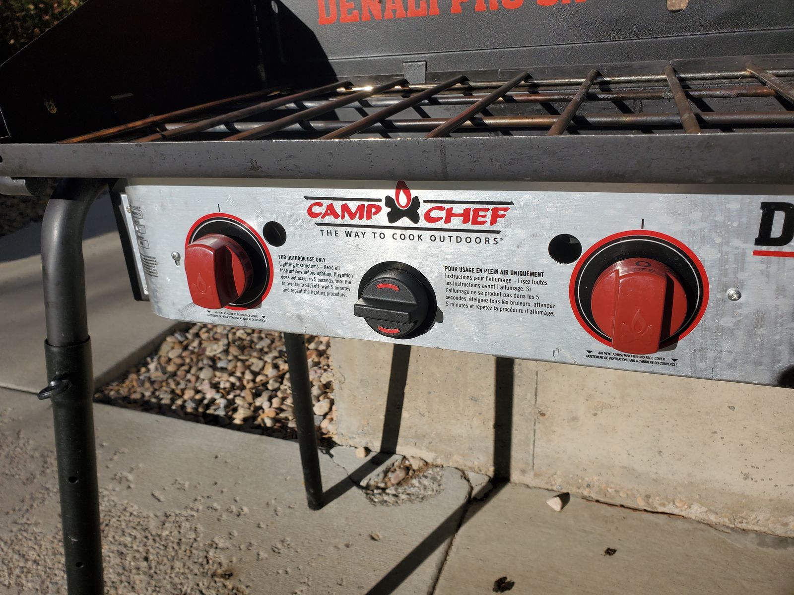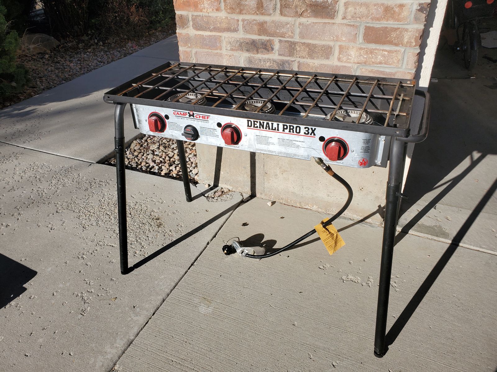 VenmoLuxury 3-burner Camp Chef Denali Pro 3X Camping Stove. In lightly used condition. Functions perfectly. I'm the original and only owner of it and I've owned it probably for about 8 years. Sadly, my hopes to use it were far greater than the number of times we took it camping (we didn't end up camping enough really; only took it on about 4 camping trips). It's relatively clean. Comes with a zipper carrying case (there's a small hole in the case, but the case still functions great), wind guard (I've got photos with and without it attached) and a flat cast iron griddle (my favorite accessory; it's detachable and about 13.5"x17.5" for the cooking area). It also has a convenient place to store the legs for the entire stove (stored underneath as shown in the photo). This camping stove also has feet on the legs that are adjustable for uneven surfaces. Has fully functioning regulator for propane tank, adjustable burner knobs, and an auto-igniter. Max output capacity is 90,000 BTU/h.