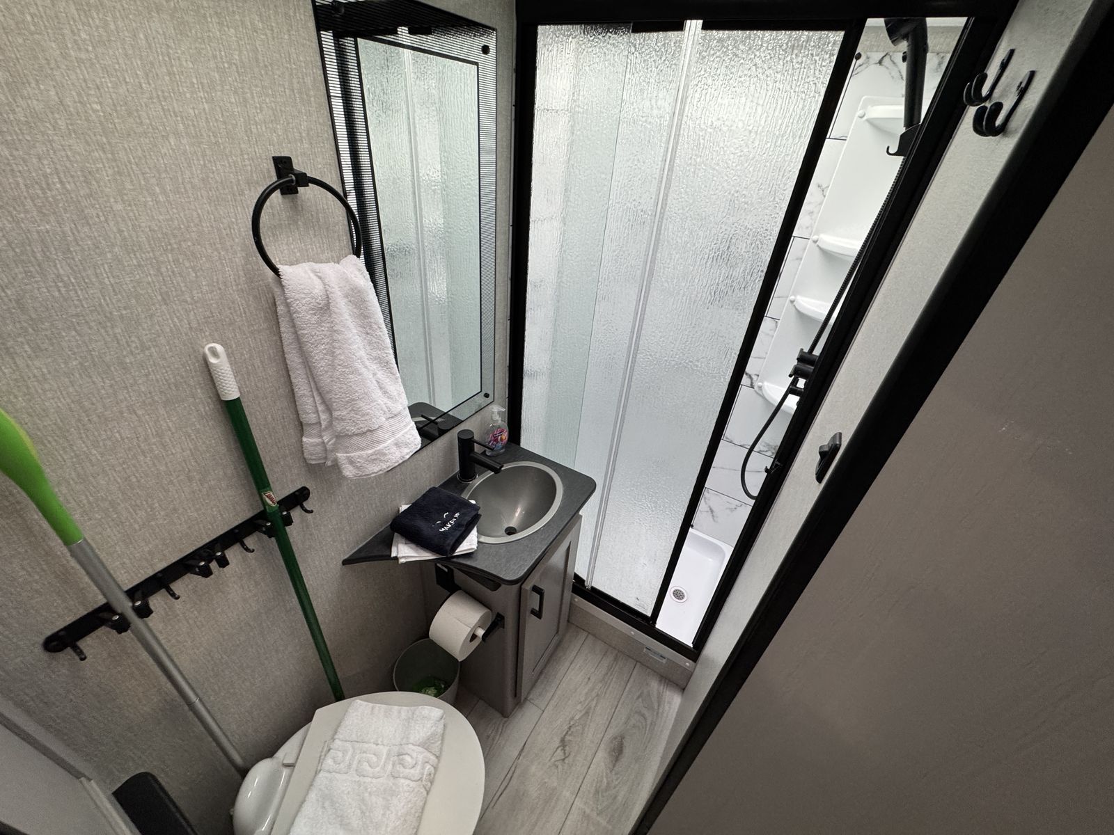 Automatic leveling jacks, huge outdoor awning, onboard generator, and outdoor kitchen for al fresco dining.