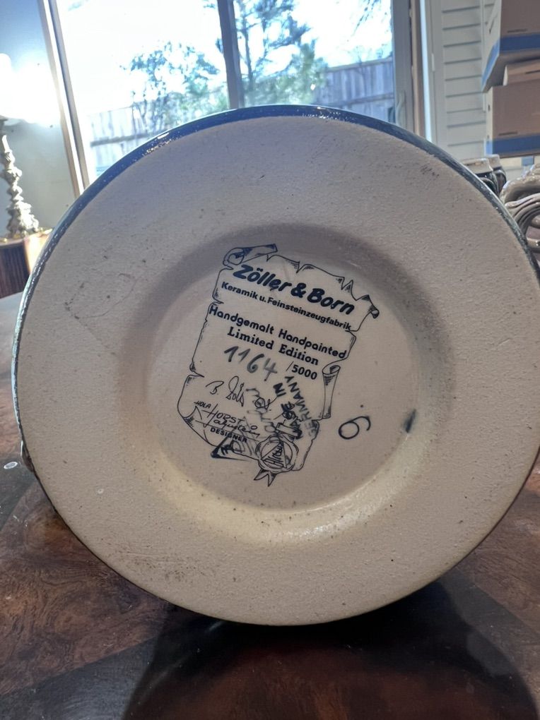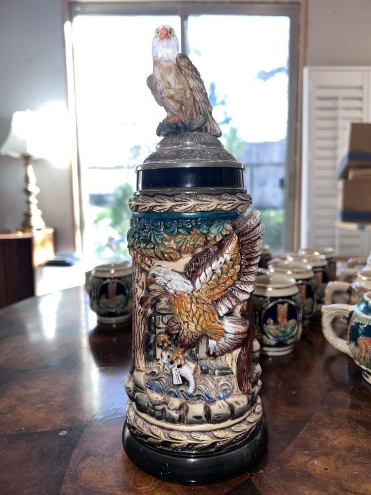 VenmoStunning Zöller & Born limited edition beer stein featuring a detailed 3D bald eagle on a pewter lid over a richly hand-painted relief scene of a wilderness/forest landscape with rocky cliffs and autumn foliage. ∙ Maker: Zöller & Born (Keramik u. Feinsteinzeugfabrik, est. 1956) ∙ Limited Edition #1164 of only 5000 ∙ Marked: Handgemalt / Handpainted ∙ Designer: Horst Jaguglein (signed on base) ∙ Pewter lid with figural bald eagle finial ∙ Condition: No chips or cracks ∙ Made in Germany Local pickup available near WinCo in Layton, UT