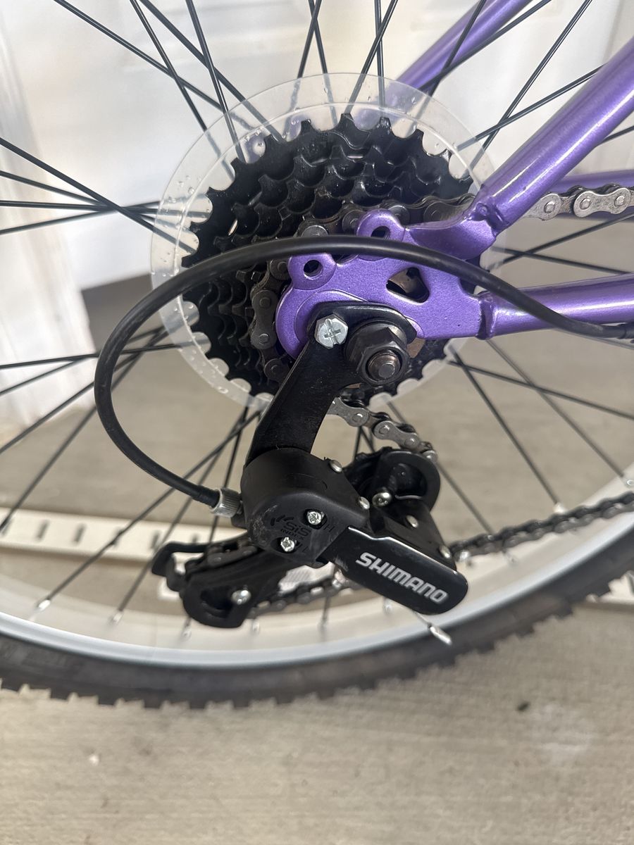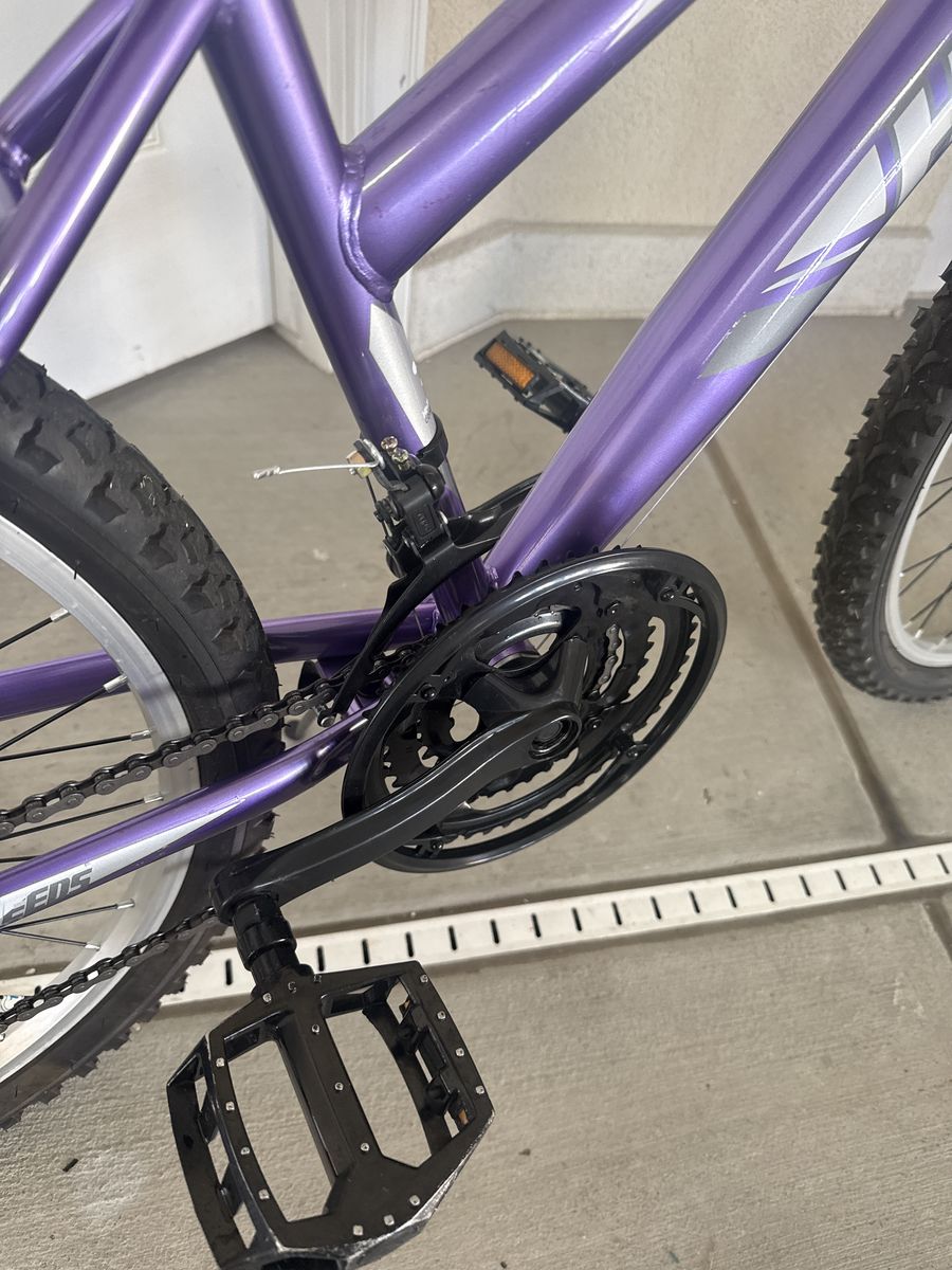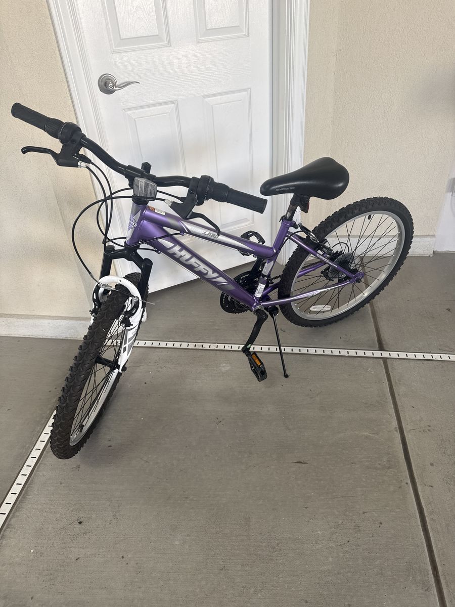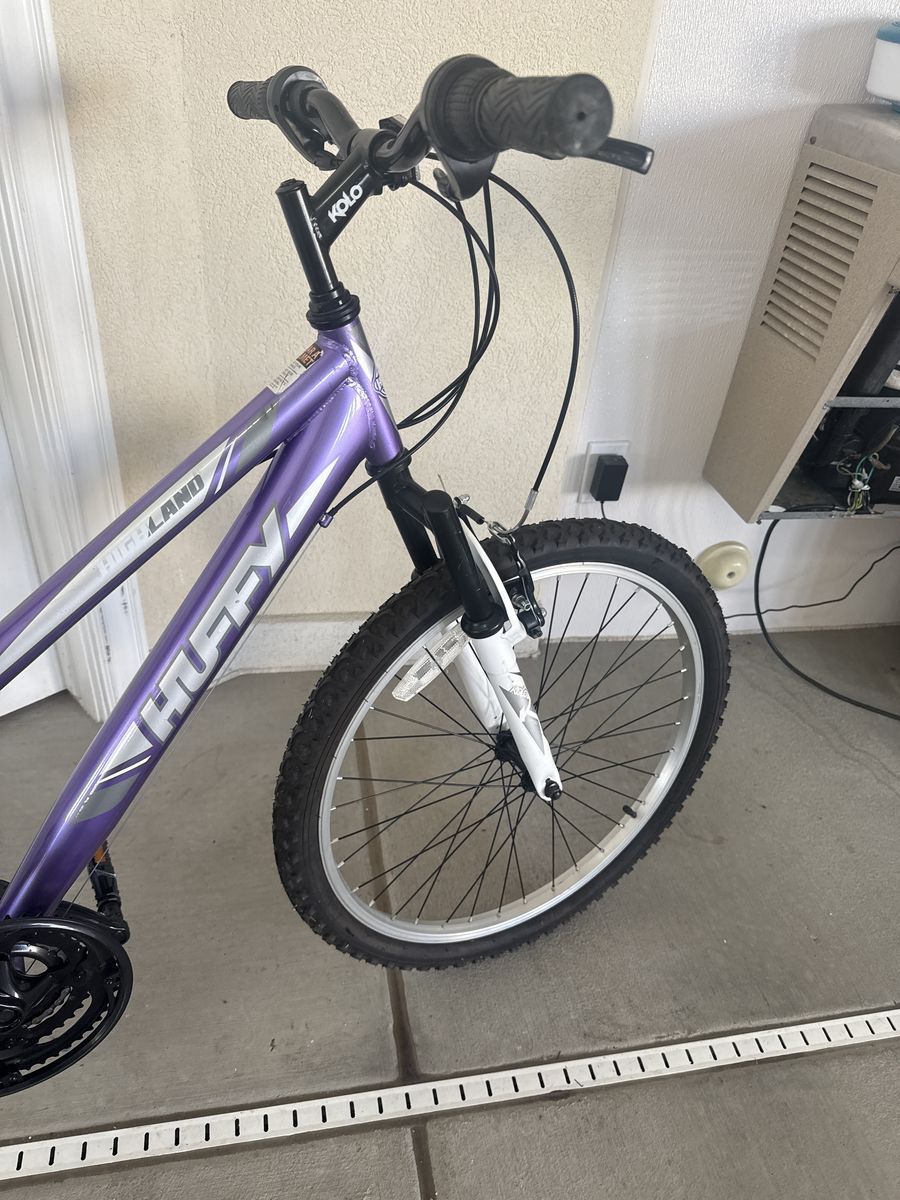 Huffy “Highlander” 24 inch mountain bike. 21 speed with 7 rear gears and 3 front or crank gears. Tires hold air and have great tread. Wheels are true and spin freely. Shifting is smooth with Shimano derailers front and crank. Hard tail with front fork suspension. This bike is in great shape and ready for summertime fun!!!!