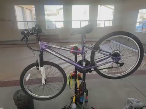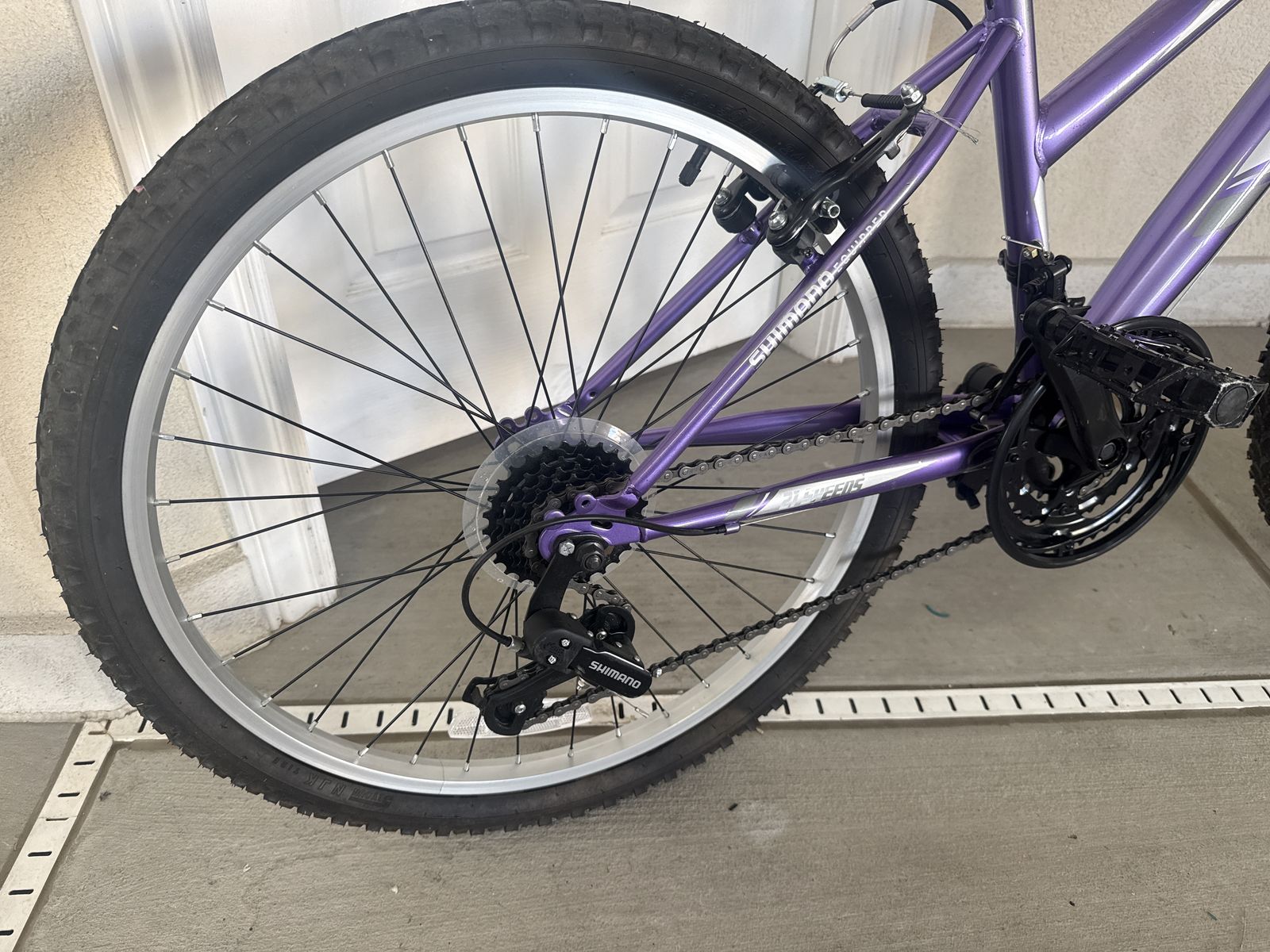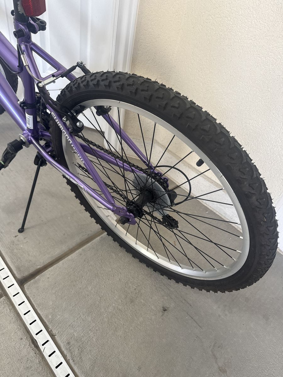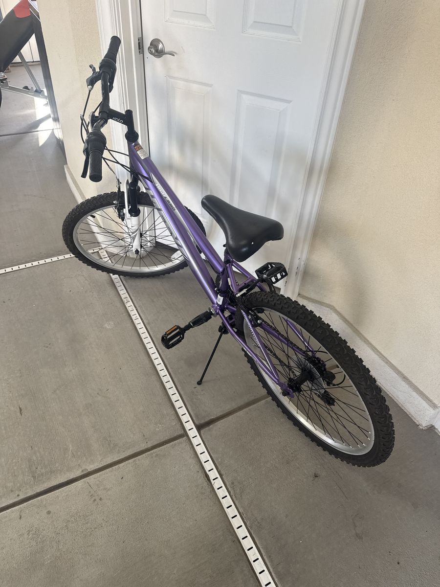 Huffy “Highlander” 24 inch mountain bike. 21 speed with 7 rear gears and 3 front or crank gears. Tires hold air and have great tread. Wheels are true and spin freely. Shifting is smooth with Shimano derailers front and crank. Hard tail with front fork suspension. This bike is in great shape and ready for summertime fun!!!!