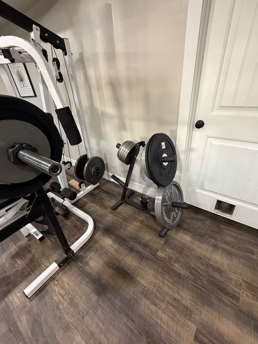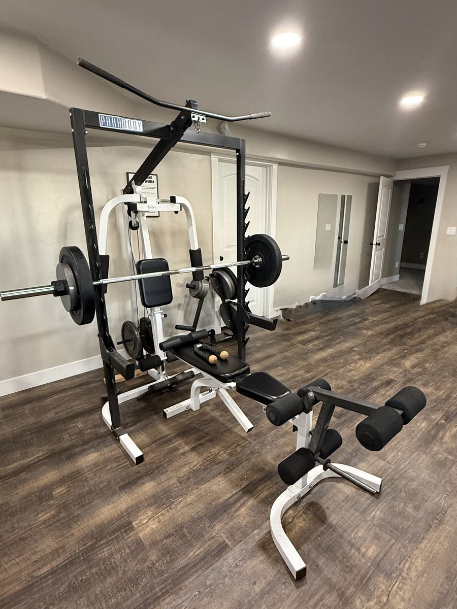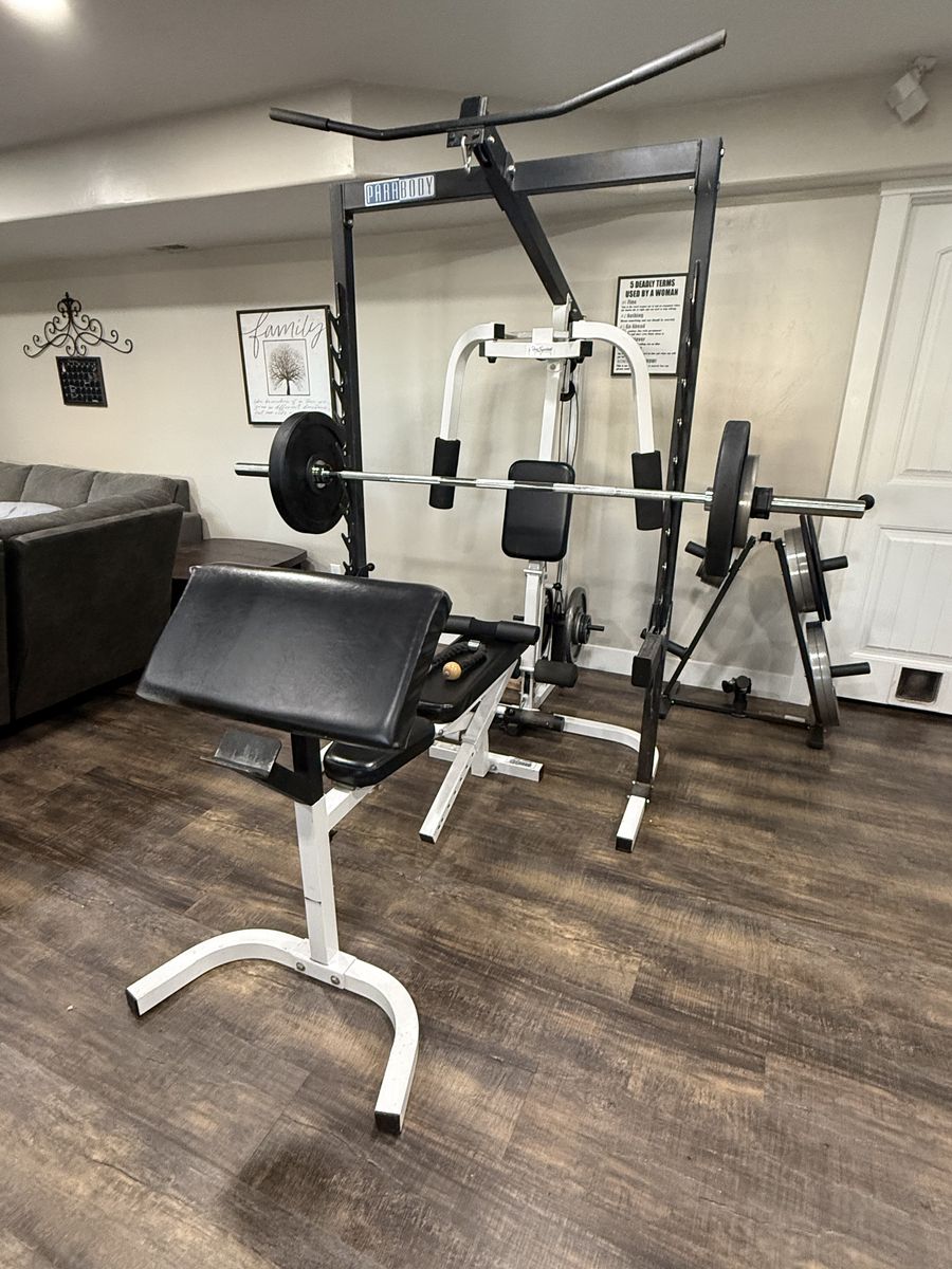 VenmoSelling this great squat rack and weight bench with 375 pounds of free weights, 45lb Olympic bar, and a plate rack. Weights included are: 2 - 45lb steel plates 2 - 45lb bumper plates 2 - 35lb steel plates 2 - 25lb steel plates 2 - 10lb bumper plates 4 - 10lb steel plates 2 - 5lb steel plates 3 - 2 1/2lb steel plates