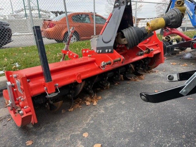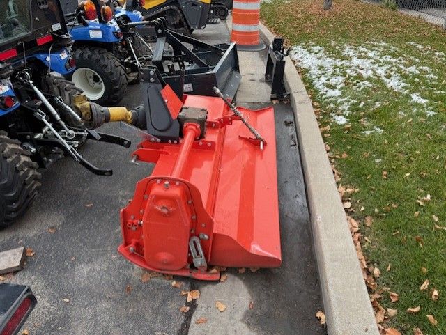 EQUIPMENT FEATURES: Working Width: 59” (62” overall) Fits Tractors: 15–30 HP 3-Point Hitch: Category 1 540 RPM PTO Driven (1-3/8” 6-spline) Adjustable Tilling Depth: 2”–5” 32 L-Shaped Tines (8 flanges) for aggressive tilling Forward Rotation for optimal soil prep Heavy-Duty Chain Drive (Oil Bath, Auto-Adjusting) Adjustable Rear Deflector for finish control