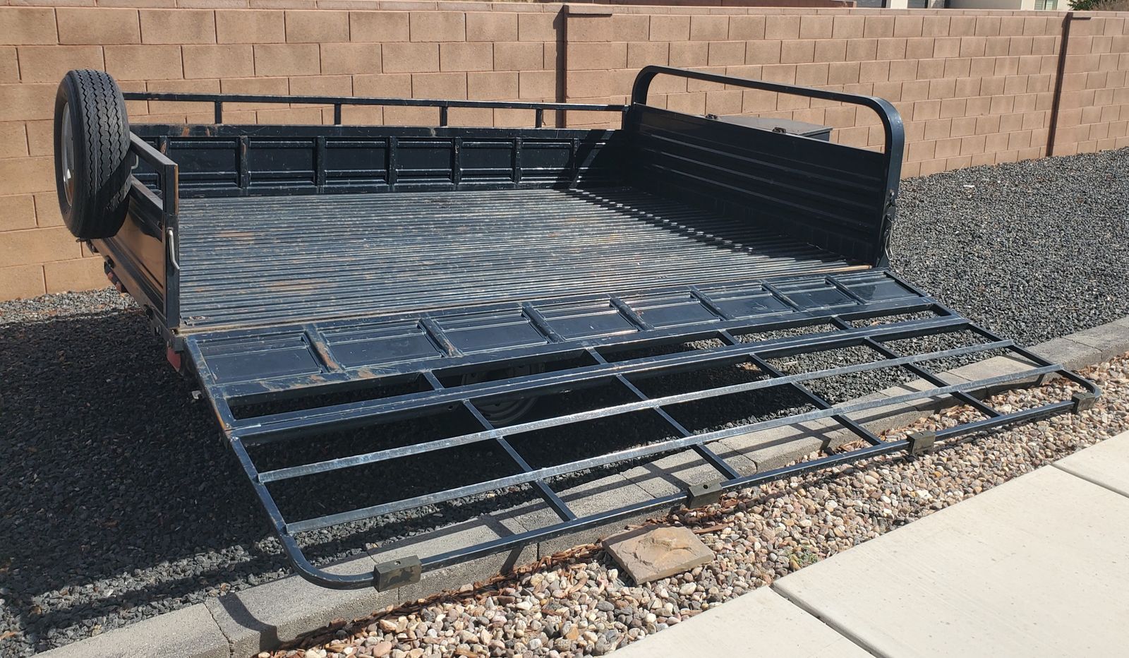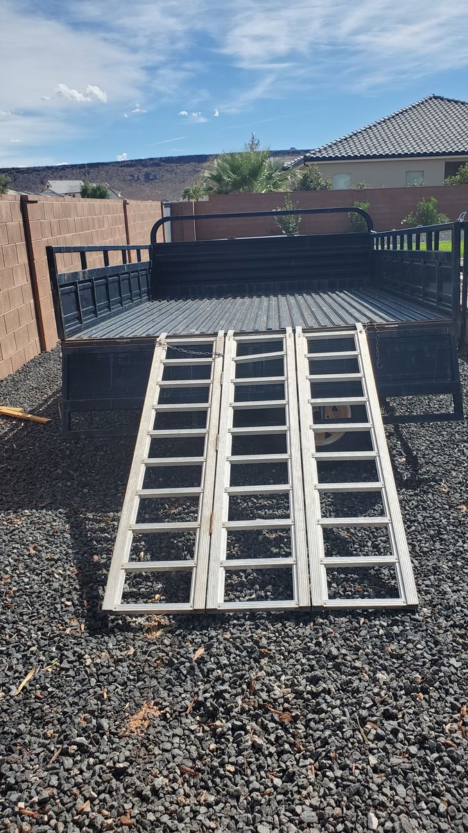 Size - Bed is 7' x 10'. Overall is 7'4'' x 15' Comes with aluminum trifold ramp for loading in rear.